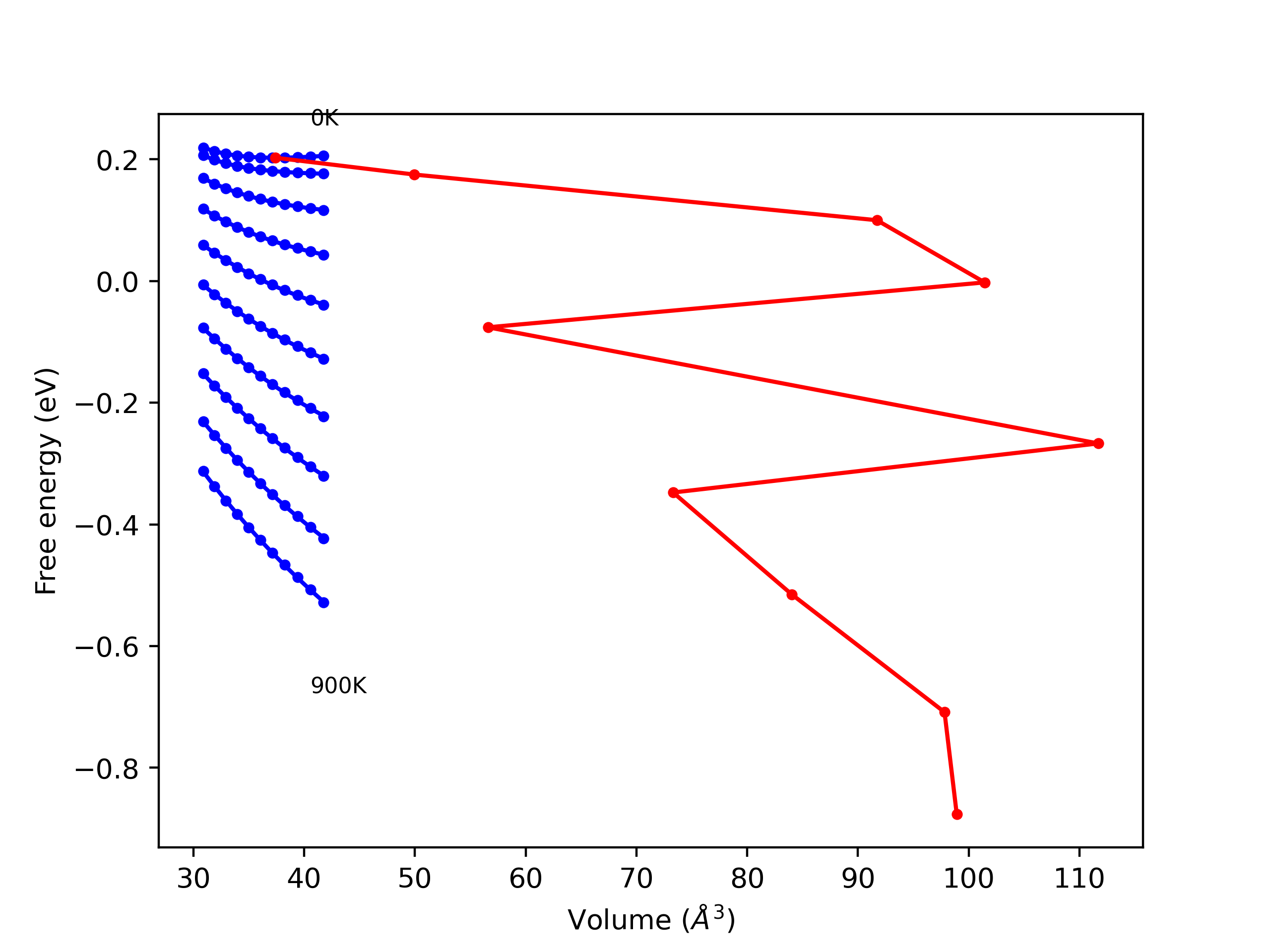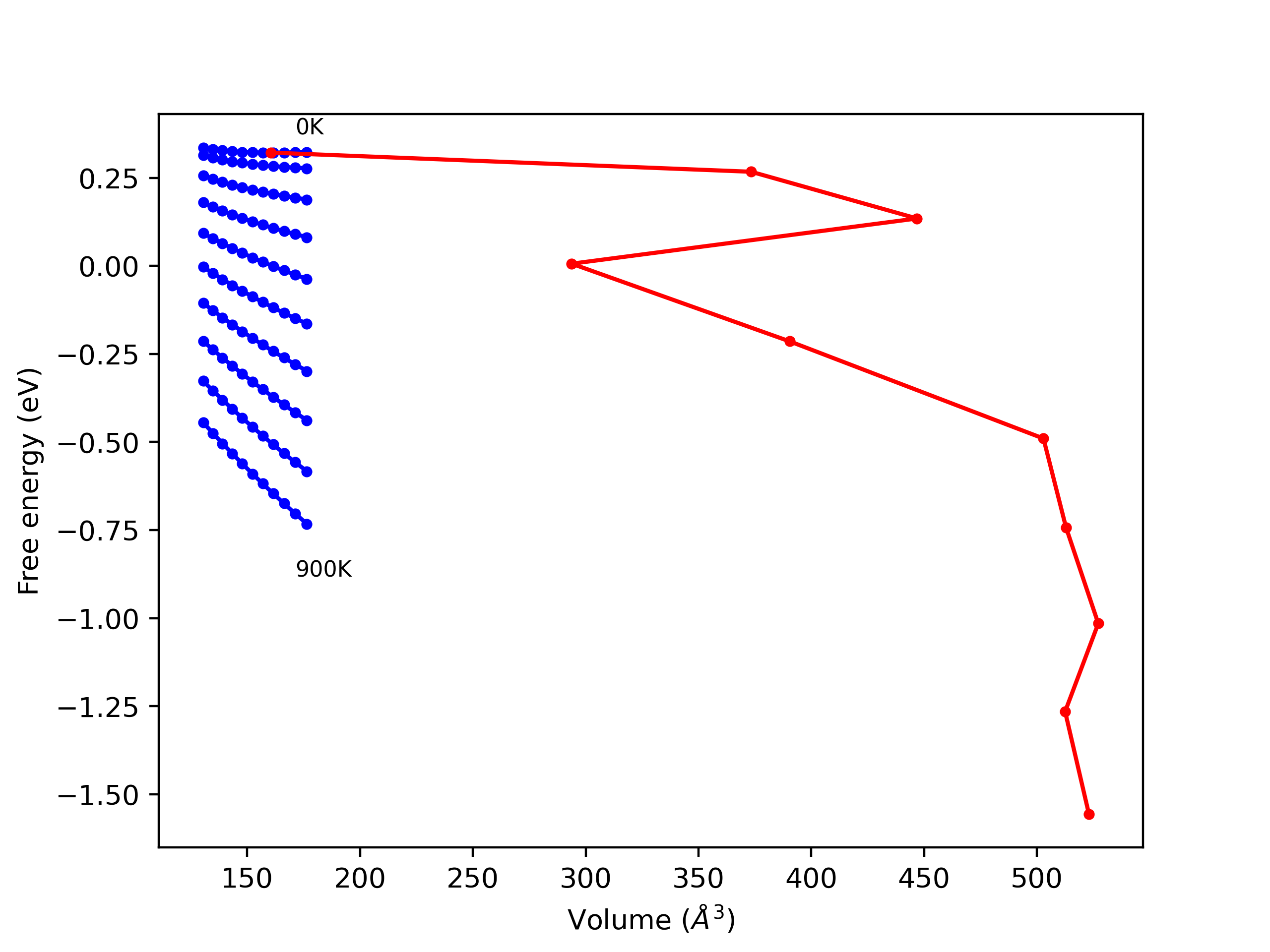 Plots of internal energy, Gibbs free energy, entropy, heat capacity and volume are shown here as a function of temperature for various crystal structures and liquid phases. The included crystal structures correspond to those in the Solid Structures vs. Temperature section, and the liquid phases to those in the Liquid Properties section. Internal energy and volume are taken from the associated structure relaxations mentioned in those previous sections. Constant pressure heat capacity is estimated using 3-point numerical derivatives of enthalpy versus temperature. Note that since all simulations done here are at 0 pressure, internal energy and enthalpy are equivalent.