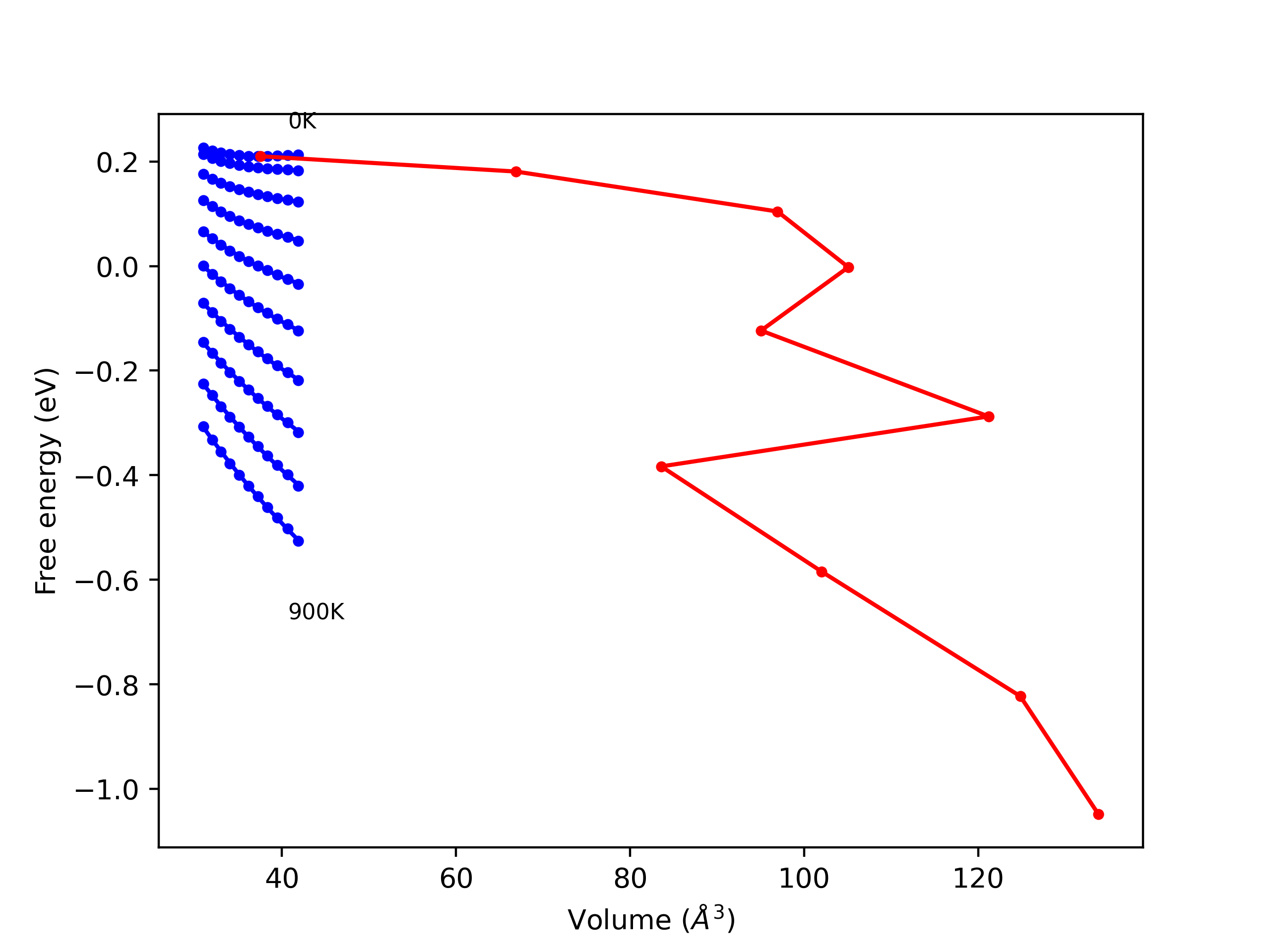 Plots of internal energy, Gibbs free energy, entropy, heat capacity and volume are shown here as a function of temperature for various crystal structures and liquid phases. The included crystal structures correspond to those in the Solid Structures vs. Temperature section, and the liquid phases to those in the Liquid Properties section. Internal energy and volume are taken from the associated structure relaxations mentioned in those previous sections. Constant pressure heat capacity is estimated using 3-point numerical derivatives of enthalpy versus temperature. Note that since all simulations done here are at 0 pressure, internal energy and enthalpy are equivalent.