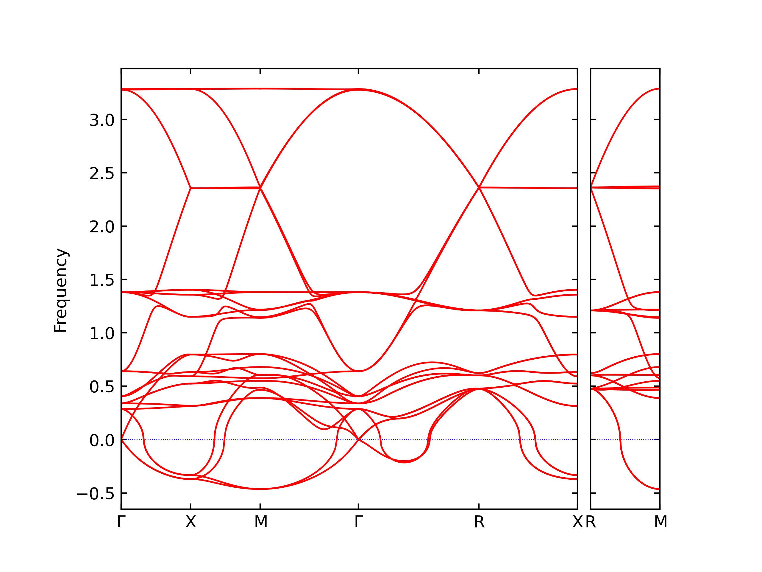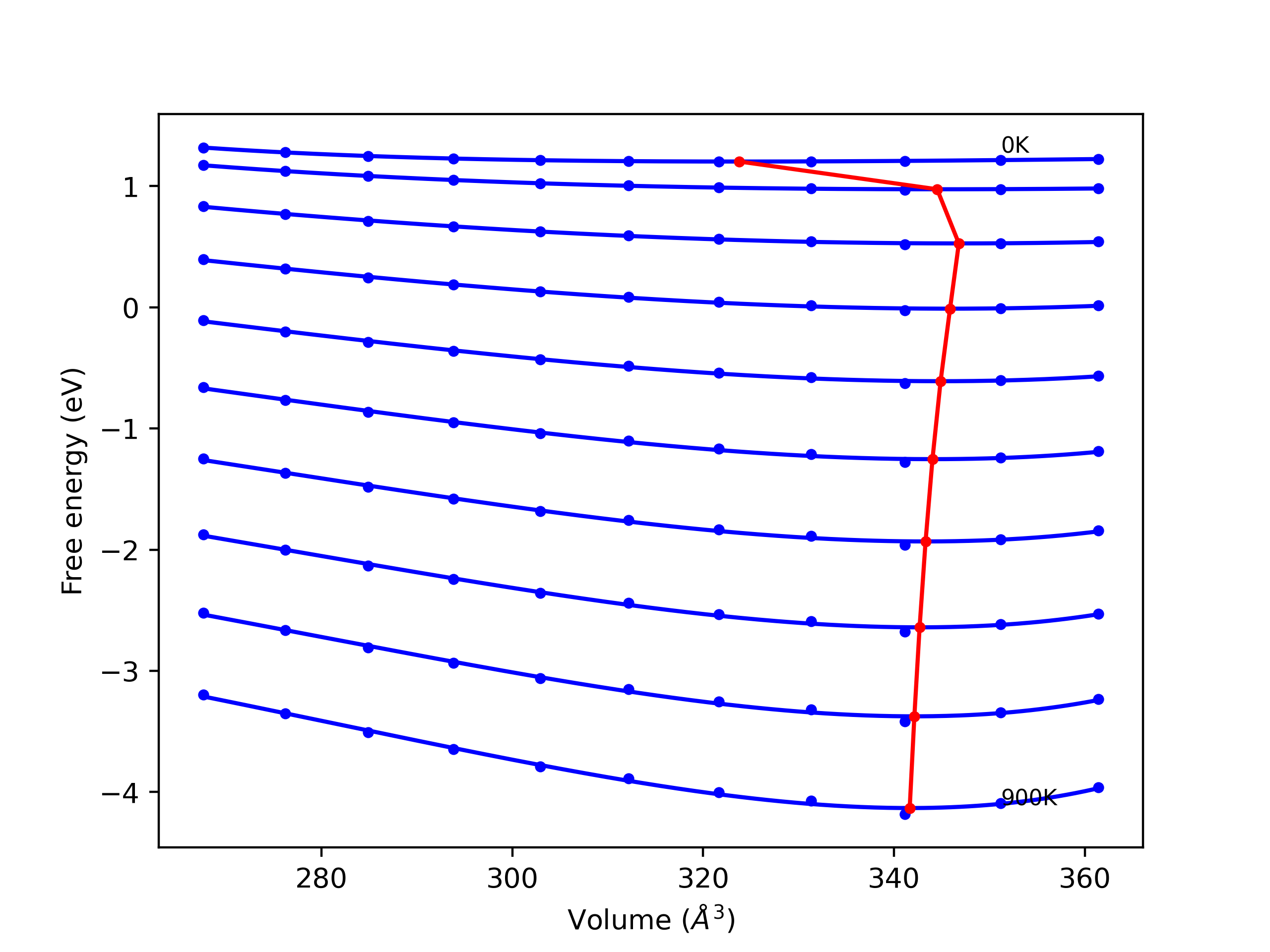 Phonon band structures and crystal properties estimated from quasi-harmonic approximation (QHA) calculations are displayed for select crystals. The calculations were performed using phonopy and LAMMPS. For the phonon calculations, 3x3 supercells of the potential-specific relaxed crystals were used. The QHA calculations were based on 11 strain states ranging from -0.05 to 0.05.