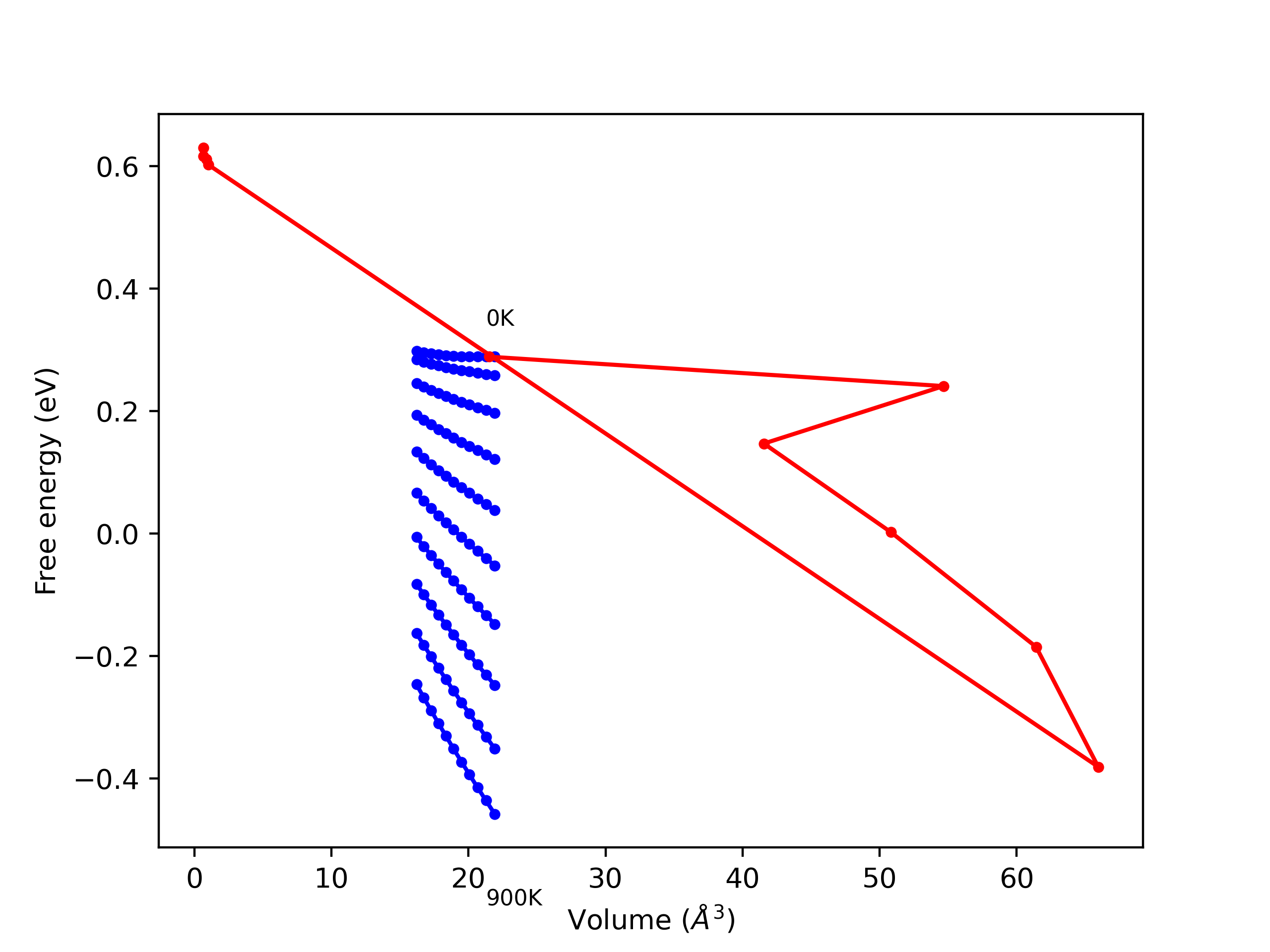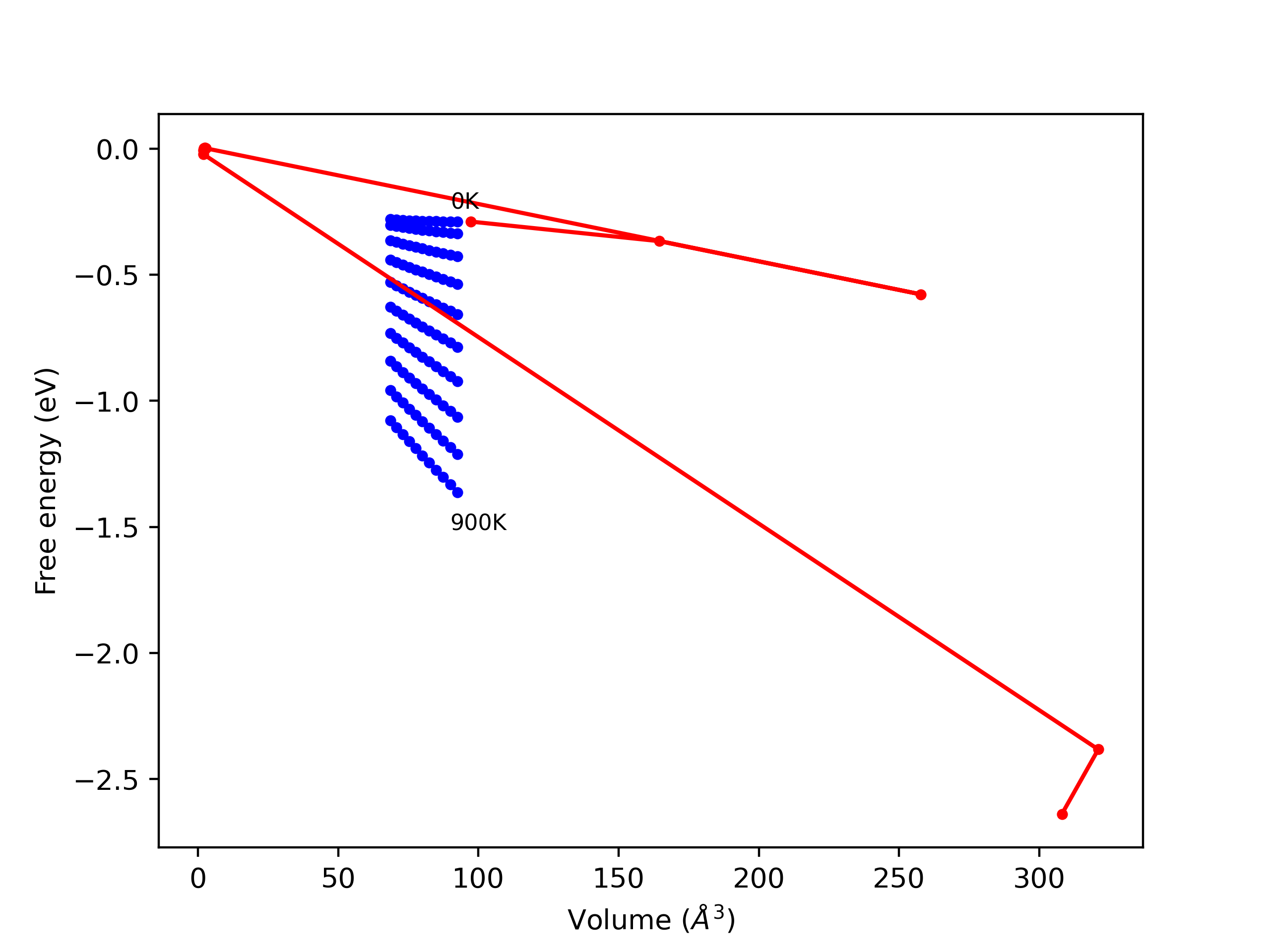 Plots of lattice and elastic constants are shown as a function of temperature. The 0K points were taken from the Crystal Structure Predictions and the Elastic Constants Predictions sections above for the unique crystal structures relaxed with the "dynamic" method. Starting from the 0 K relaxed crystal unit cells, supercell systems are created by replicating all three dimensions by the same multiplier to achieve at least 4000 atoms. The systems are then relaxed at 50 K and zero pressure using 1 million NPT steps. Lattice constants are estimated by averaging the measured box dimensions. Temperatures are iteratively increased by 50 K, with each subsequent relaxation calculation starting from the final atomic configuration at the previous temperature and relaxing for another 1 million steps.