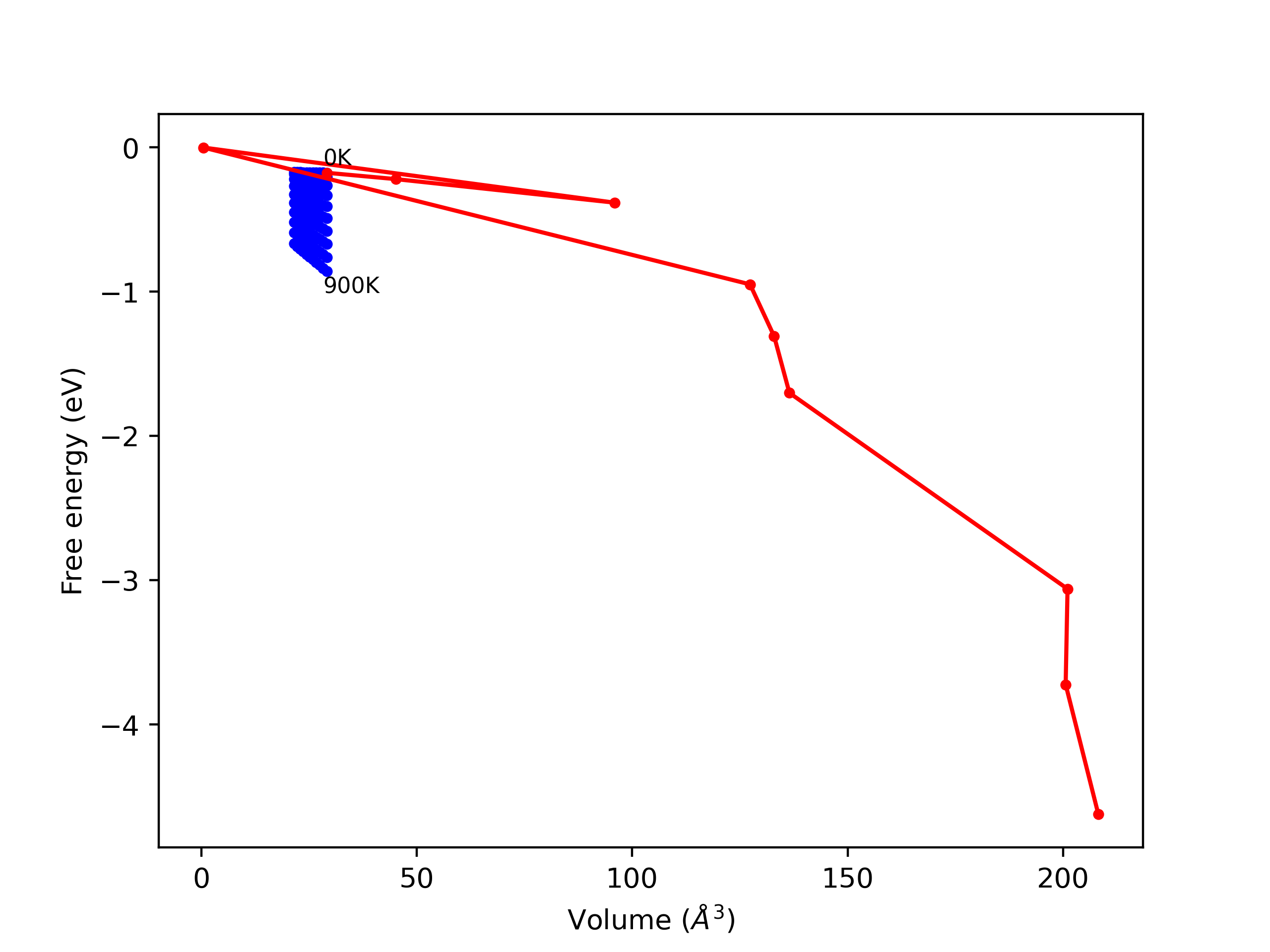 The Gibbs energies of the phases are estimated using thermodynamic integration between the interatomic potential in question and a simpler model with known Gibbs free energy values. For solids, the reference model is an Einstein solid, while for liquids it is the Uhlenbeck-Ford potential. Besides a short run at the start of the solid calculations to estimate Einstein model spring constants, the two calculations proceed similarly. Starting with the final relaxation configurations, the systems are stabilized for 25,000 steps. Then, over the next 50,000 steps the potential is swapped out for the reference potential. The system is then stabilized for another 25,000 steps with the reference model before a reverse swap of 50,000 steps is performed. The simulation ends with one final 25,000 step stabilization period. From the simulation, the irreversible work of transformation is estimated and used to compute the absolute Gibbs free energy of the target phase and potential relative to the reference potential. Entropy is estimated as the difference in enthalpy and Gibbs free energy and divided by temperature.