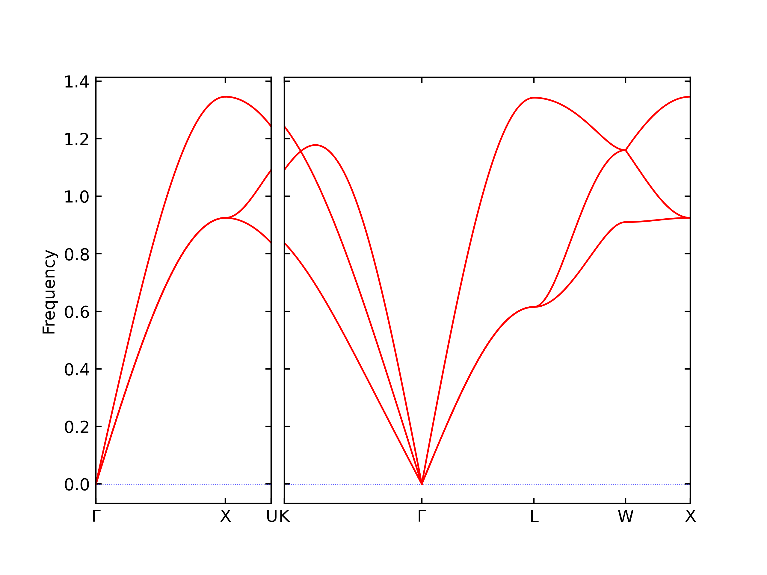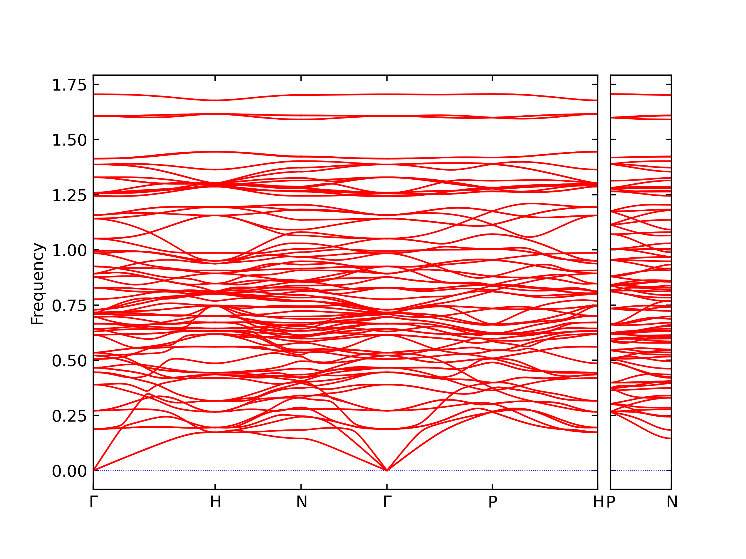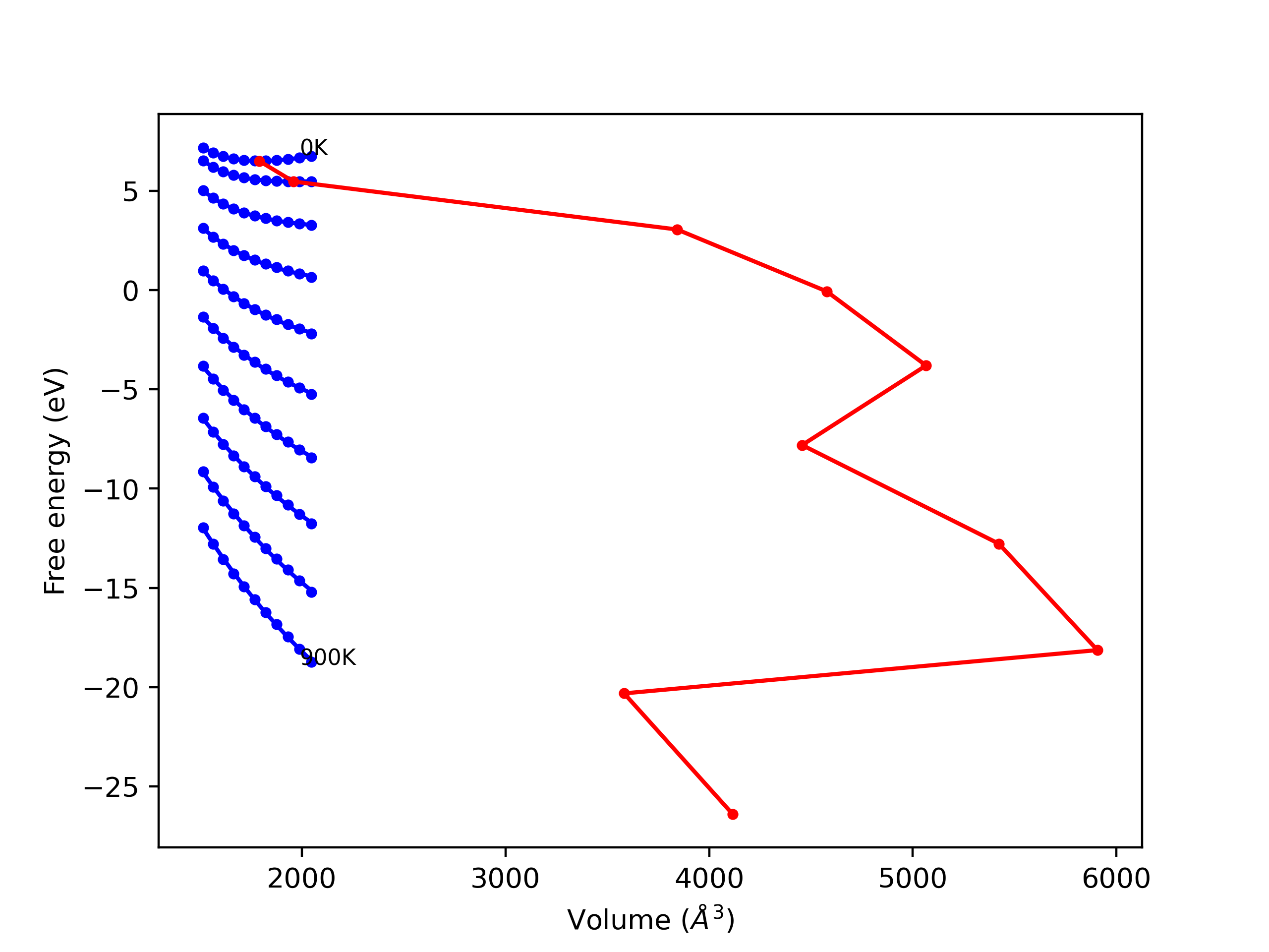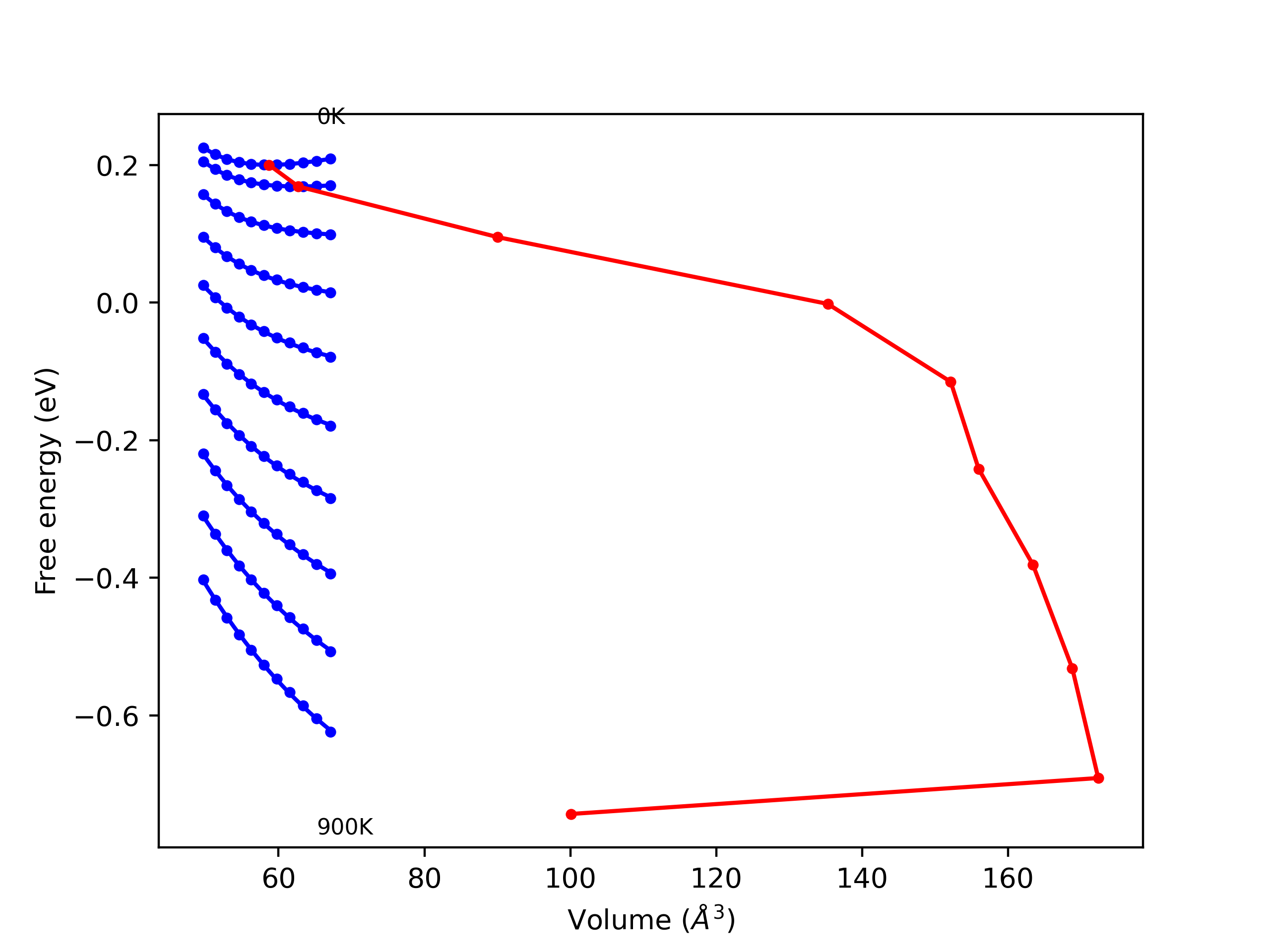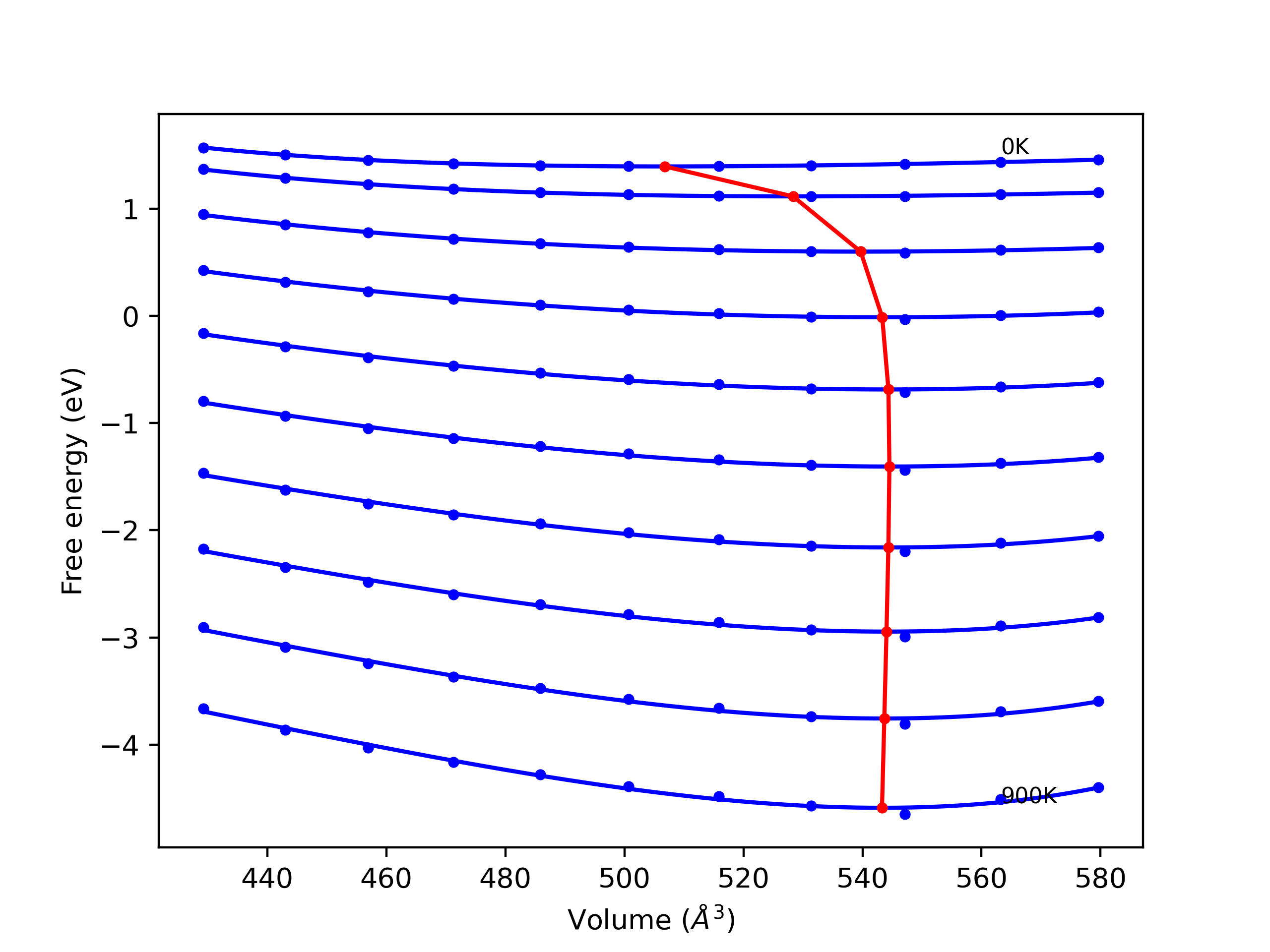 Phonon band structures and crystal properties estimated from quasi-harmonic approximation (QHA) calculations are displayed for select crystals. The calculations were performed using phonopy and LAMMPS. For the phonon calculations, 3x3 supercells of the potential-specific relaxed crystals were used. The QHA calculations were based on 11 strain states ranging from -0.05 to 0.05.