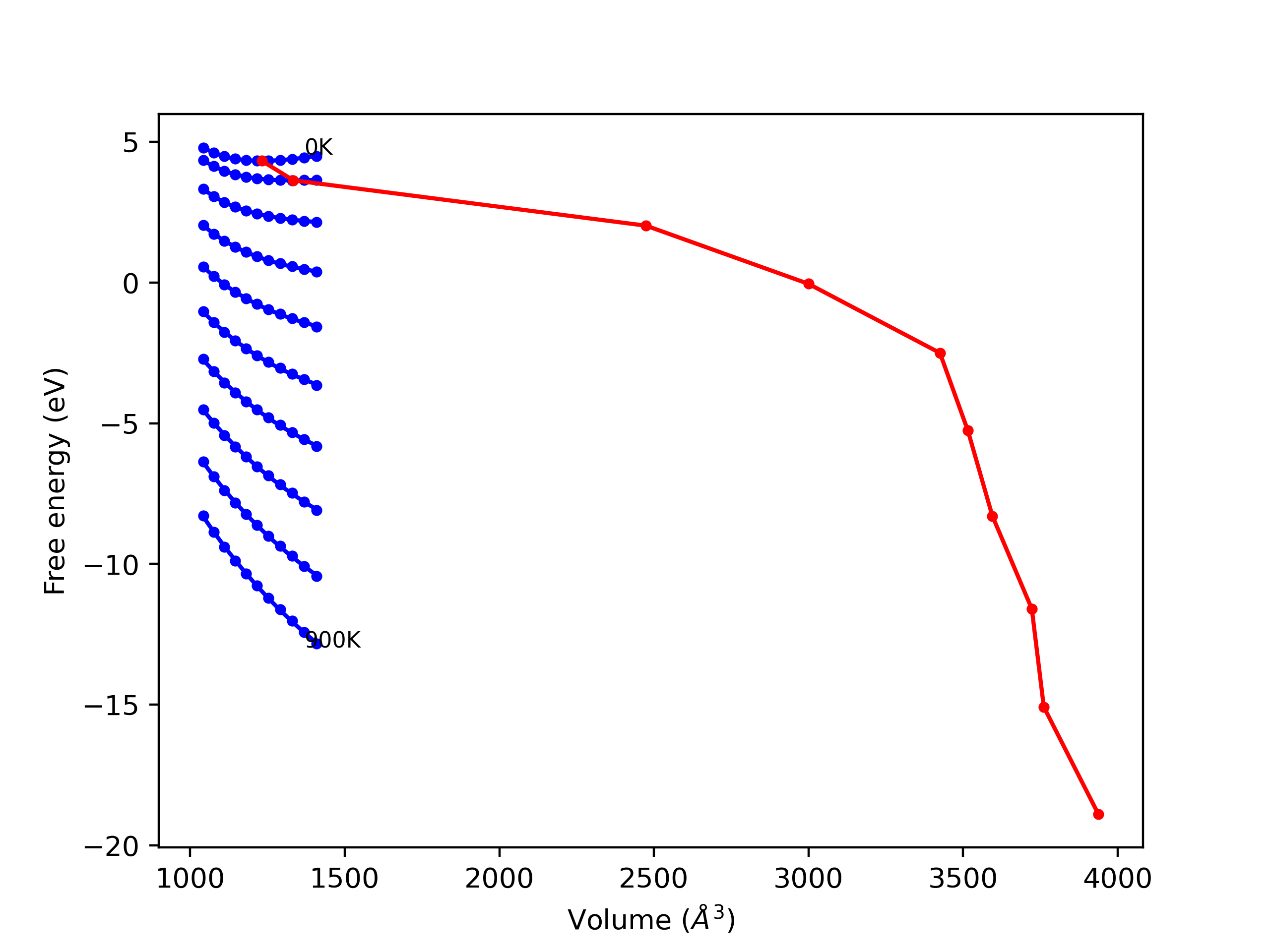 Plots of internal energy, Gibbs free energy, entropy, heat capacity and volume are shown here as a function of temperature for various crystal structures and liquid phases. The included crystal structures correspond to those in the Solid Structures vs. Temperature section, and the liquid phases to those in the Liquid Properties section. Internal energy and volume are taken from the associated structure relaxations mentioned in those previous sections. Constant pressure heat capacity is estimated using 3-point numerical derivatives of enthalpy versus temperature. Note that since all simulations done here are at 0 pressure, internal energy and enthalpy are equivalent.