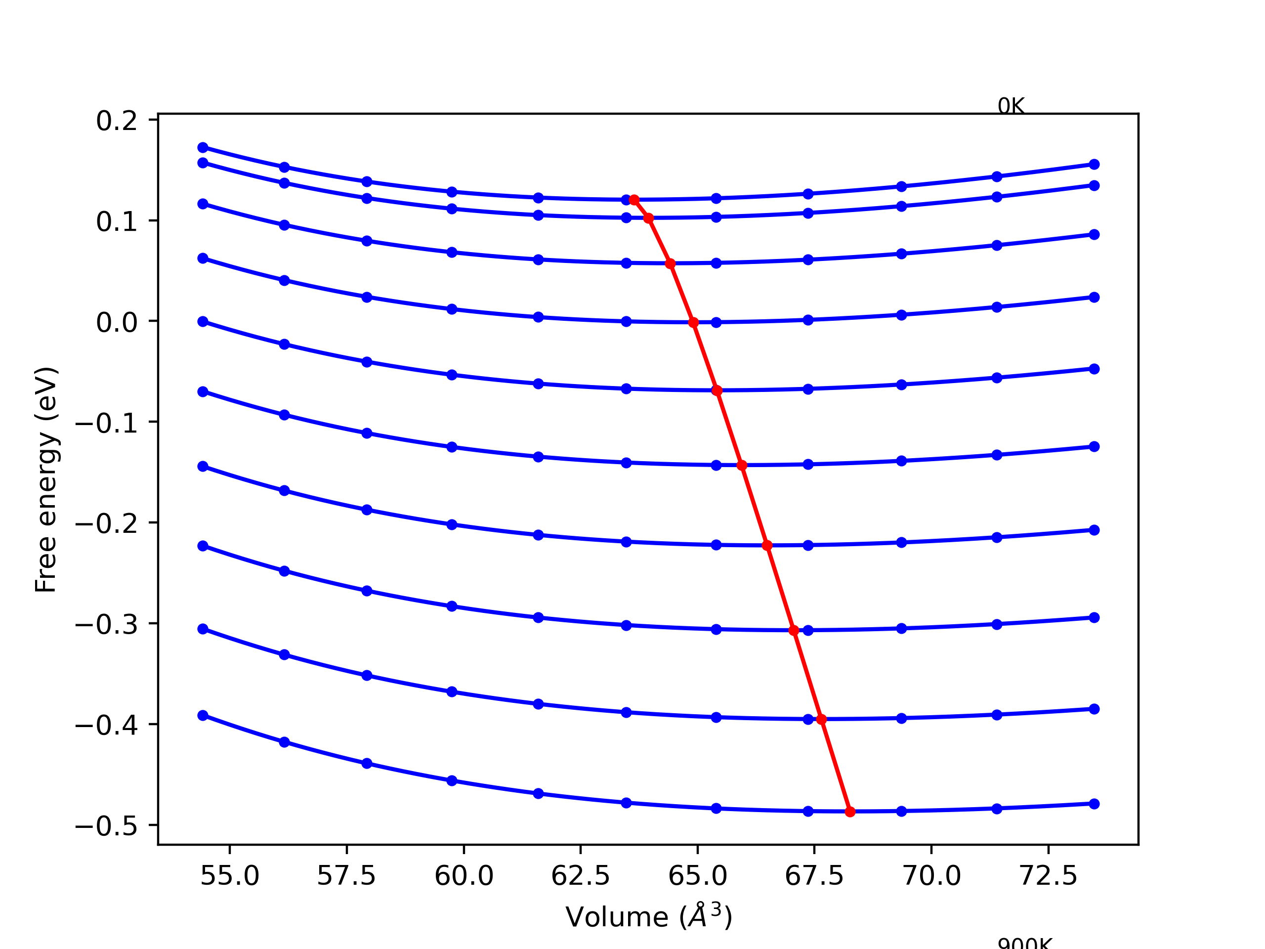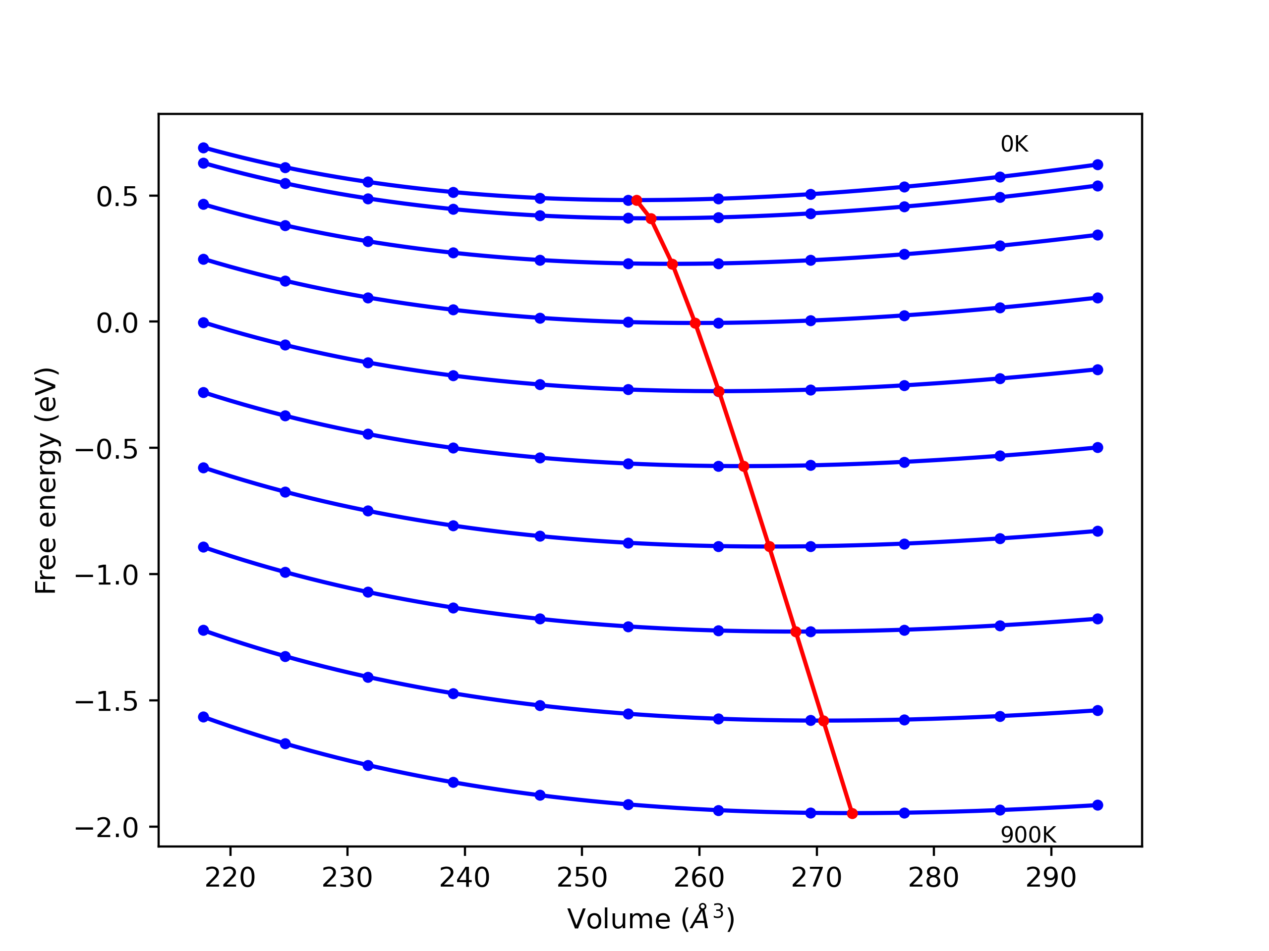 Plots of internal energy, Gibbs free energy, entropy, heat capacity and volume are shown here as a function of temperature for various crystal structures and liquid phases. The included crystal structures correspond to those in the Solid Structures vs. Temperature section, and the liquid phases to those in the Liquid Properties section. Internal energy and volume are taken from the associated structure relaxations mentioned in those previous sections. Constant pressure heat capacity is estimated using 3-point numerical derivatives of enthalpy versus temperature. Note that since all simulations done here are at 0 pressure, internal energy and enthalpy are equivalent.