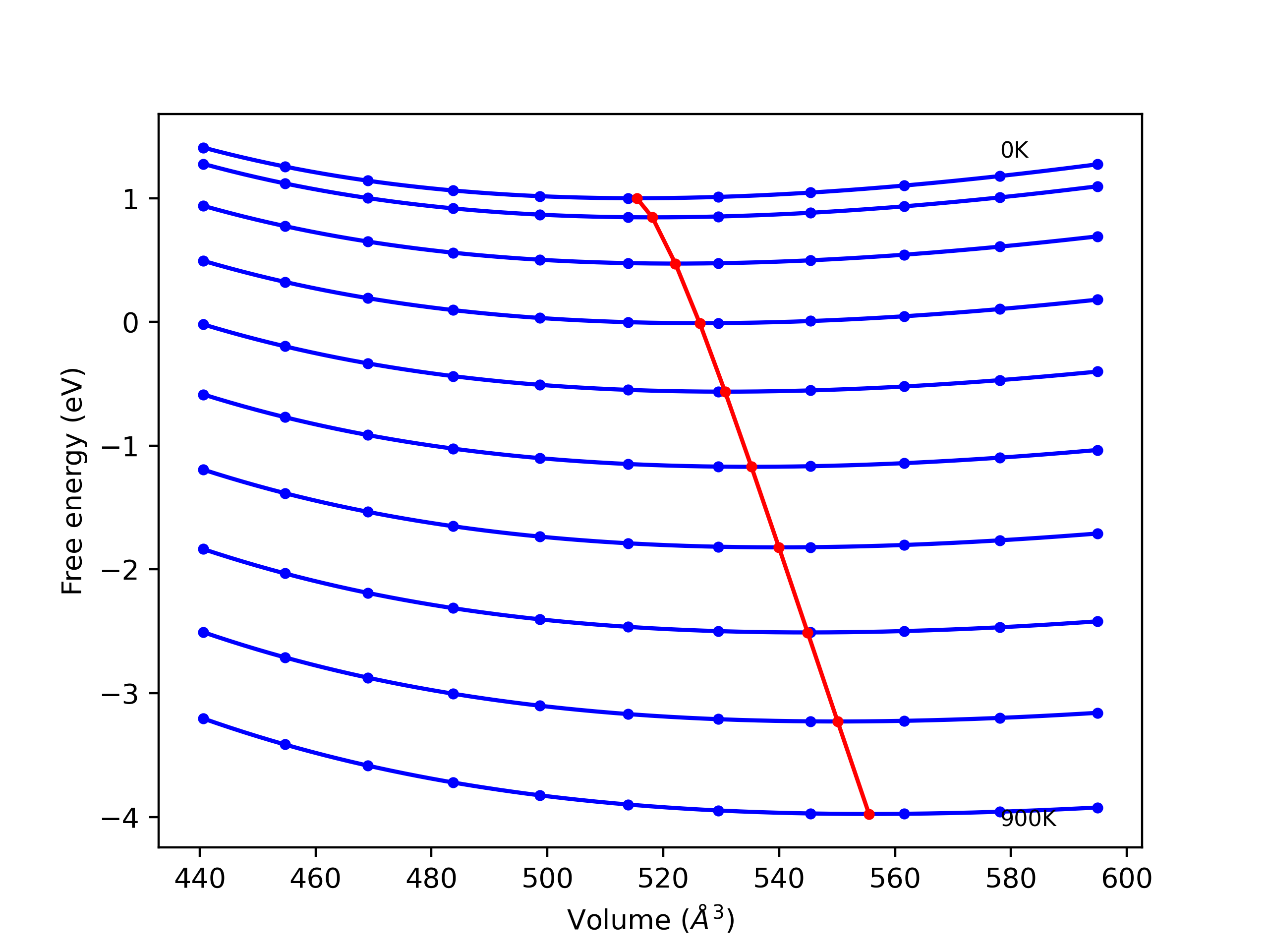 The Gibbs energies of the phases are estimated using thermodynamic integration between the interatomic potential in question and a simpler model with known Gibbs free energy values. For solids, the reference model is an Einstein solid, while for liquids it is the Uhlenbeck-Ford potential. Besides a short run at the start of the solid calculations to estimate Einstein model spring constants, the two calculations proceed similarly. Starting with the final relaxation configurations, the systems are stabilized for 25,000 steps. Then, over the next 50,000 steps the potential is swapped out for the reference potential. The system is then stabilized for another 25,000 steps with the reference model before a reverse swap of 50,000 steps is performed. The simulation ends with one final 25,000 step stabilization period. From the simulation, the irreversible work of transformation is estimated and used to compute the absolute Gibbs free energy of the target phase and potential relative to the reference potential. Entropy is estimated as the difference in enthalpy and Gibbs free energy and divided by temperature.