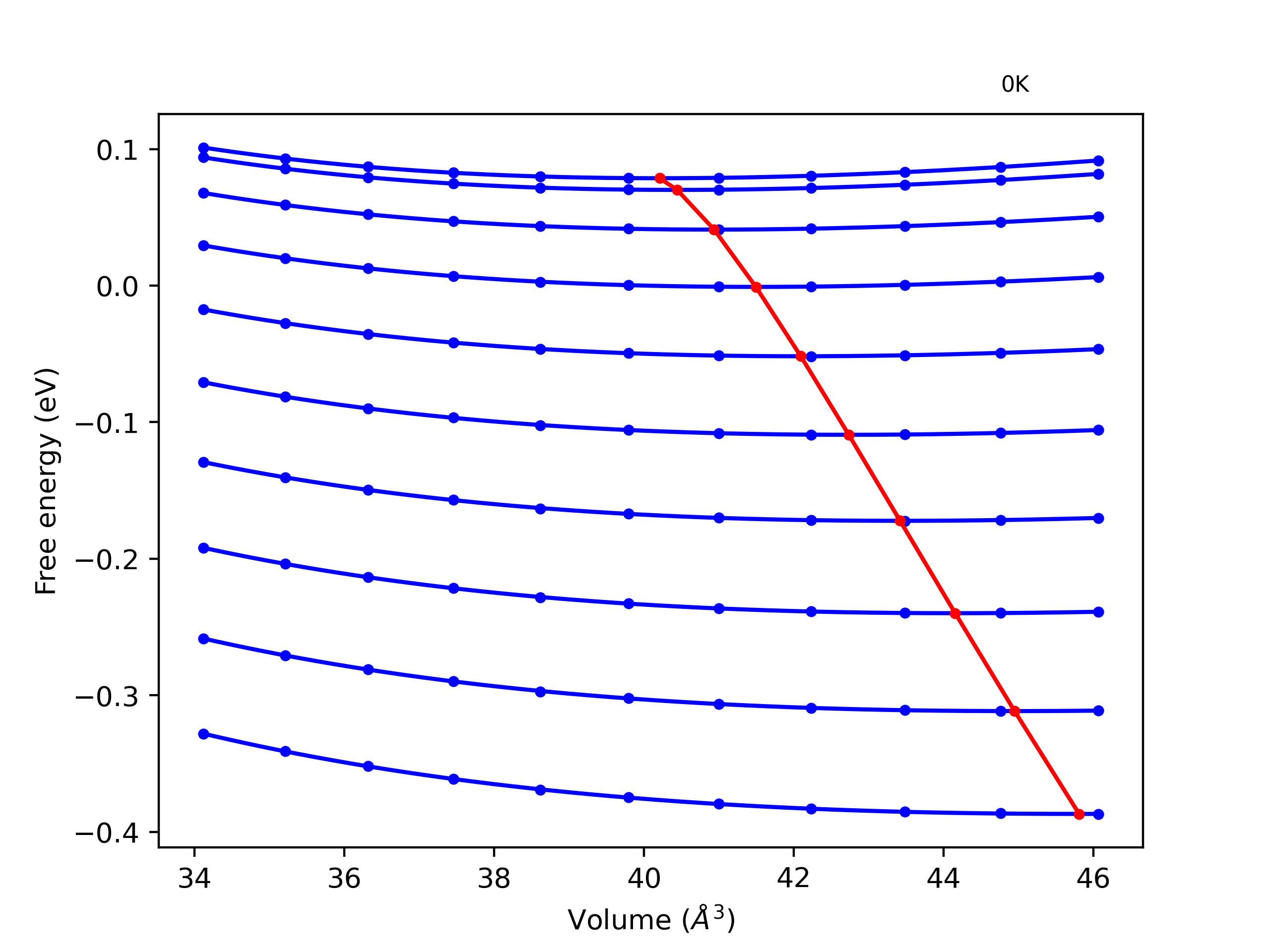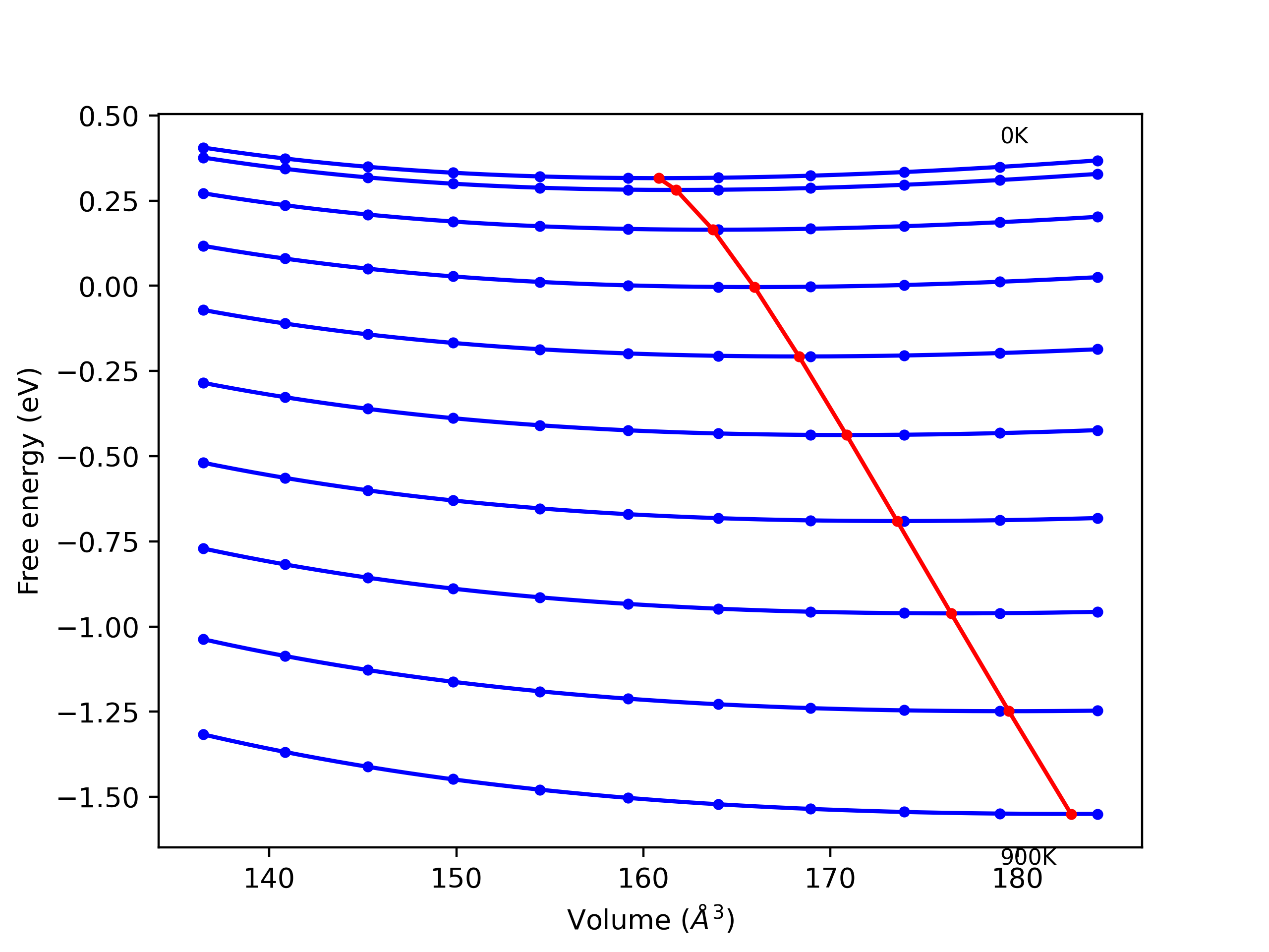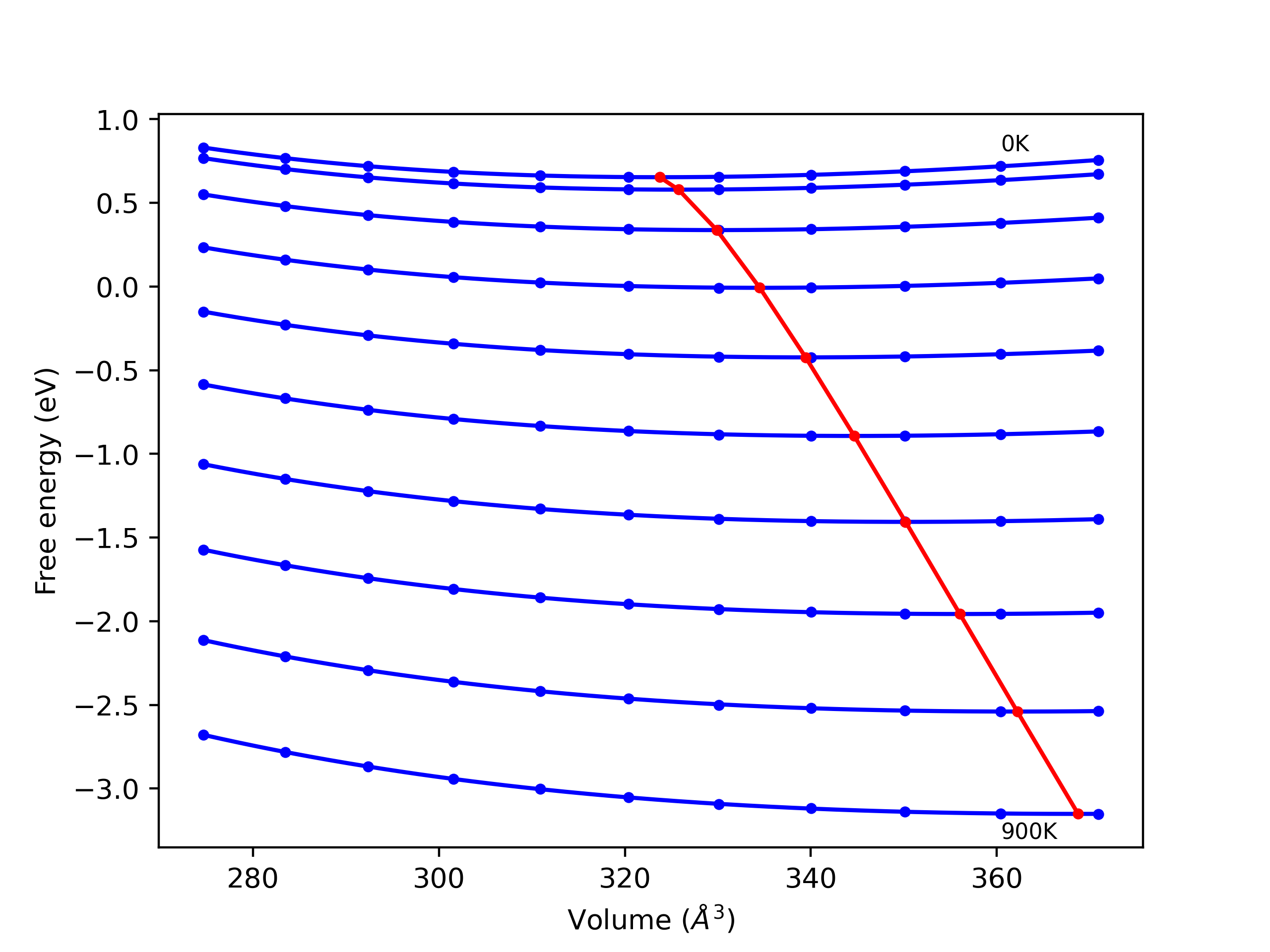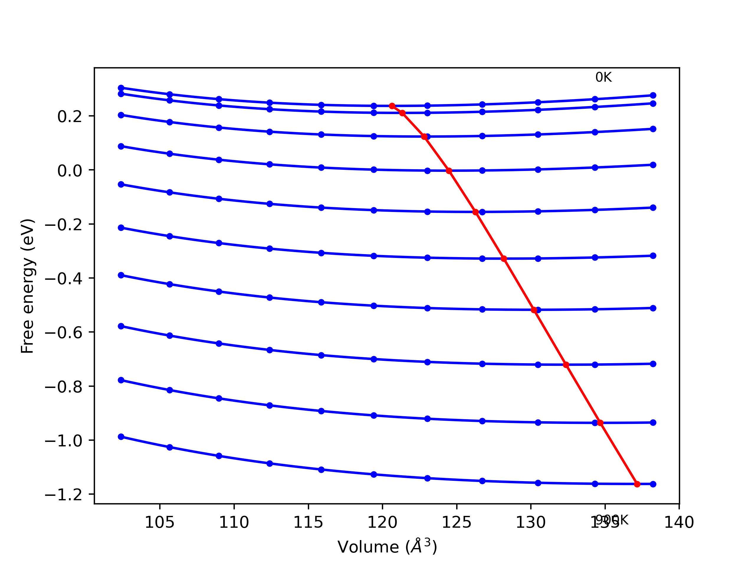 Phonon band structures and crystal properties estimated from quasi-harmonic approximation (QHA) calculations are displayed for select crystals. The calculations were performed using phonopy and LAMMPS. For the phonon calculations, 3x3 supercells of the potential-specific relaxed crystals were used. The QHA calculations were based on 11 strain states ranging from -0.05 to 0.05.