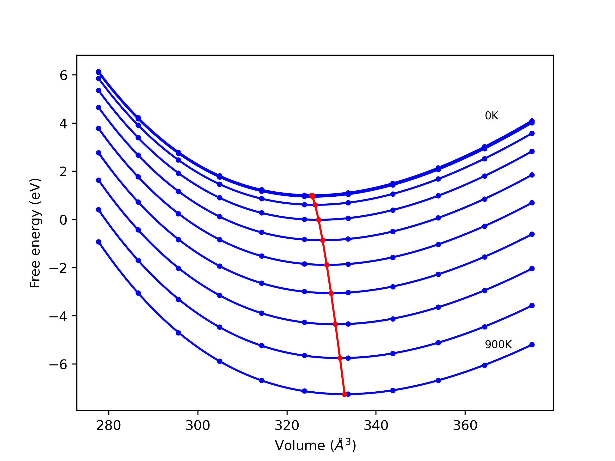 Phonon band structures and crystal properties estimated from quasi-harmonic approximation (QHA) calculations are displayed for select crystals. The calculations were performed using phonopy and LAMMPS. For the phonon calculations, 3x3 supercells of the potential-specific relaxed crystals were used. The QHA calculations were based on 11 strain states ranging from -0.05 to 0.05.