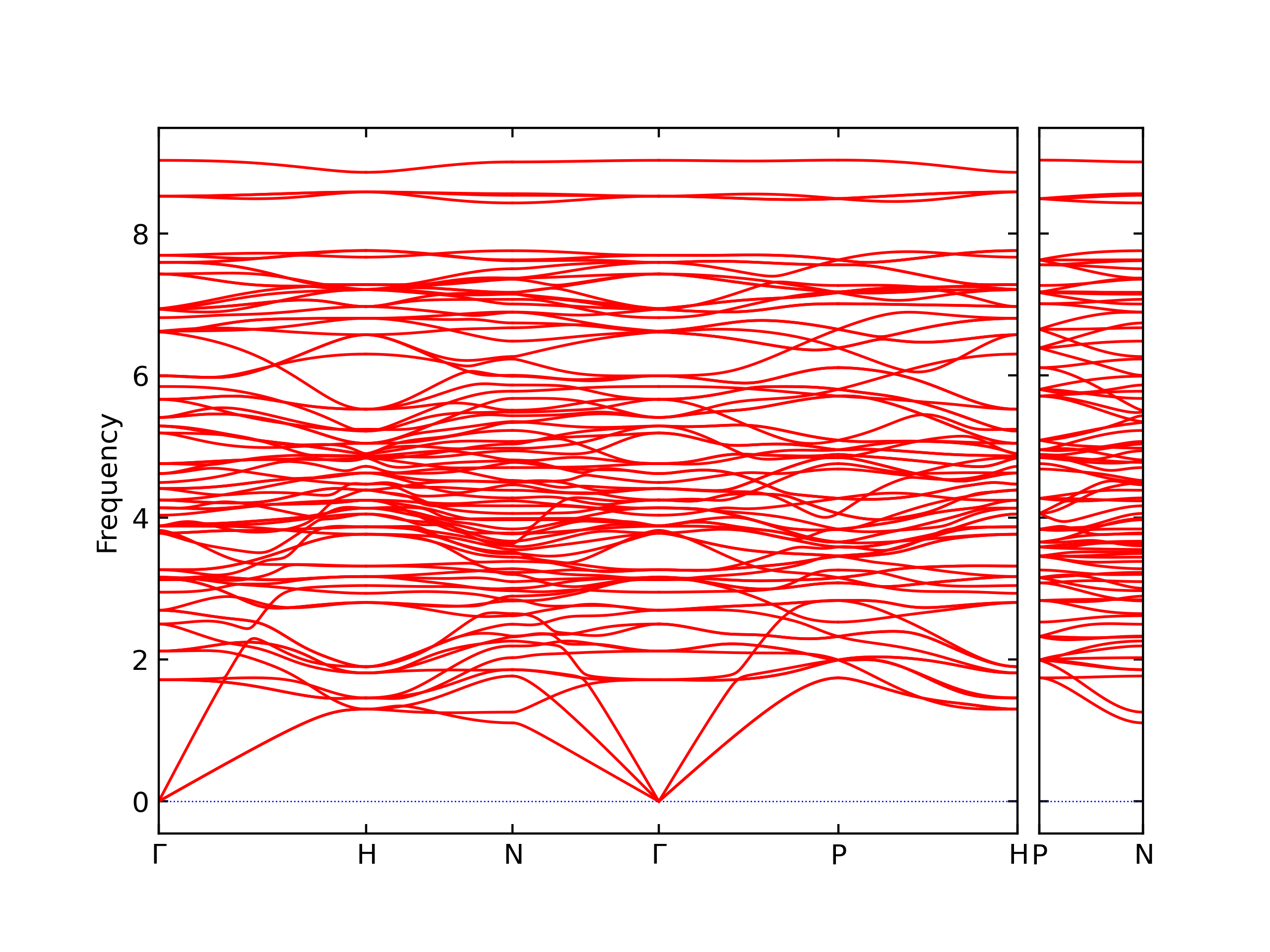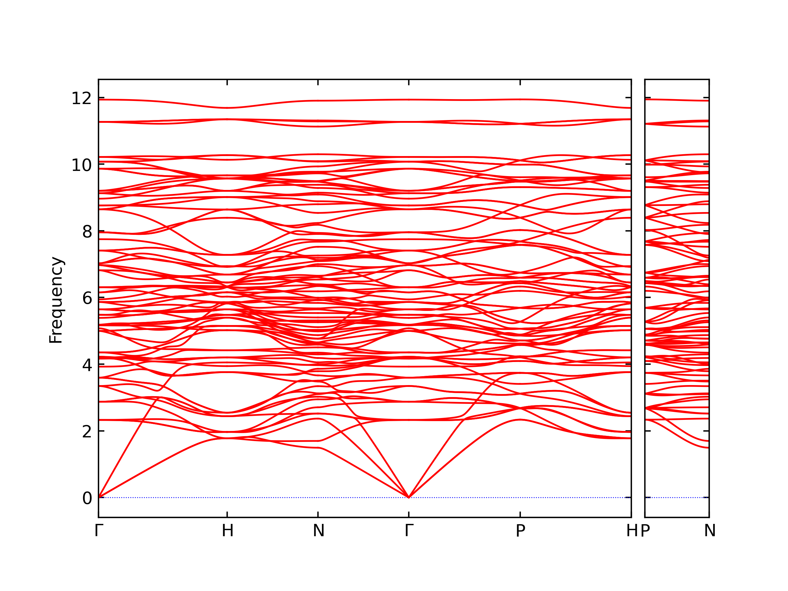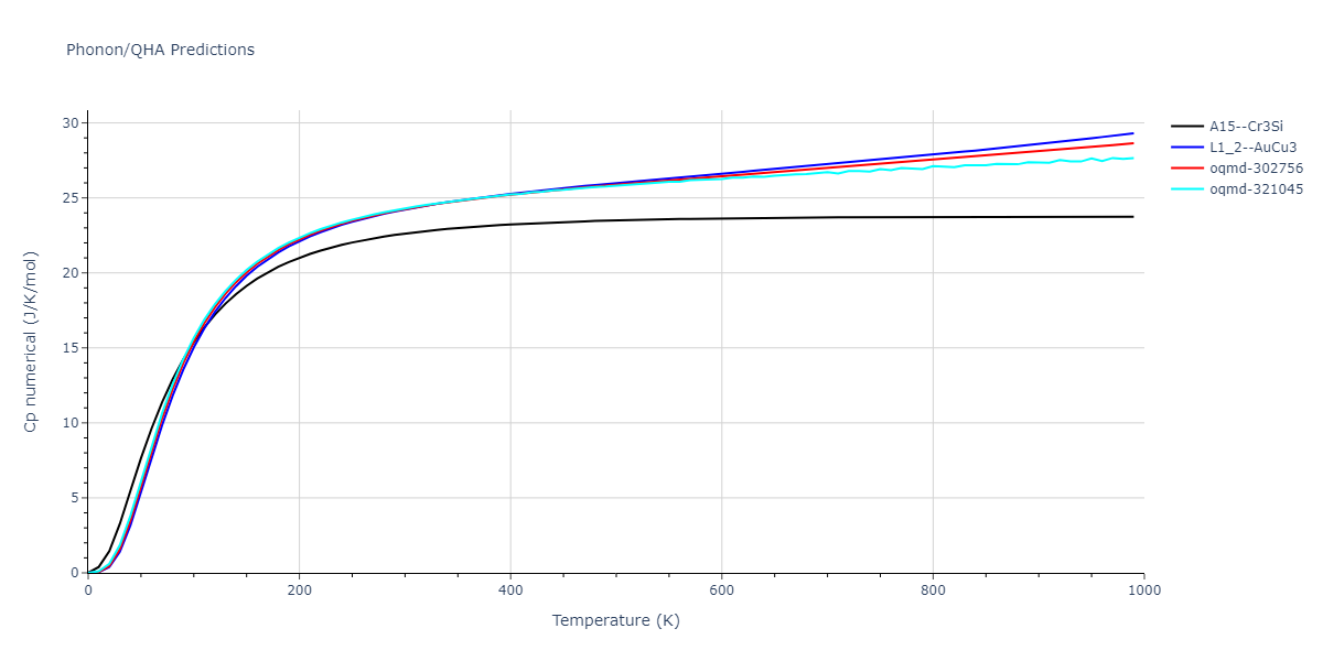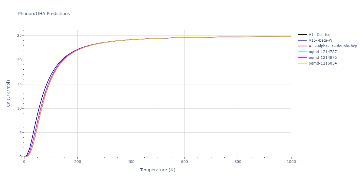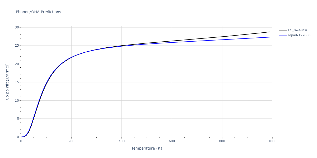 Phonon band structures and crystal properties estimated from quasi-harmonic approximation (QHA) calculations are displayed for select crystals. The calculations were performed using phonopy and LAMMPS. For the phonon calculations, 3x3 supercells of the potential-specific relaxed crystals were used. The QHA calculations were based on 11 strain states ranging from -0.05 to 0.05.