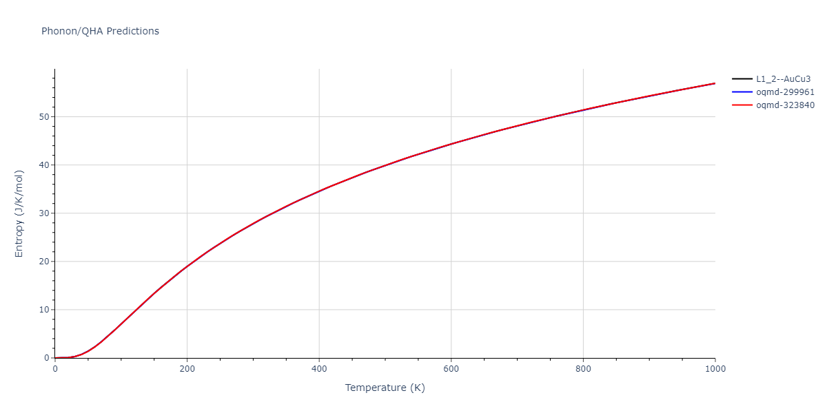 The Gibbs energies of the phases are estimated using thermodynamic integration between the interatomic potential in question and a simpler model with known Gibbs free energy values. For solids, the reference model is an Einstein solid, while for liquids it is the Uhlenbeck-Ford potential. Besides a short run at the start of the solid calculations to estimate Einstein model spring constants, the two calculations proceed similarly. Starting with the final relaxation configurations, the systems are stabilized for 25,000 steps. Then, over the next 50,000 steps the potential is swapped out for the reference potential. The system is then stabilized for another 25,000 steps with the reference model before a reverse swap of 50,000 steps is performed. The simulation ends with one final 25,000 step stabilization period. From the simulation, the irreversible work of transformation is estimated and used to compute the absolute Gibbs free energy of the target phase and potential relative to the reference potential. Entropy is estimated as the difference in enthalpy and Gibbs free energy and divided by temperature.