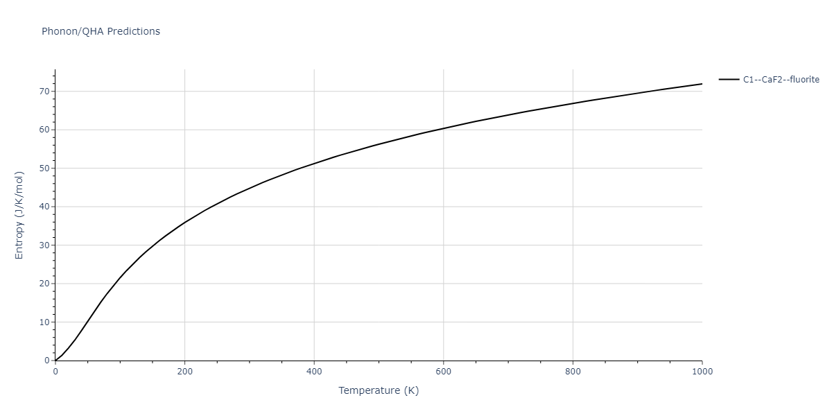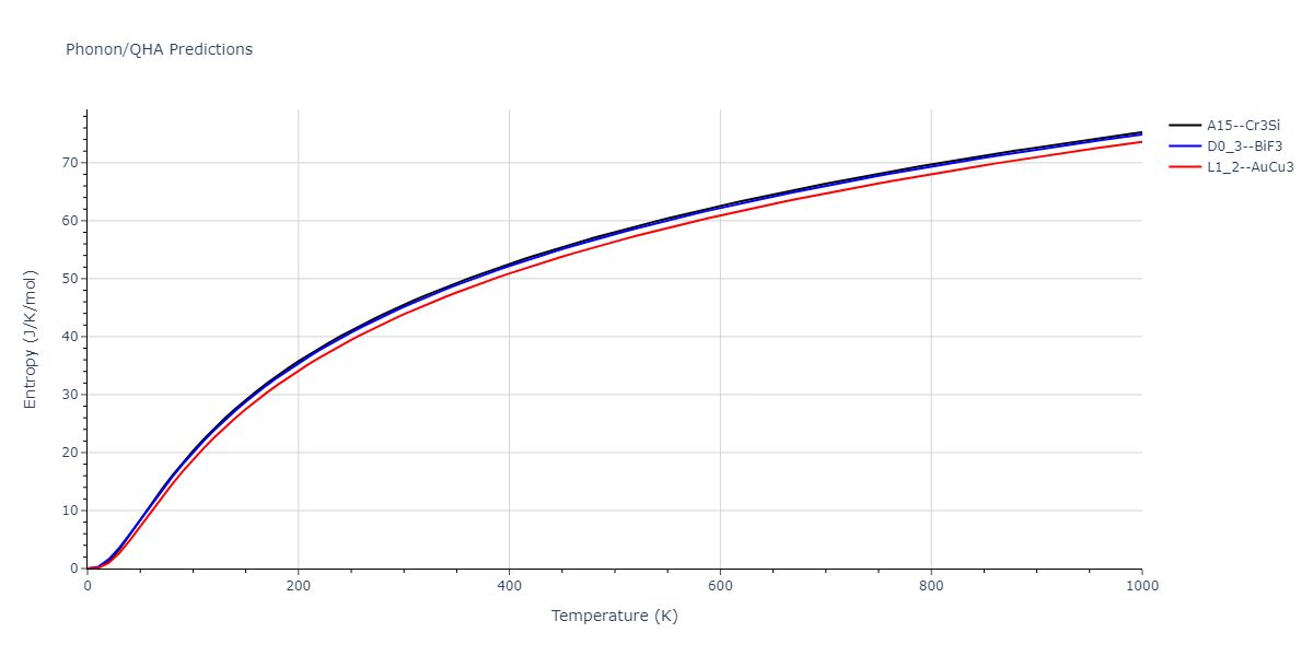 The Gibbs energies of the phases are estimated using thermodynamic integration between the interatomic potential in question and a simpler model with known Gibbs free energy values. For solids, the reference model is an Einstein solid, while for liquids it is the Uhlenbeck-Ford potential. Besides a short run at the start of the solid calculations to estimate Einstein model spring constants, the two calculations proceed similarly. Starting with the final relaxation configurations, the systems are stabilized for 25,000 steps. Then, over the next 50,000 steps the potential is swapped out for the reference potential. The system is then stabilized for another 25,000 steps with the reference model before a reverse swap of 50,000 steps is performed. The simulation ends with one final 25,000 step stabilization period. From the simulation, the irreversible work of transformation is estimated and used to compute the absolute Gibbs free energy of the target phase and potential relative to the reference potential. Entropy is estimated as the difference in enthalpy and Gibbs free energy and divided by temperature.