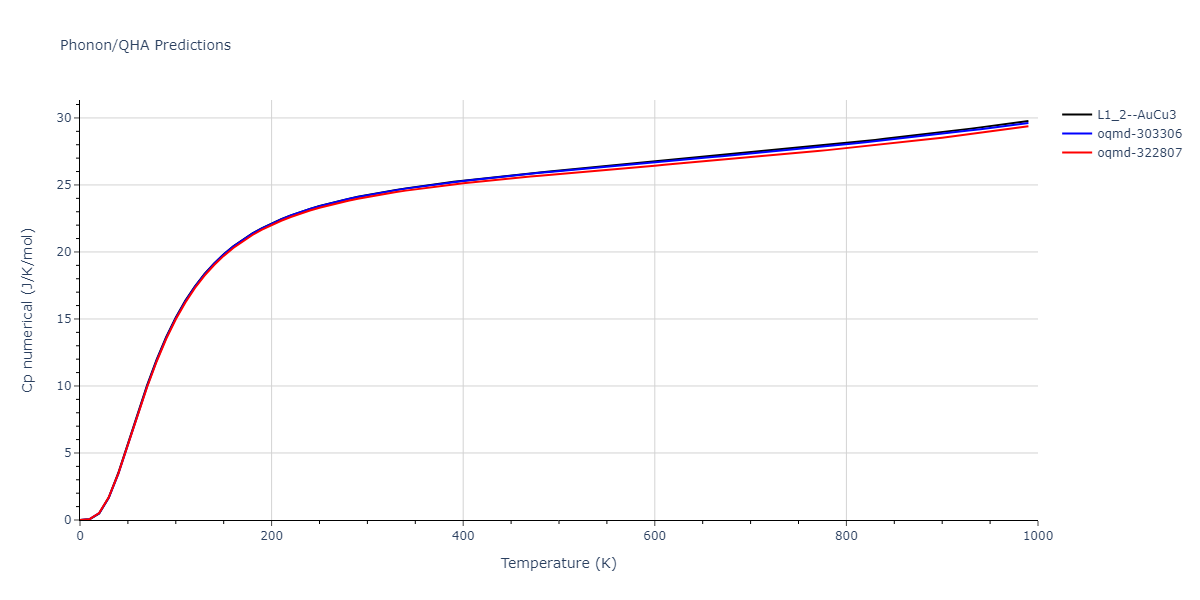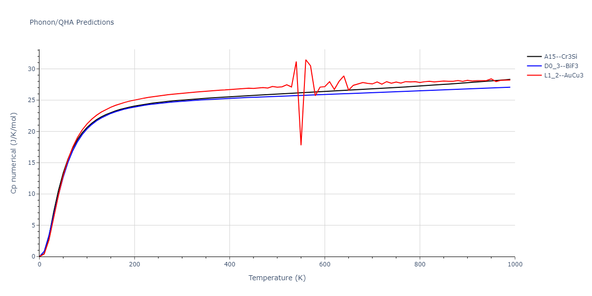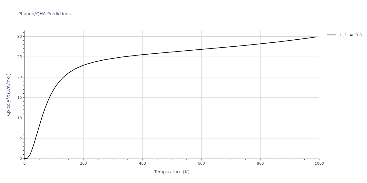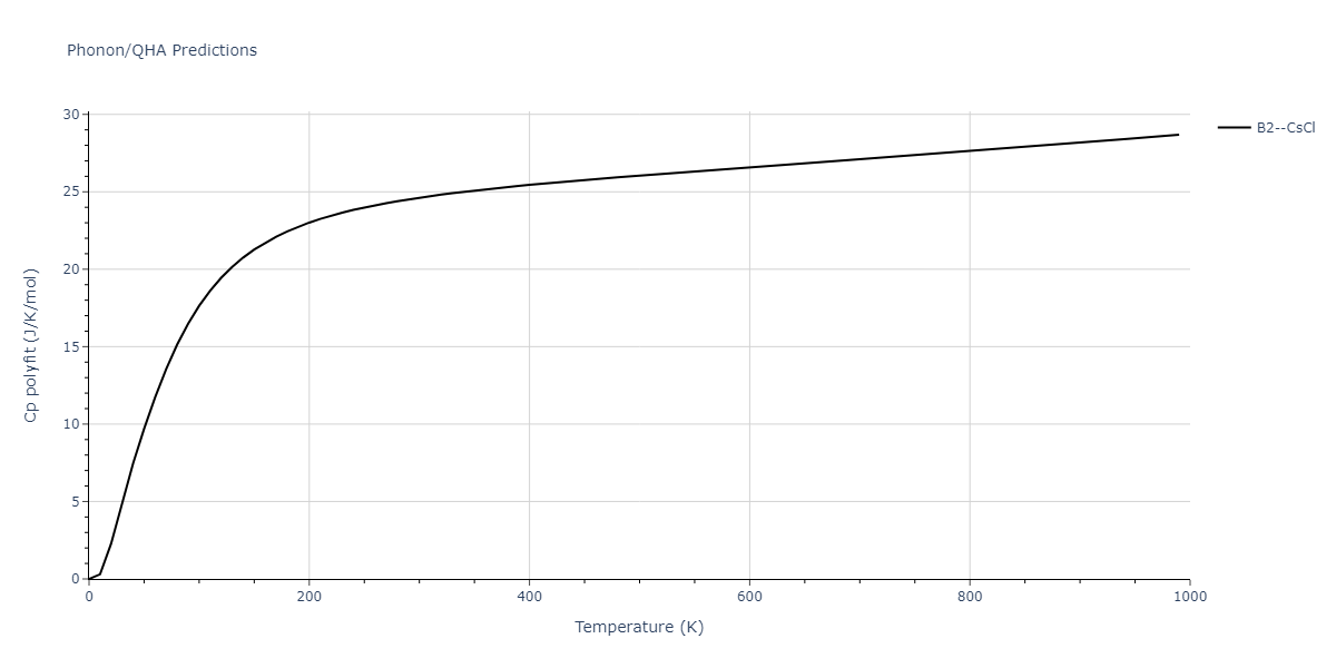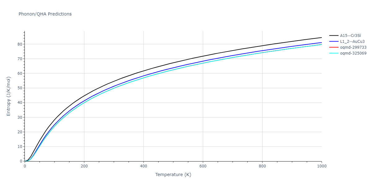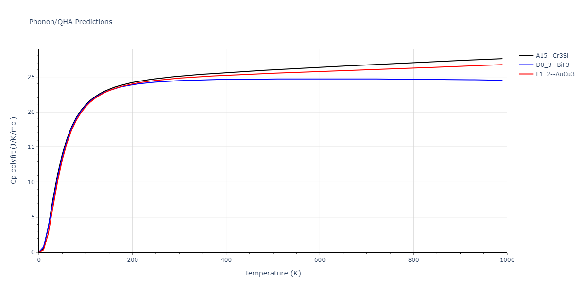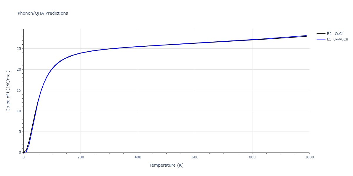 Plots of internal energy, Gibbs free energy, entropy, heat capacity and volume are shown here as a function of temperature for various crystal structures and liquid phases. The included crystal structures correspond to those in the Solid Structures vs. Temperature section, and the liquid phases to those in the Liquid Properties section. Internal energy and volume are taken from the associated structure relaxations mentioned in those previous sections. Constant pressure heat capacity is estimated using 3-point numerical derivatives of enthalpy versus temperature. Note that since all simulations done here are at 0 pressure, internal energy and enthalpy are equivalent.
