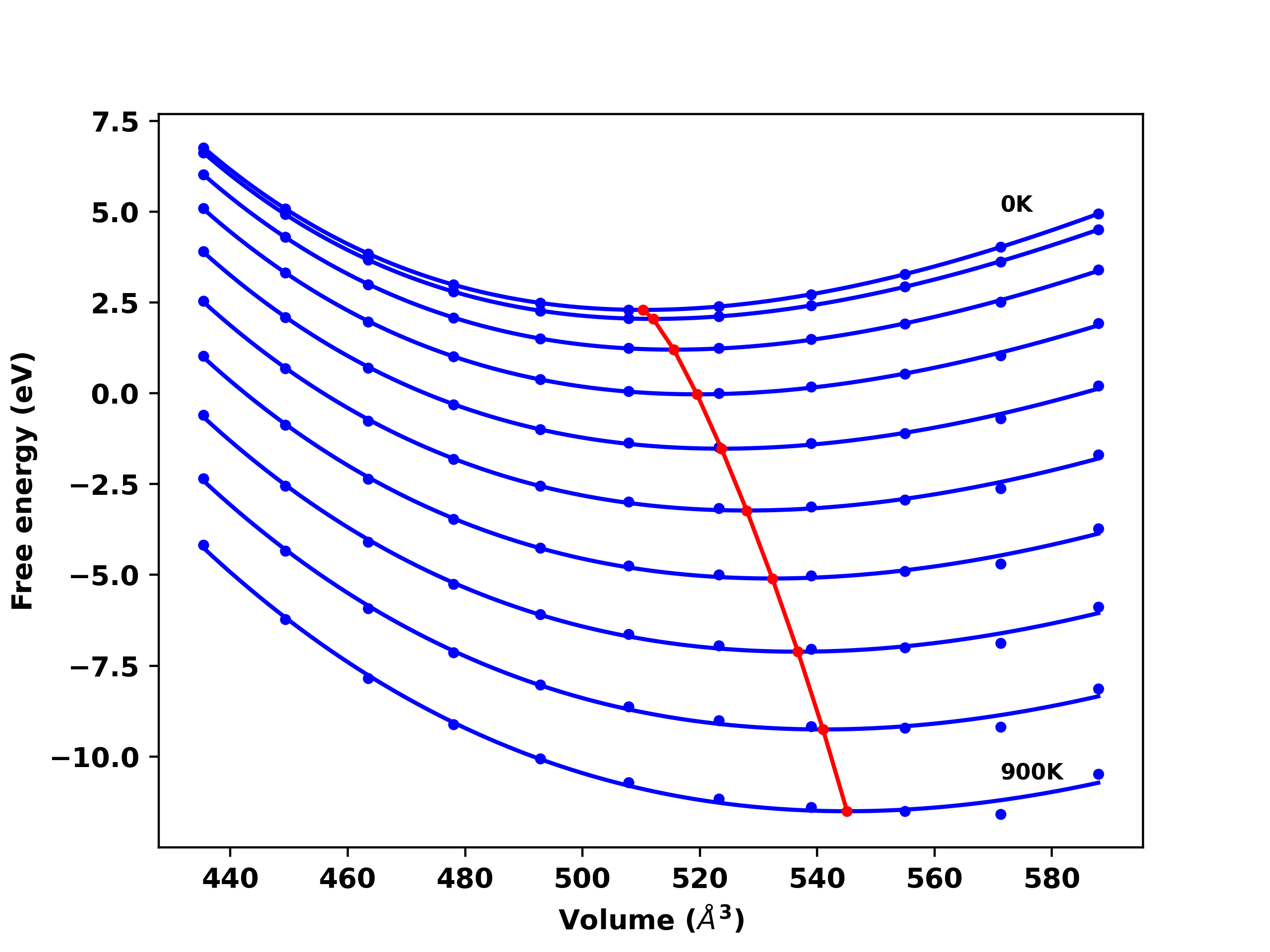 The Gibbs energies of the phases are estimated using thermodynamic integration between the interatomic potential in question and a simpler model with known Gibbs free energy values. For solids, the reference model is an Einstein solid, while for liquids it is the Uhlenbeck-Ford potential. Besides a short run at the start of the solid calculations to estimate Einstein model spring constants, the two calculations proceed similarly. Starting with the final relaxation configurations, the systems are stabilized for 25,000 steps. Then, over the next 50,000 steps the potential is swapped out for the reference potential. The system is then stabilized for another 25,000 steps with the reference model before a reverse swap of 50,000 steps is performed. The simulation ends with one final 25,000 step stabilization period. From the simulation, the irreversible work of transformation is estimated and used to compute the absolute Gibbs free energy of the target phase and potential relative to the reference potential. Entropy is estimated as the difference in enthalpy and Gibbs free energy and divided by temperature.