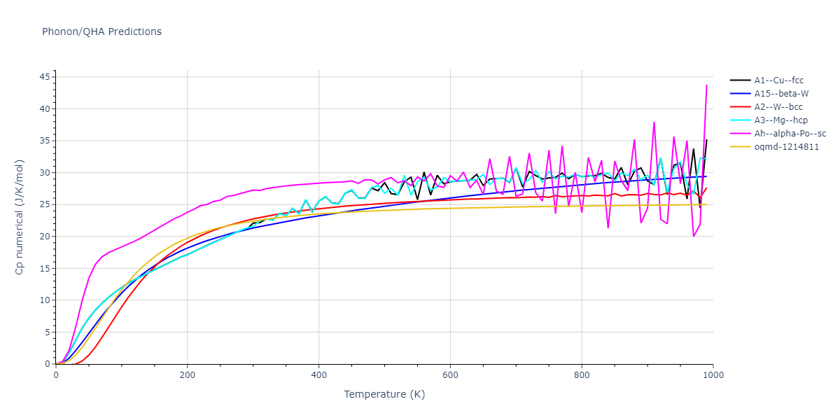 Phonon band structures and crystal properties estimated from quasi-harmonic approximation (QHA) calculations are displayed for select crystals. The calculations were performed using phonopy and LAMMPS. For the phonon calculations, 3x3 supercells of the potential-specific relaxed crystals were used. The QHA calculations were based on 11 strain states ranging from -0.05 to 0.05.
