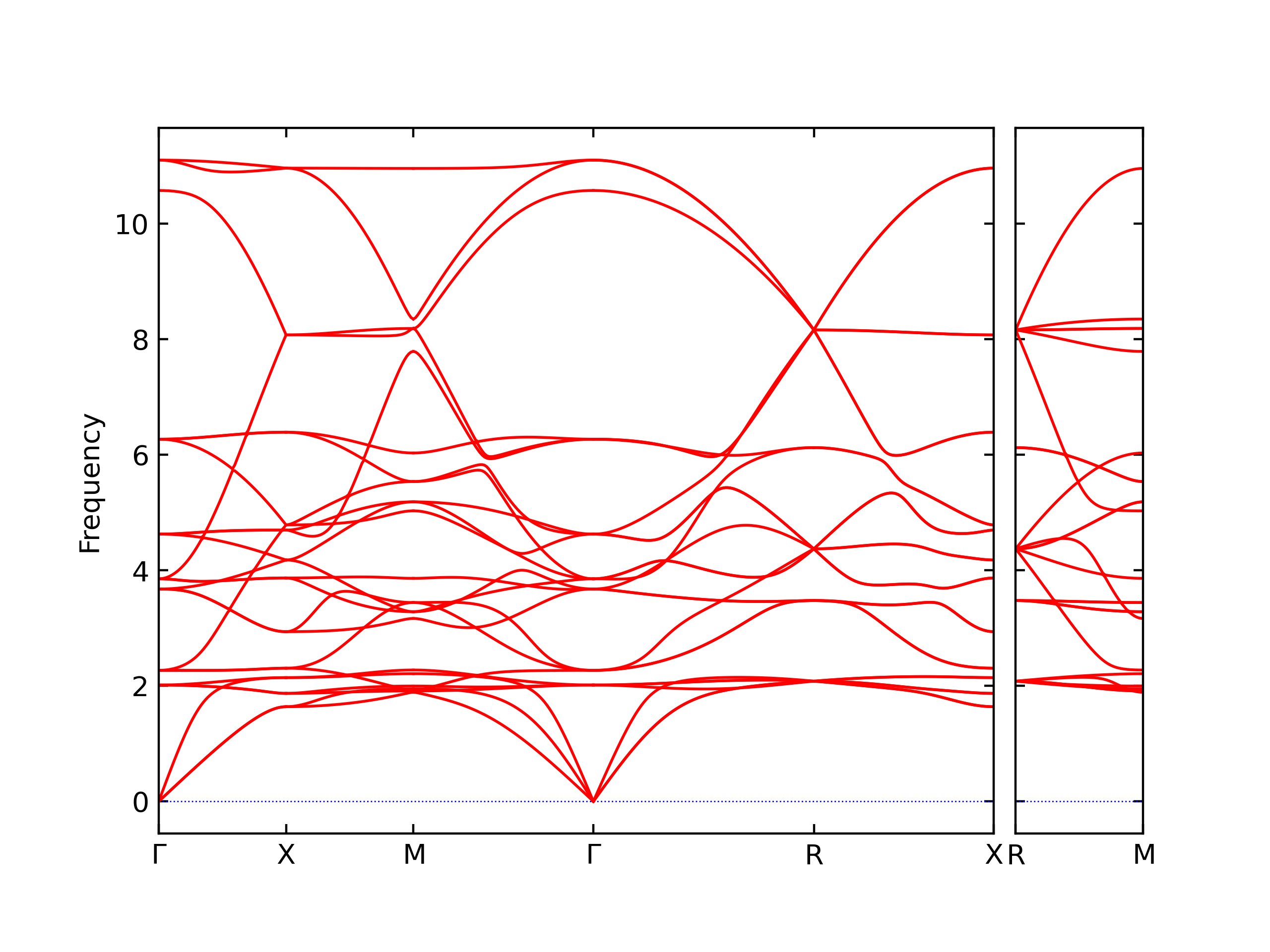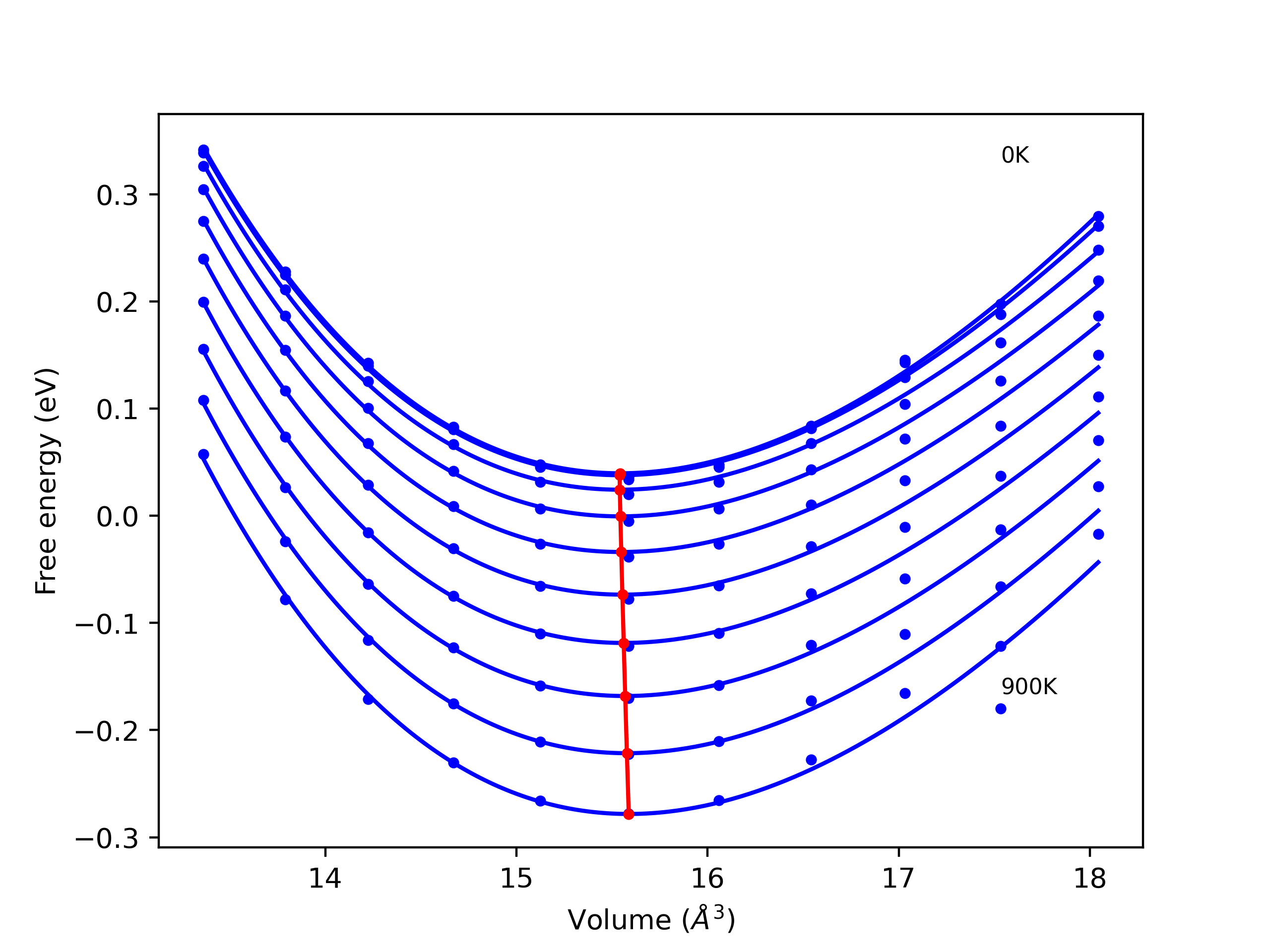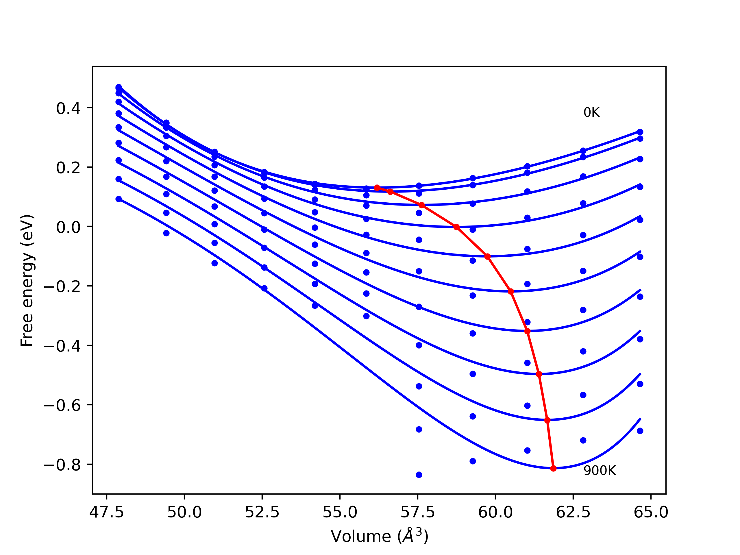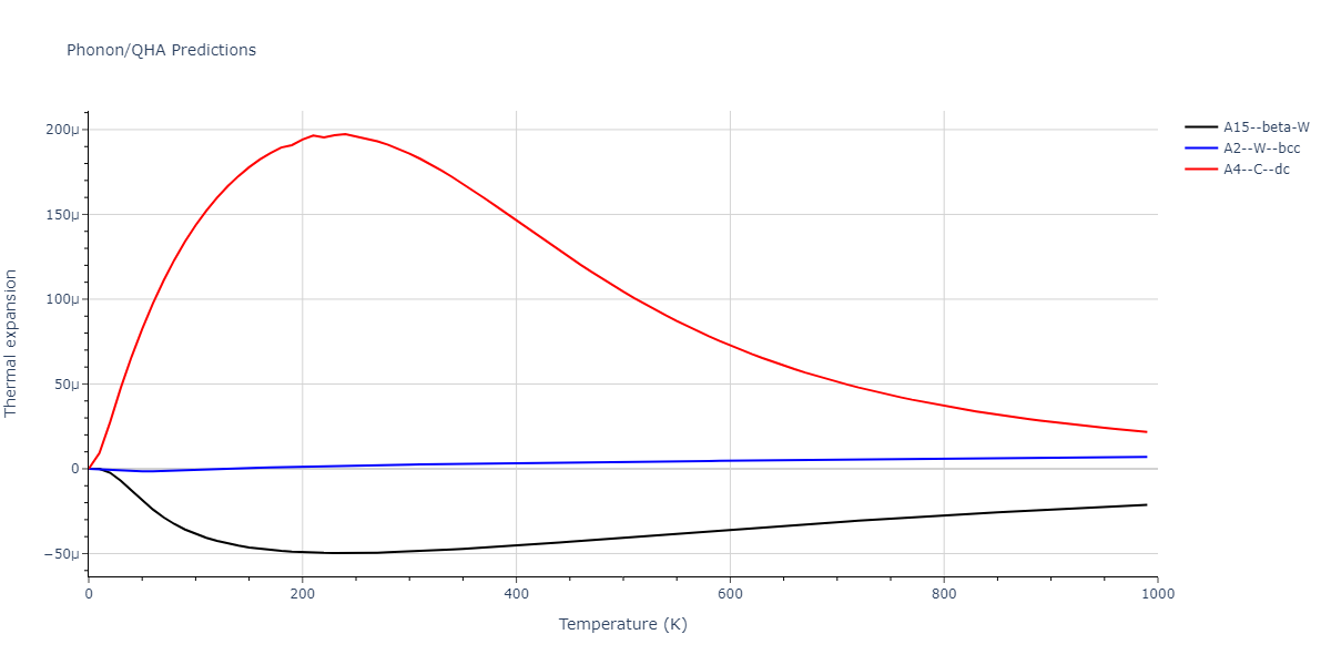 Phonon band structures and crystal properties estimated from quasi-harmonic approximation (QHA) calculations are displayed for select crystals. The calculations were performed using phonopy and LAMMPS. For the phonon calculations, 3x3 supercells of the potential-specific relaxed crystals were used. The QHA calculations were based on 11 strain states ranging from -0.05 to 0.05.
