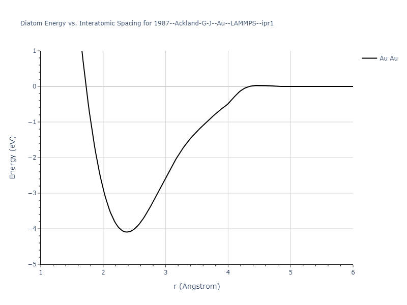 Plots of the potential energy vs interatomic spacing, r, are shown below for all diatom sets associated with the interatomic potential. This calculation provides insights into the functional form of the potential's two-body interactions. A system consisting of only two atoms is created, and the potential energy is evaluated for the atoms separated by 0.02 Å <= r <= 6.0> Å in intervals of 0.02 Å. Two plots are shown: one for the "standard" interaction distance range, and one for small values of r. The small r plot is useful for determining whether the potential is suitable for radiation studies.