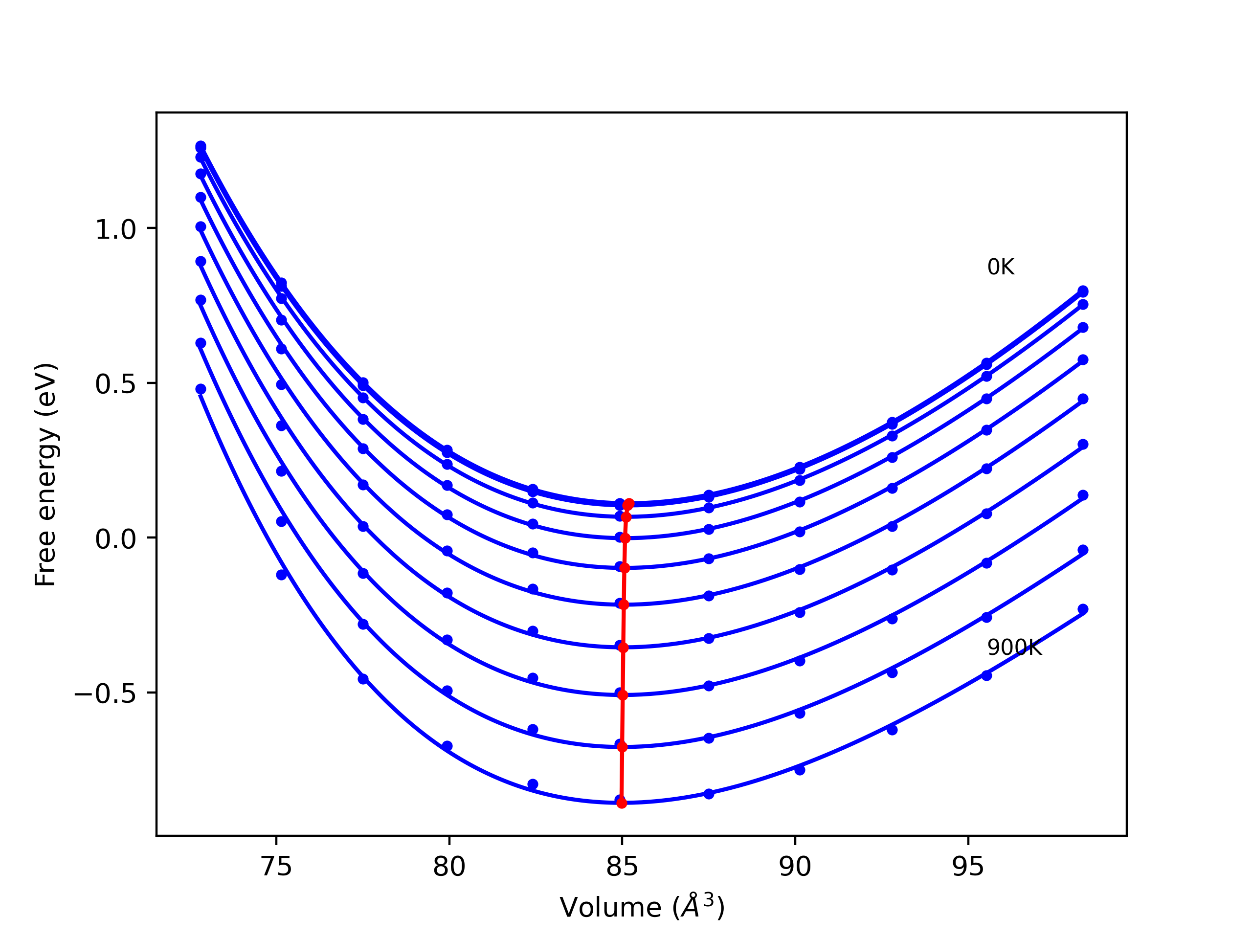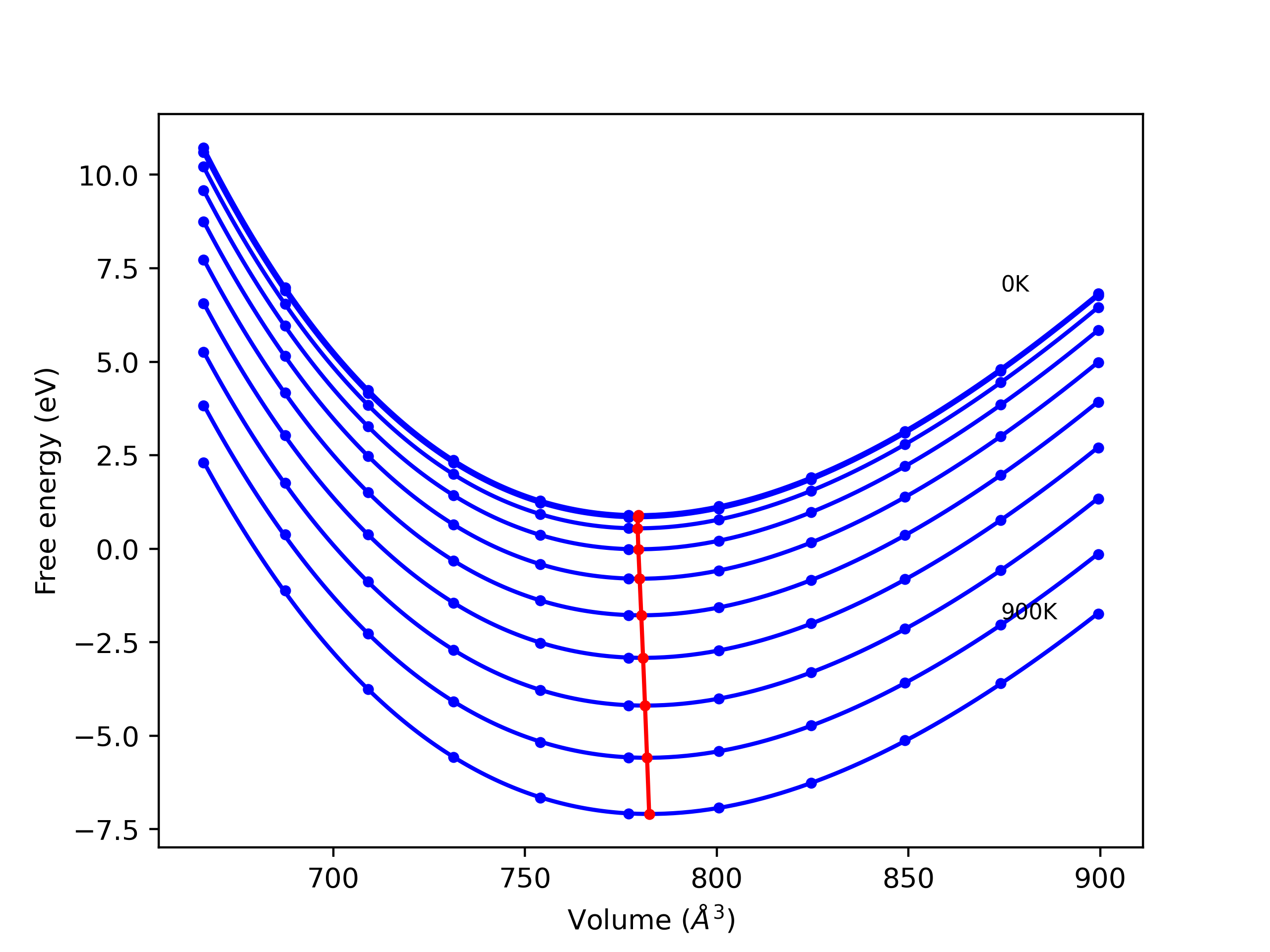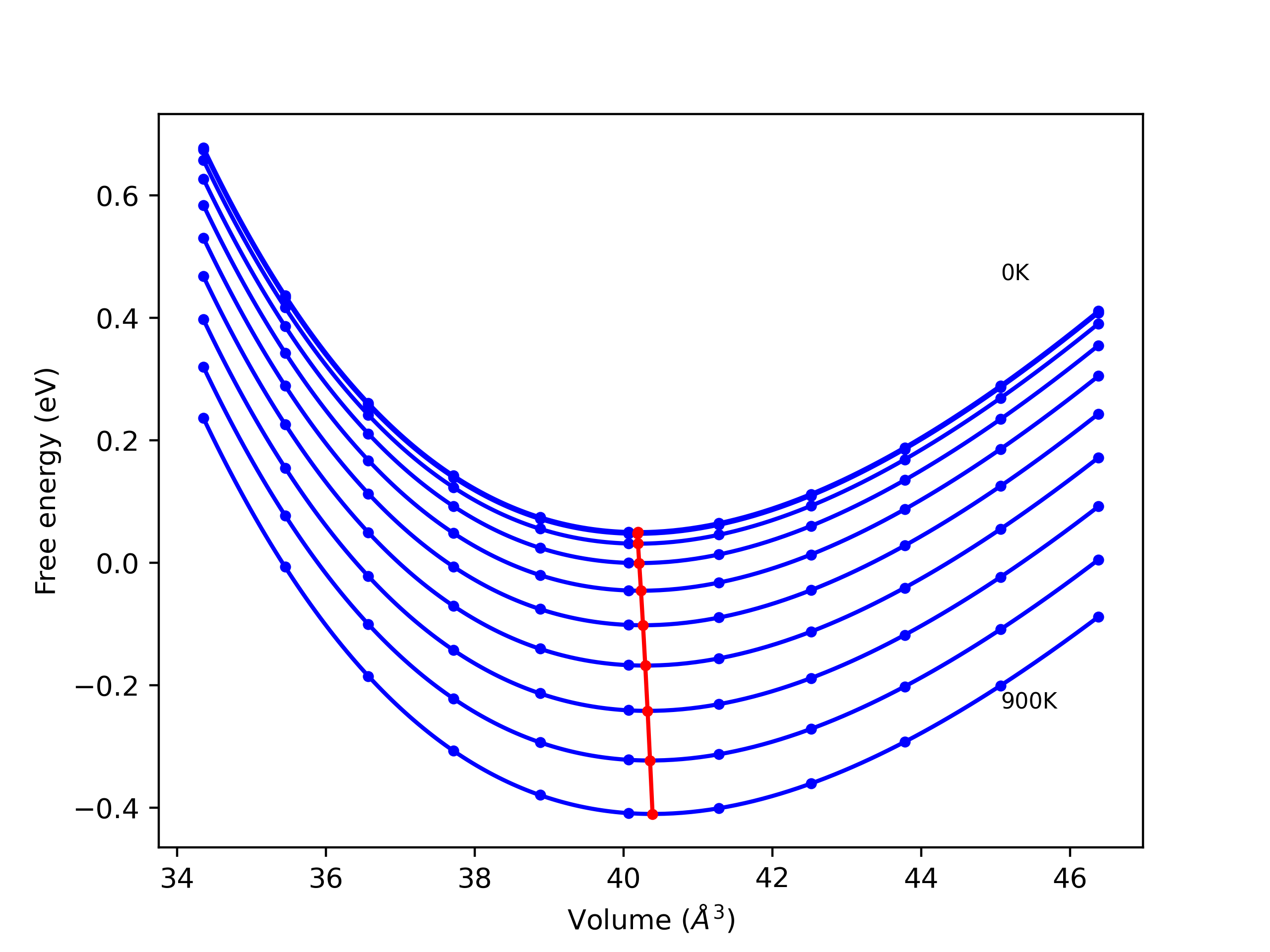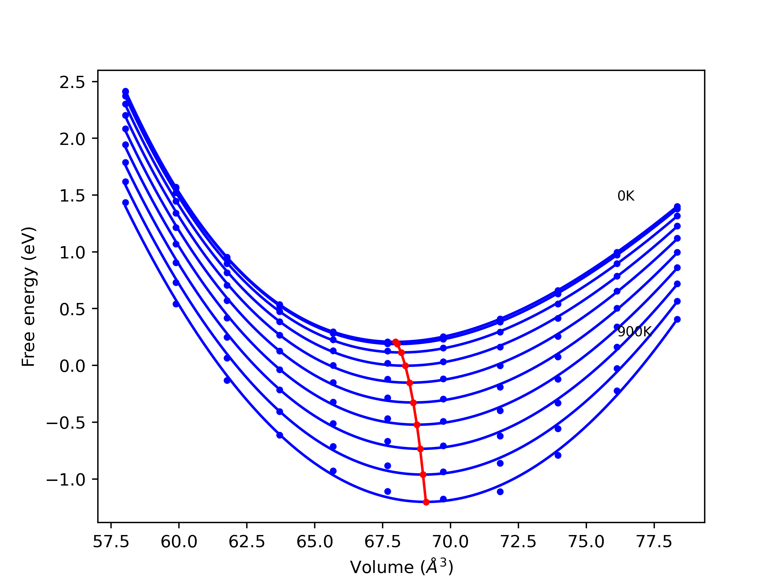 The Gibbs energies of the phases are estimated using thermodynamic integration between the interatomic potential in question and a simpler model with known Gibbs free energy values. For solids, the reference model is an Einstein solid, while for liquids it is the Uhlenbeck-Ford potential. Besides a short run at the start of the solid calculations to estimate Einstein model spring constants, the two calculations proceed similarly. Starting with the final relaxation configurations, the systems are stabilized for 25,000 steps. Then, over the next 50,000 steps the potential is swapped out for the reference potential. The system is then stabilized for another 25,000 steps with the reference model before a reverse swap of 50,000 steps is performed. The simulation ends with one final 25,000 step stabilization period. From the simulation, the irreversible work of transformation is estimated and used to compute the absolute Gibbs free energy of the target phase and potential relative to the reference potential. Entropy is estimated as the difference in enthalpy and Gibbs free energy and divided by temperature.