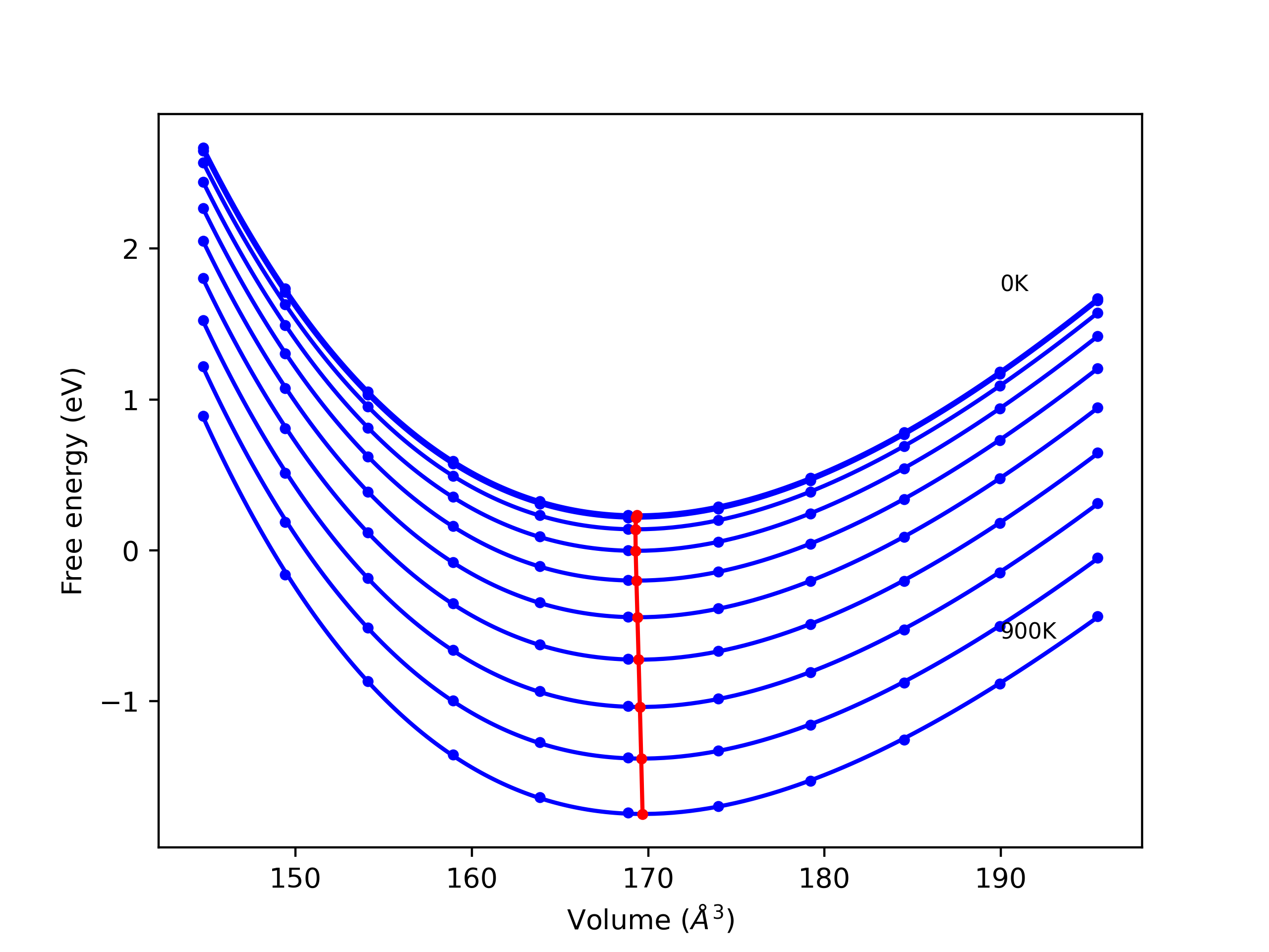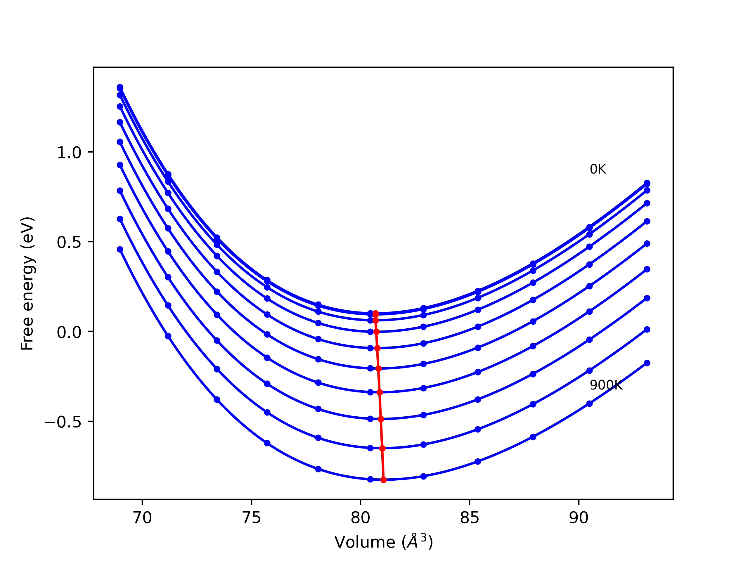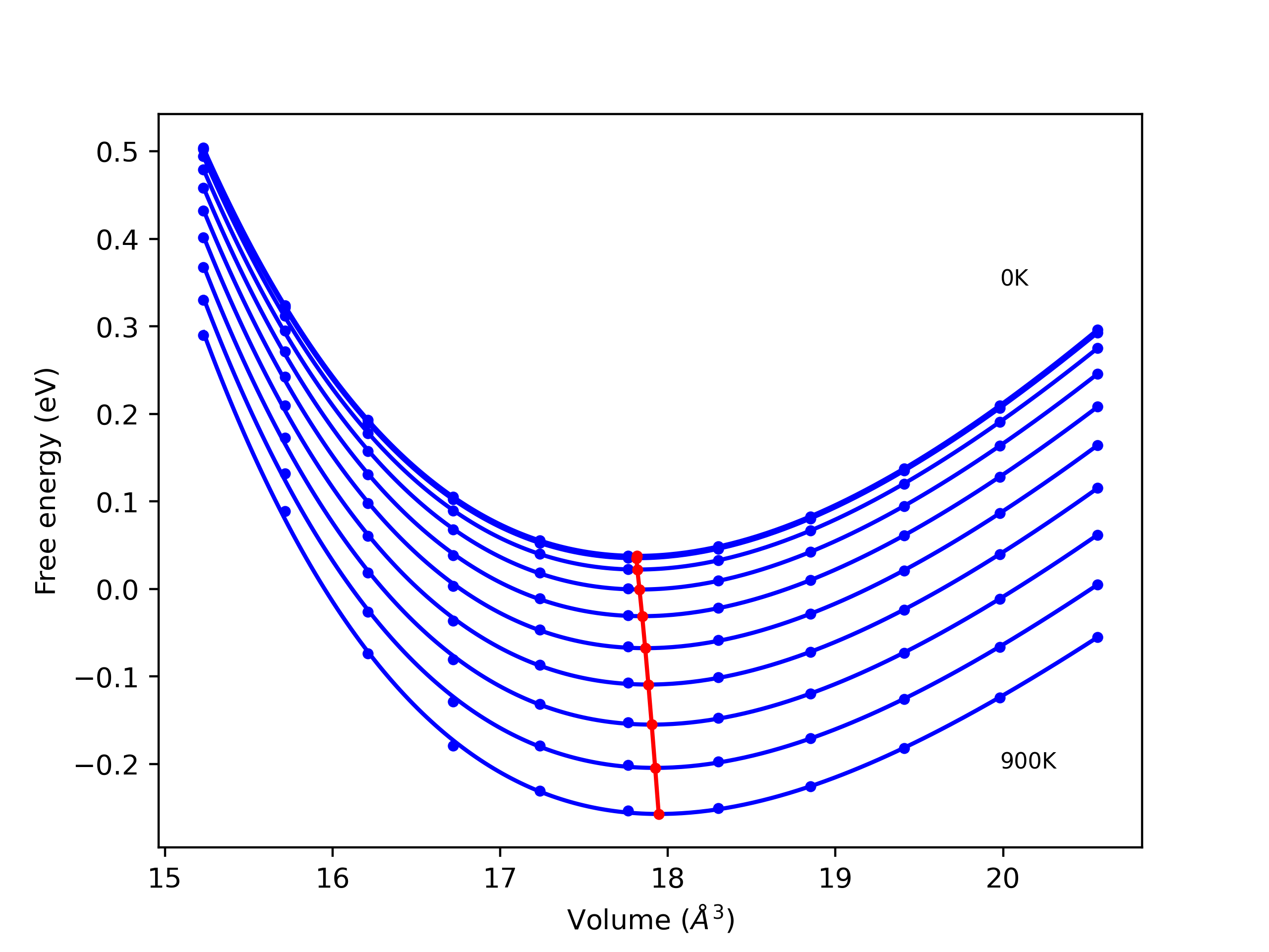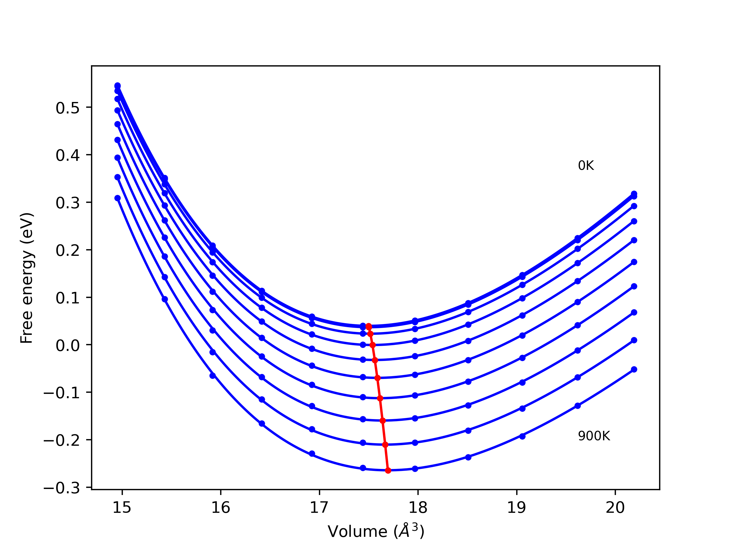 Plots of internal energy, Gibbs free energy, entropy, heat capacity and volume are shown here as a function of temperature for various crystal structures and liquid phases. The included crystal structures correspond to those in the Solid Structures vs. Temperature section, and the liquid phases to those in the Liquid Properties section. Internal energy and volume are taken from the associated structure relaxations mentioned in those previous sections. Constant pressure heat capacity is estimated using 3-point numerical derivatives of enthalpy versus temperature. Note that since all simulations done here are at 0 pressure, internal energy and enthalpy are equivalent.