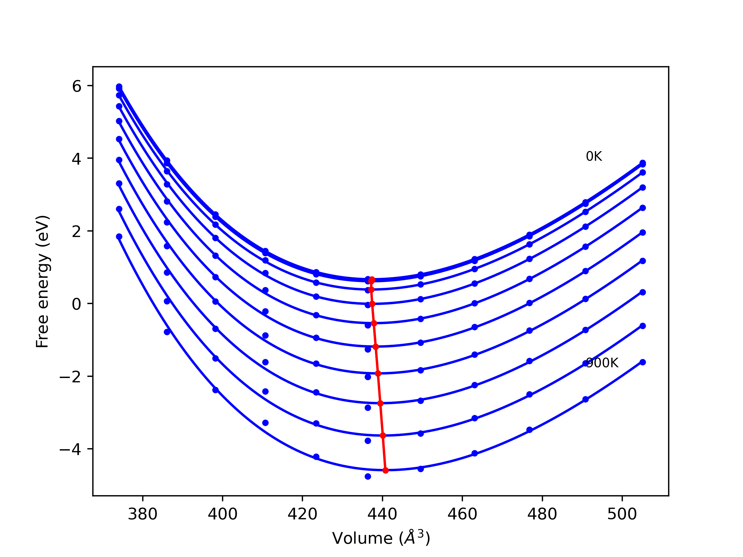 Plots of lattice and elastic constants are shown as a function of temperature. The 0K points were taken from the Crystal Structure Predictions and the Elastic Constants Predictions sections above for the unique crystal structures relaxed with the "dynamic" method. Starting from the 0 K relaxed crystal unit cells, supercell systems are created by replicating all three dimensions by the same multiplier to achieve at least 4000 atoms. The systems are then relaxed at 50 K and zero pressure using 1 million NPT steps. Lattice constants are estimated by averaging the measured box dimensions. Temperatures are iteratively increased by 50 K, with each subsequent relaxation calculation starting from the final atomic configuration at the previous temperature and relaxing for another 1 million steps.