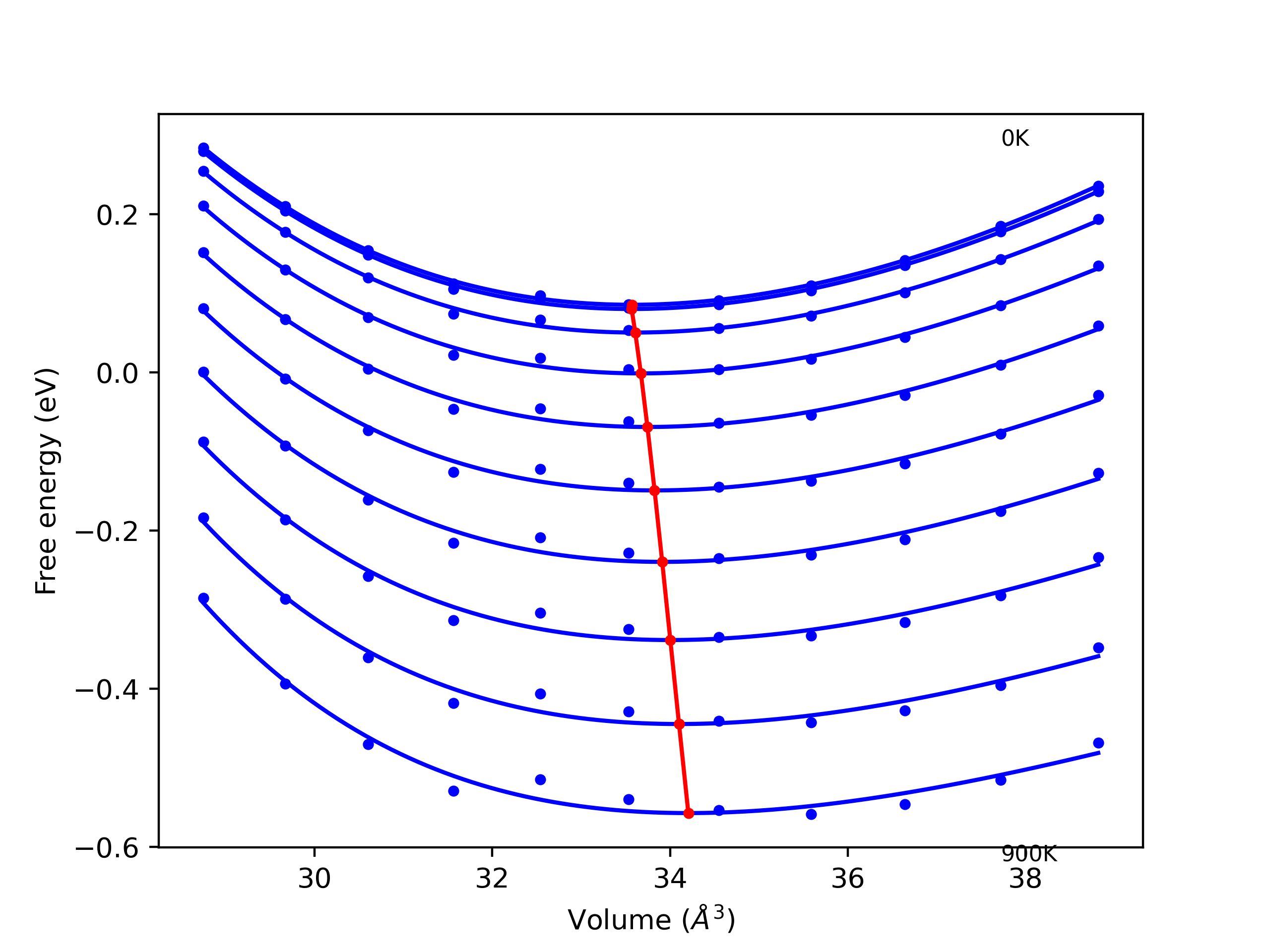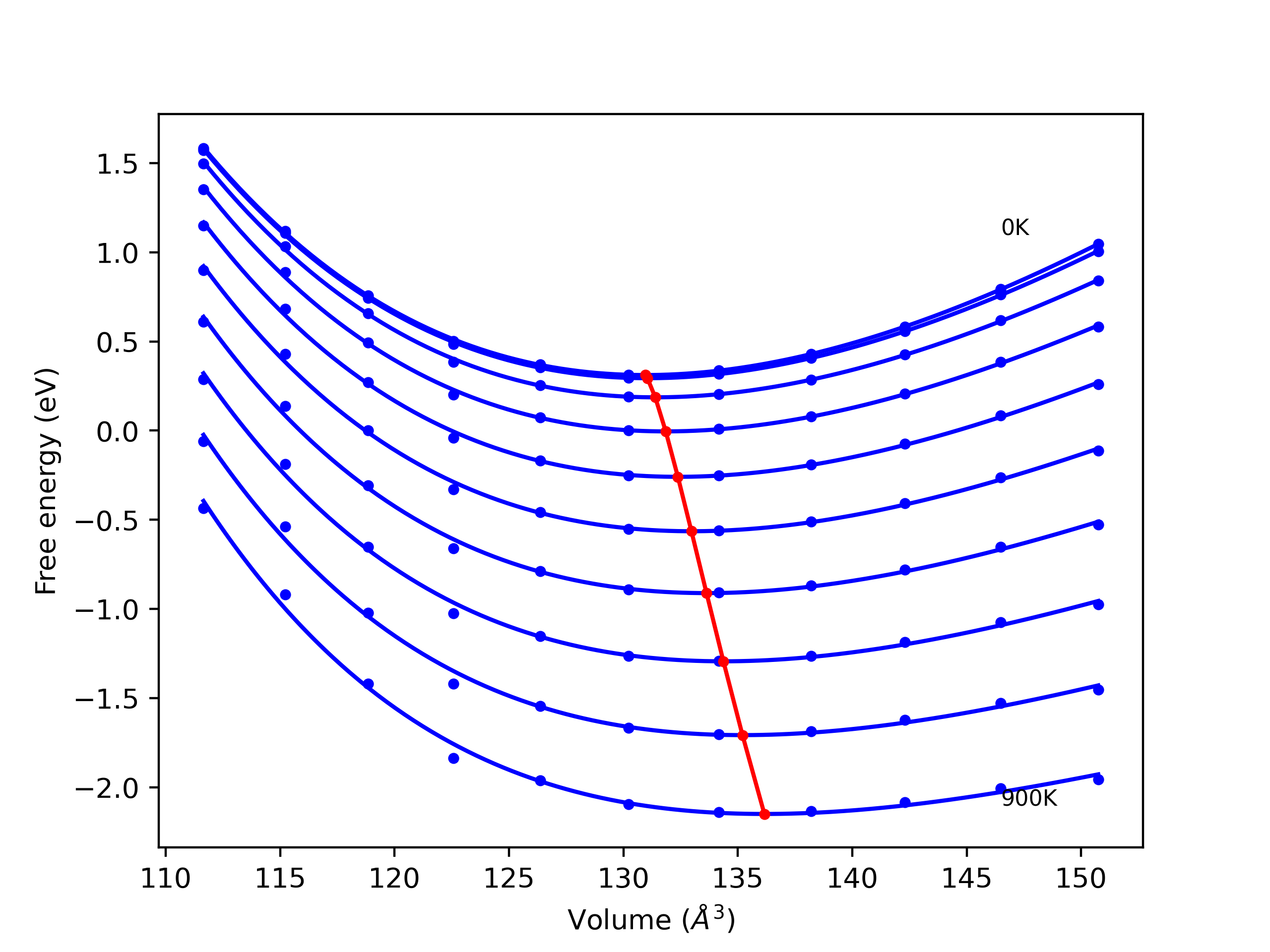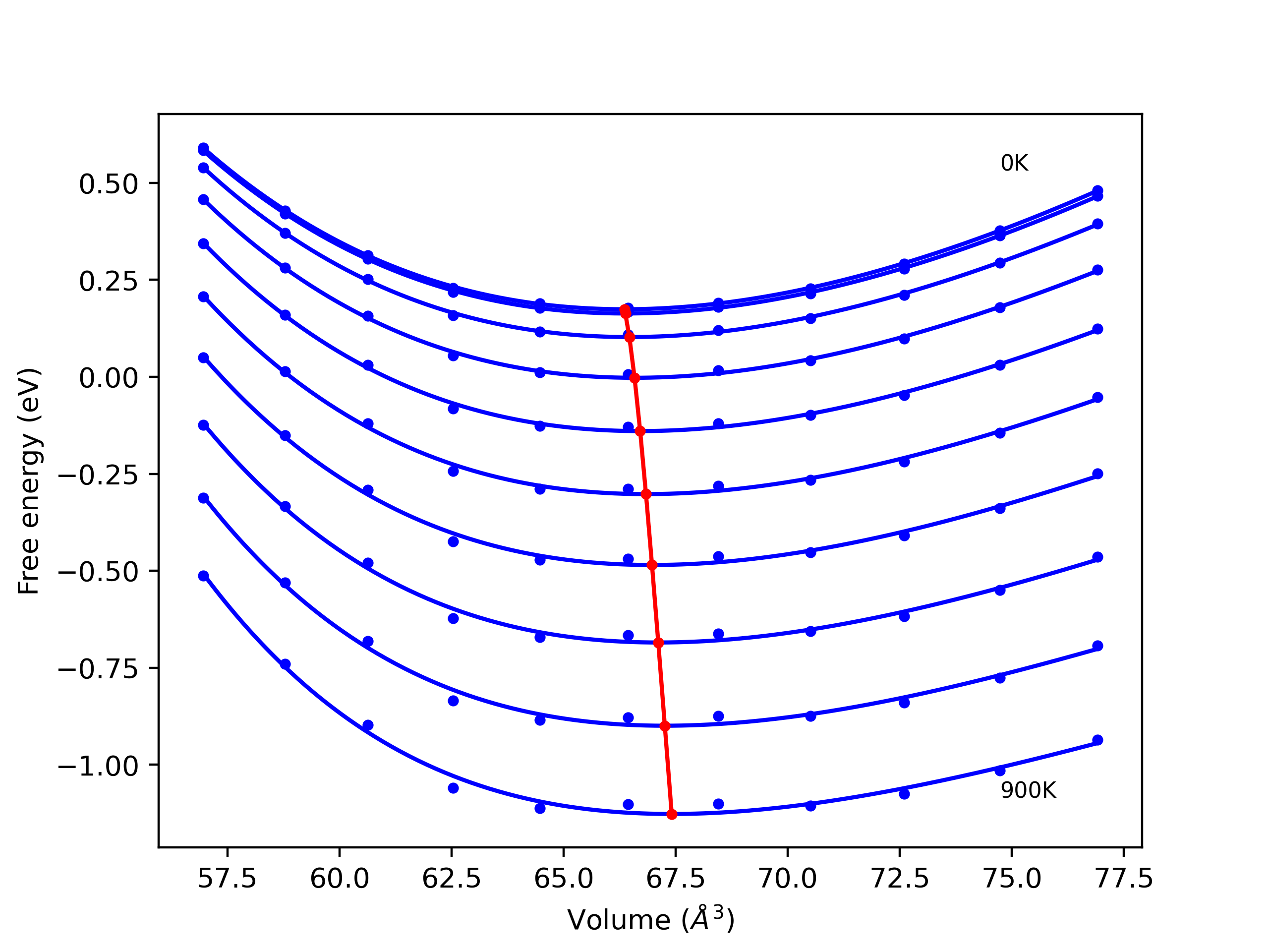 Phonon band structures and crystal properties estimated from quasi-harmonic approximation (QHA) calculations are displayed for select crystals. The calculations were performed using phonopy and LAMMPS. For the phonon calculations, 3x3 supercells of the potential-specific relaxed crystals were used. The QHA calculations were based on 11 strain states ranging from -0.05 to 0.05.