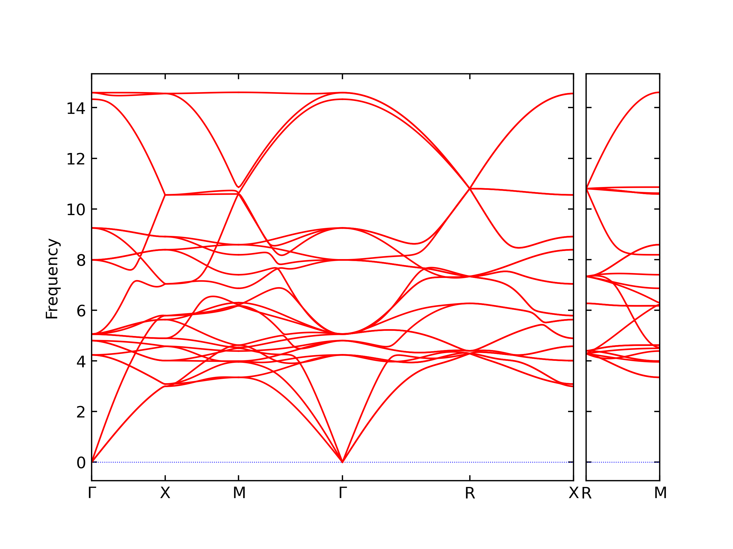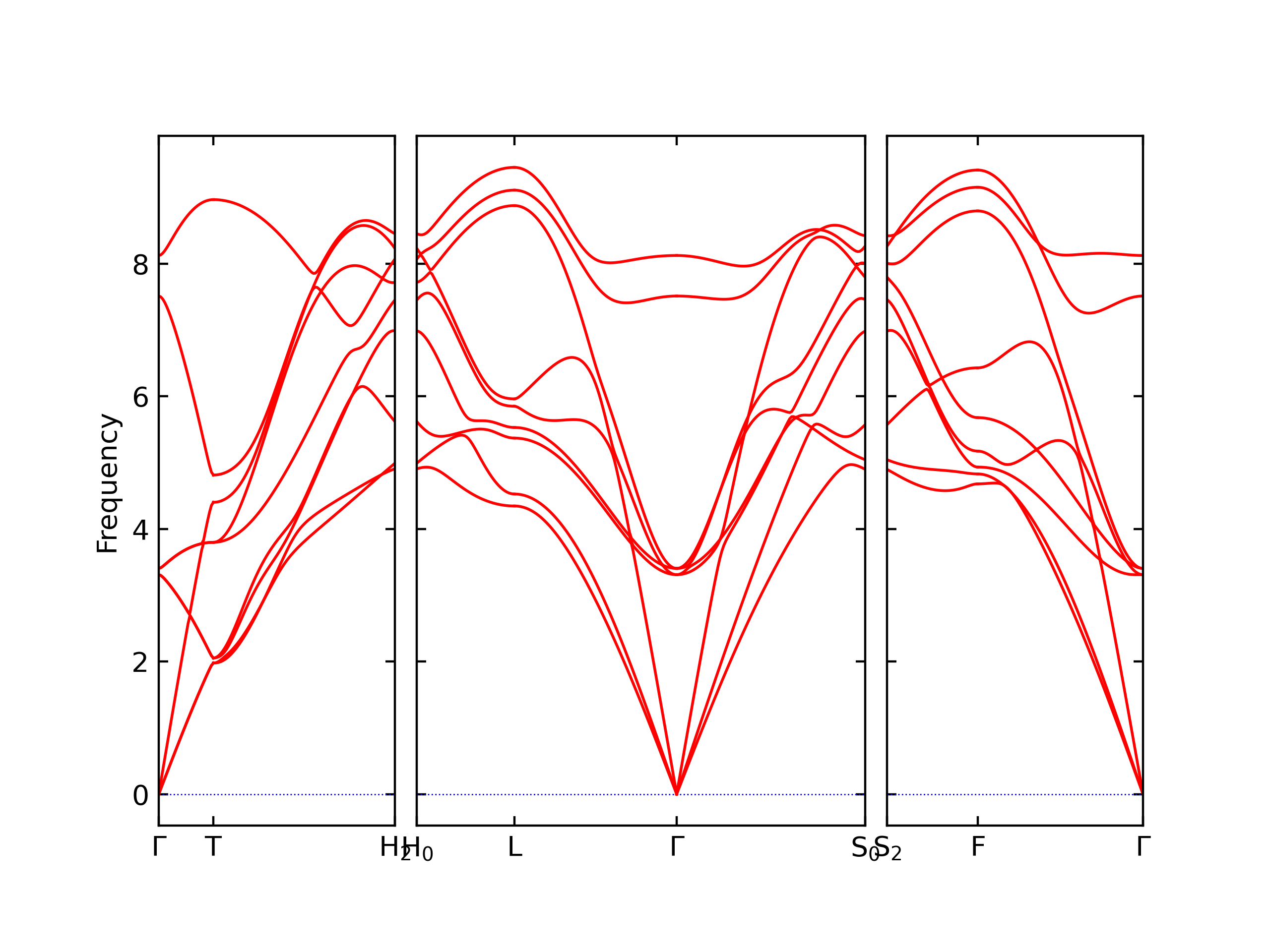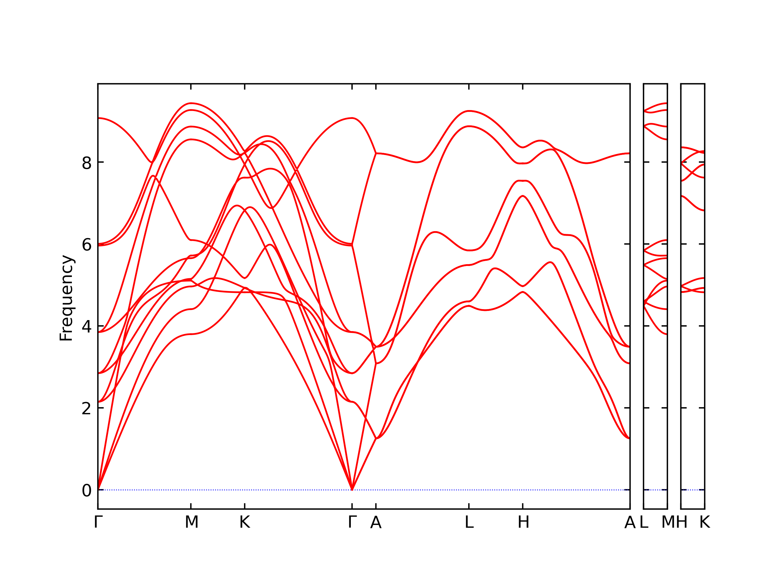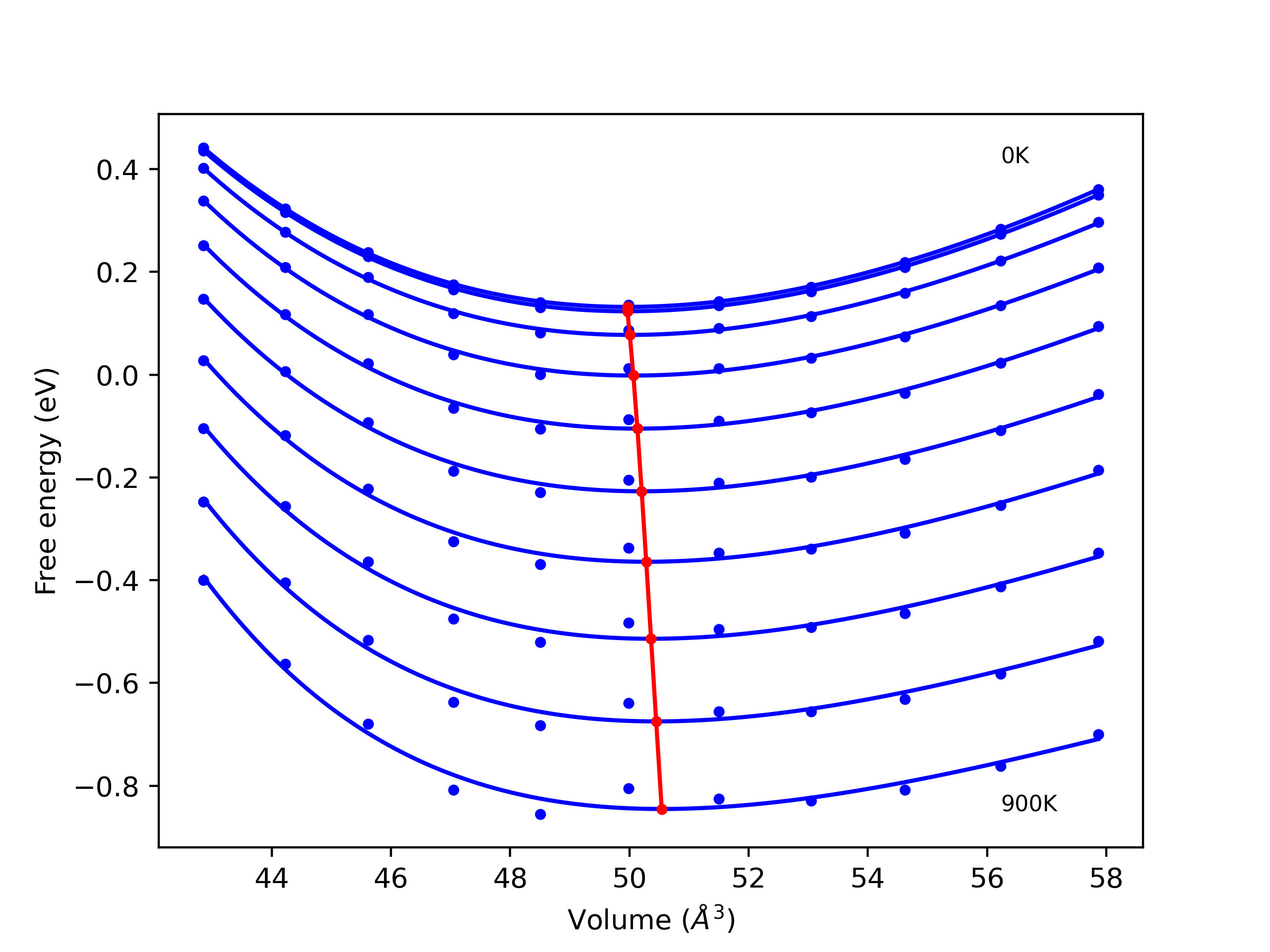 Phonon band structures and crystal properties estimated from quasi-harmonic approximation (QHA) calculations are displayed for select crystals. The calculations were performed using phonopy and LAMMPS. For the phonon calculations, 3x3 supercells of the potential-specific relaxed crystals were used. The QHA calculations were based on 11 strain states ranging from -0.05 to 0.05.
