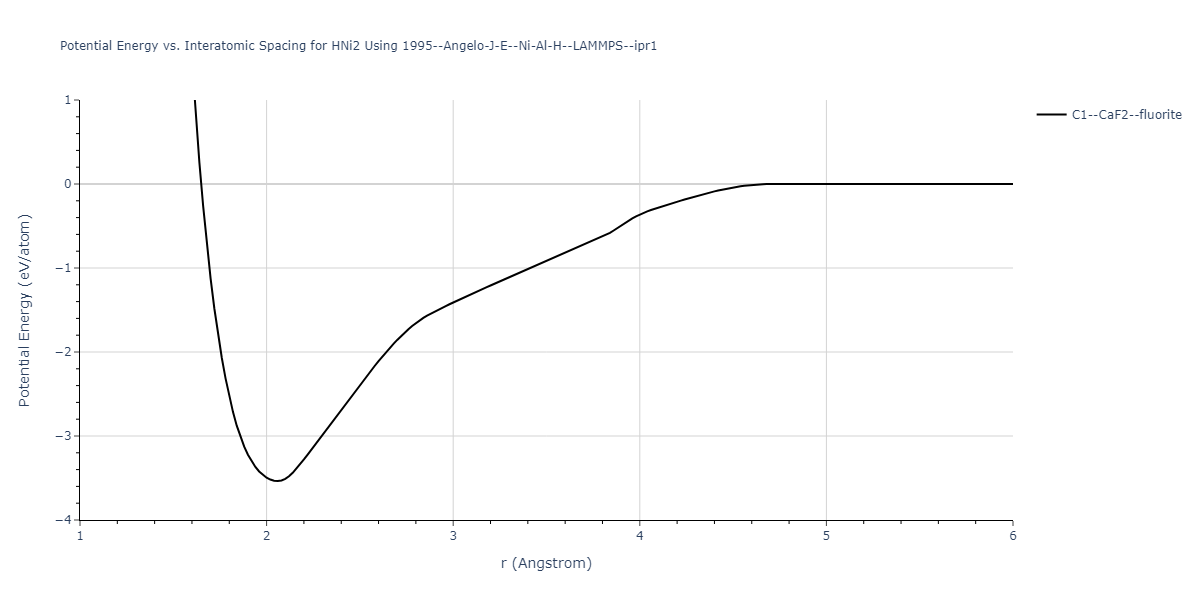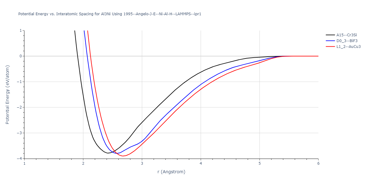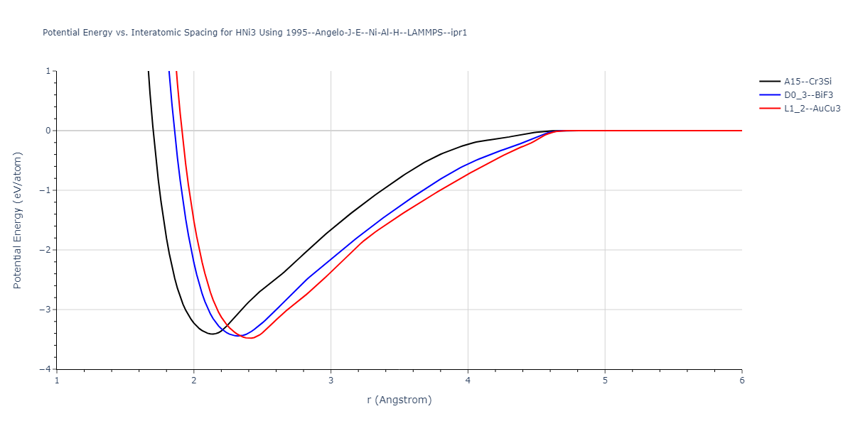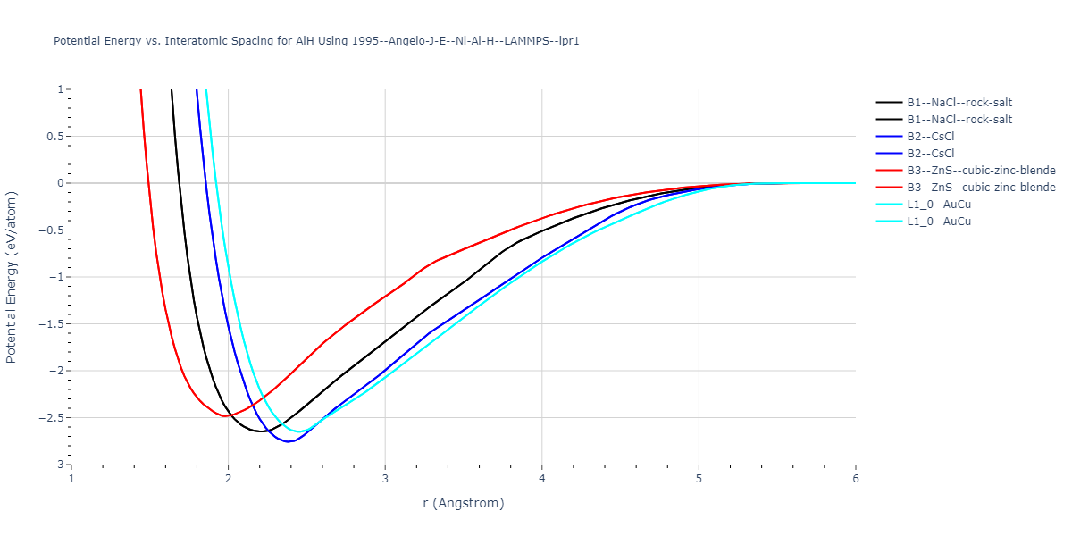 Plots of potential energy vs interatomic spacing, r, are shown below for a number of crystal structures. The structures are generated based on the ideal atomic positions and b/a and c/a lattice parameter ratios for a given crystal prototype. The size of the system is then uniformly scaled, and the energy calculated without relaxing the system. To obtain these plots, values of r are evaluated every 0.02 Å up to 6 Å.