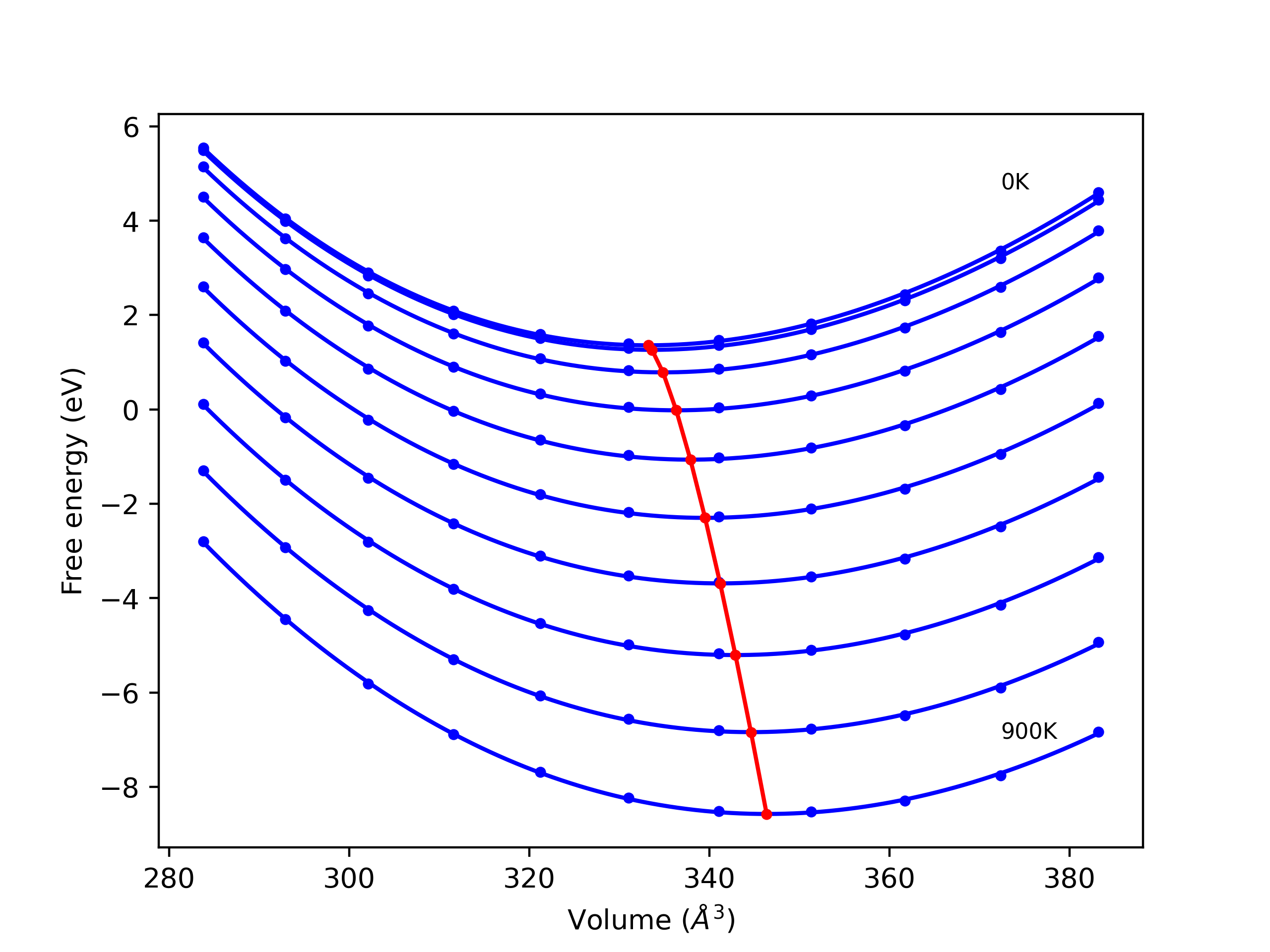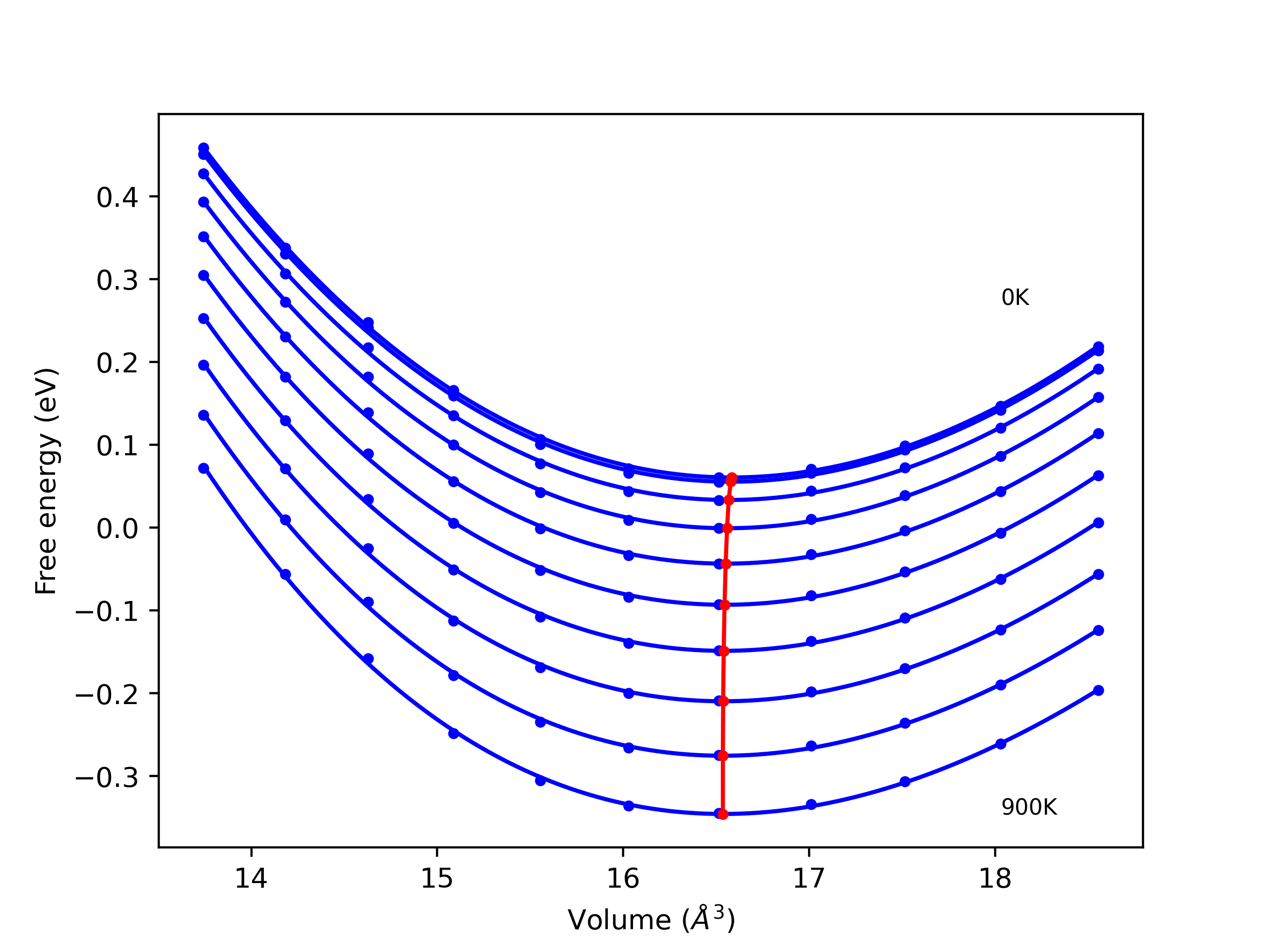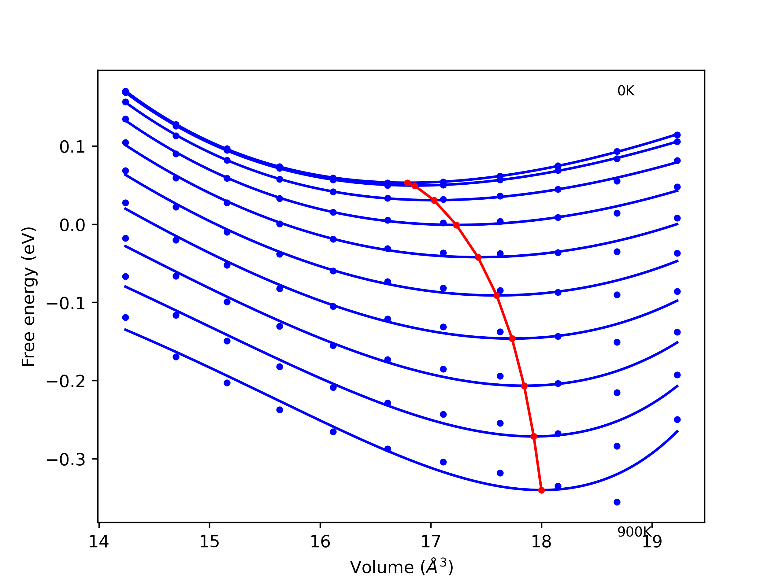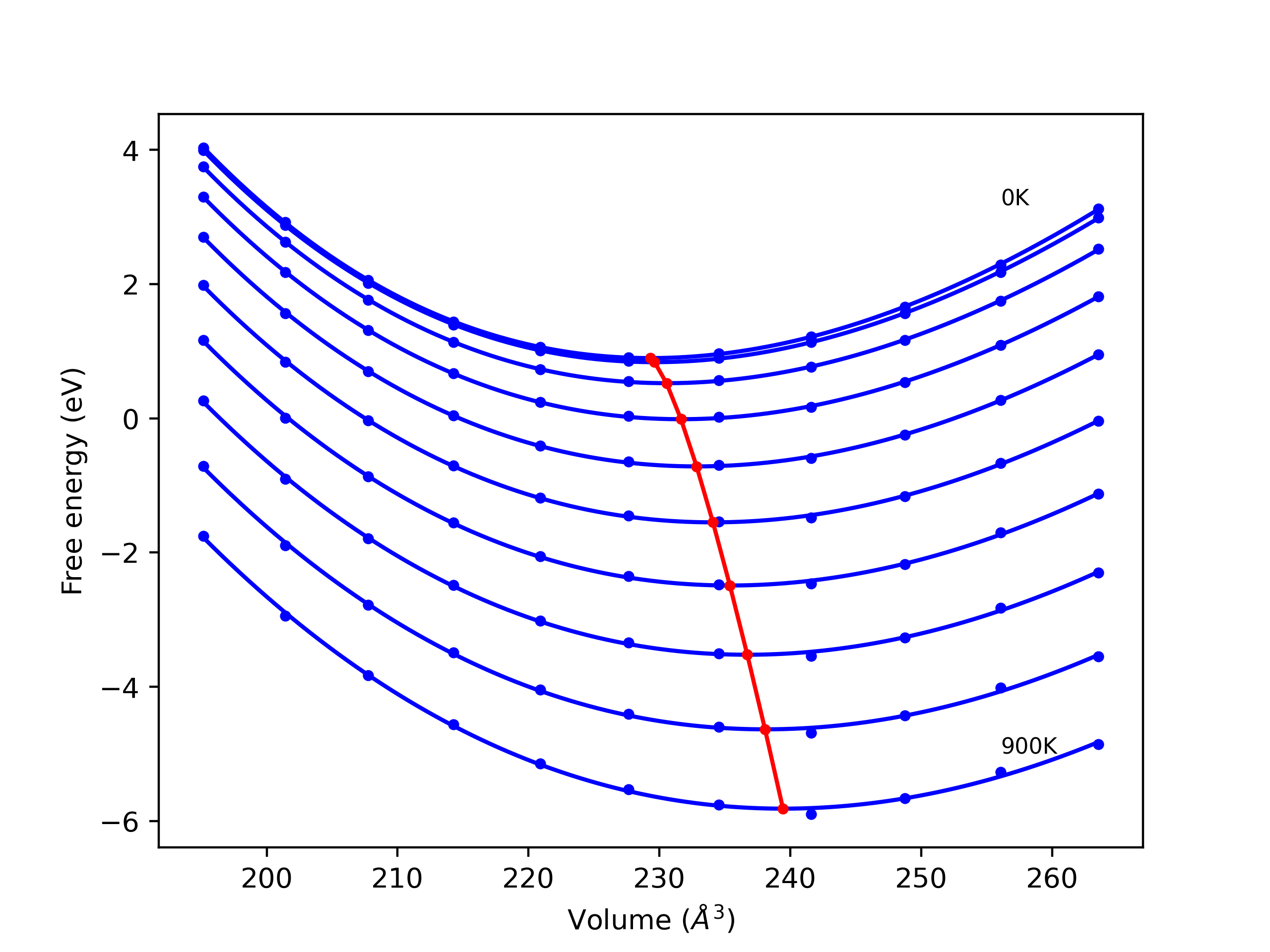 Plots of lattice and elastic constants are shown as a function of temperature. The 0K points were taken from the Crystal Structure Predictions and the Elastic Constants Predictions sections above for the unique crystal structures relaxed with the "dynamic" method. Starting from the 0 K relaxed crystal unit cells, supercell systems are created by replicating all three dimensions by the same multiplier to achieve at least 4000 atoms. The systems are then relaxed at 50 K and zero pressure using 1 million NPT steps. Lattice constants are estimated by averaging the measured box dimensions. Temperatures are iteratively increased by 50 K, with each subsequent relaxation calculation starting from the final atomic configuration at the previous temperature and relaxing for another 1 million steps.