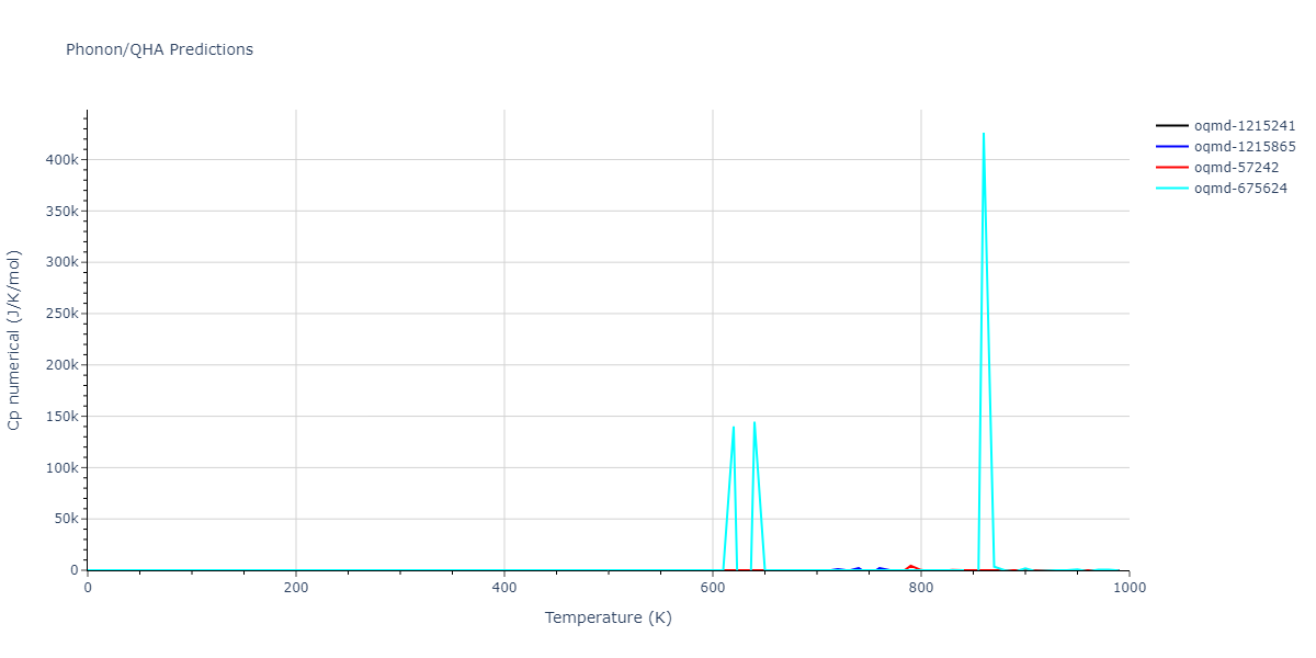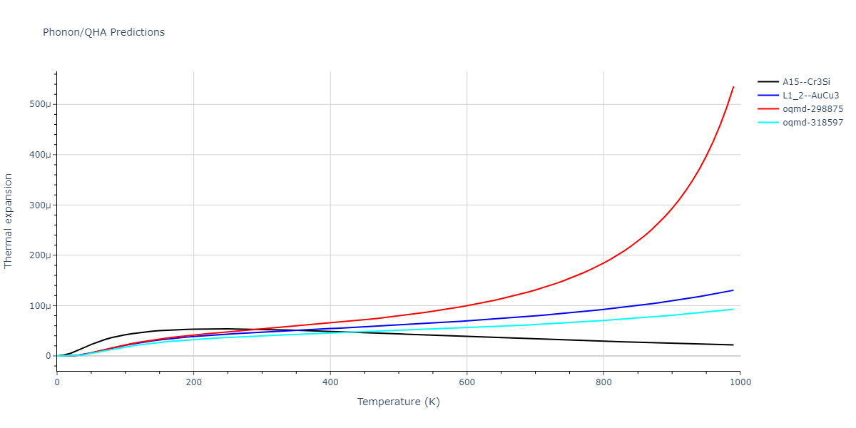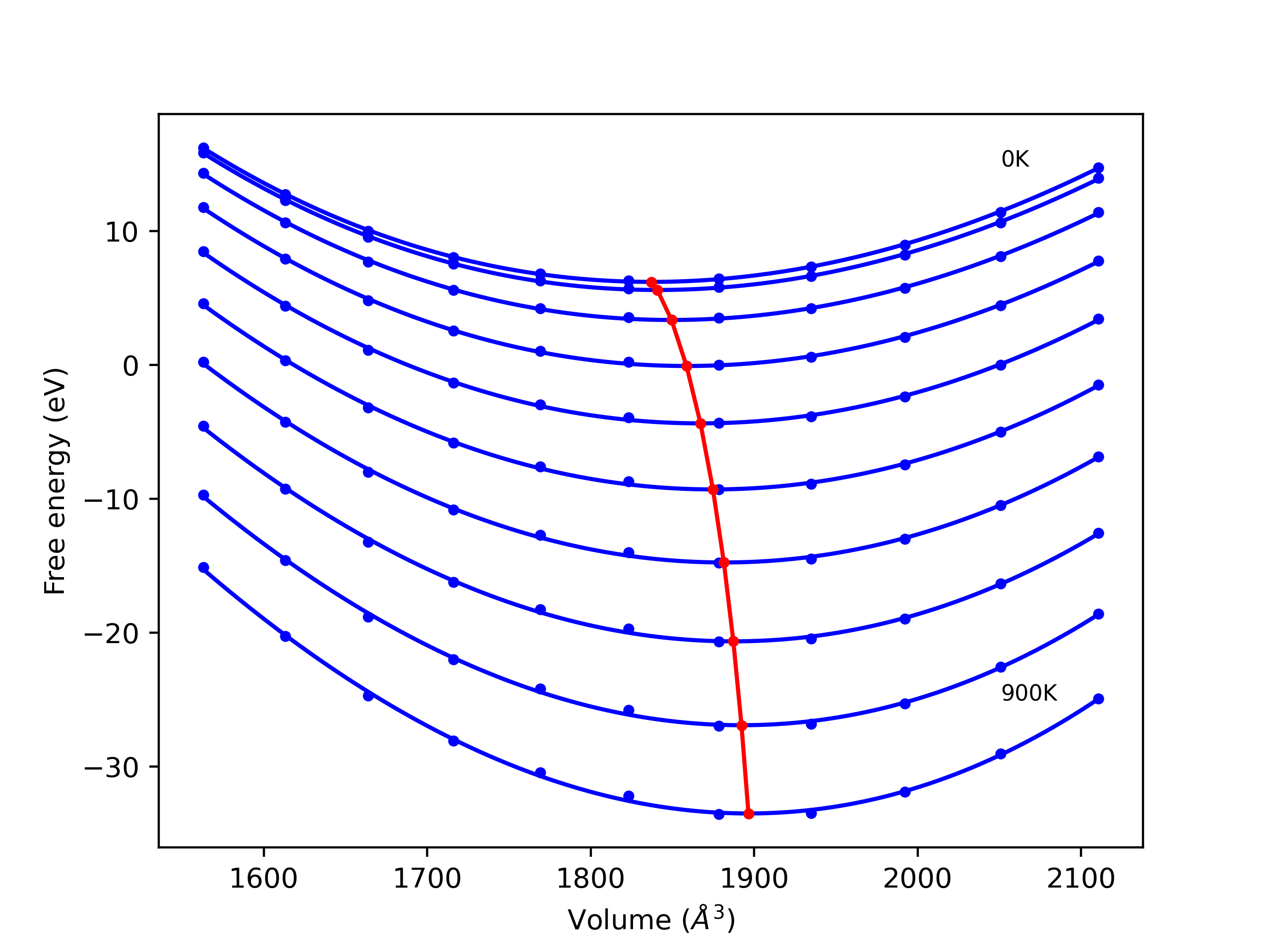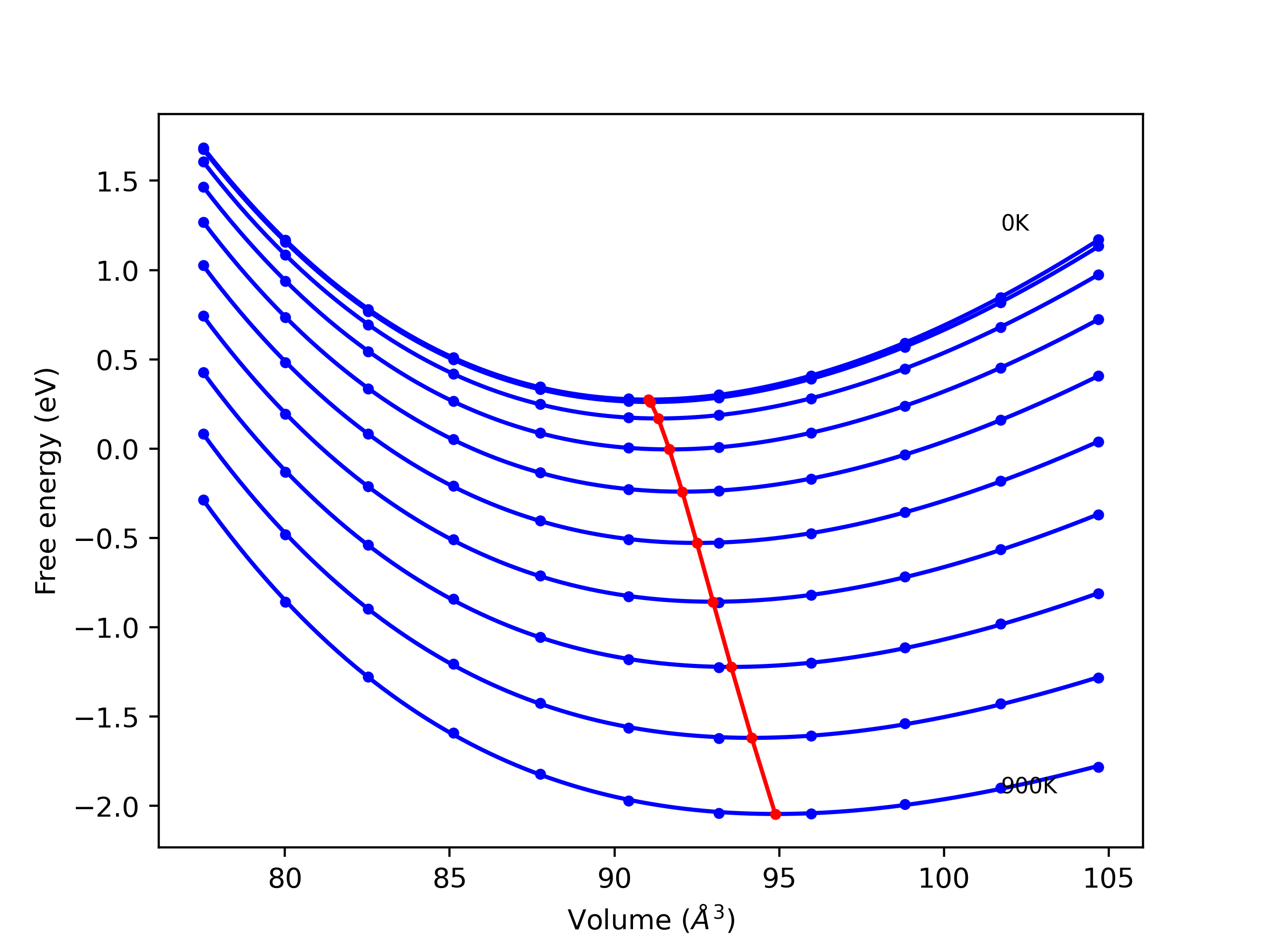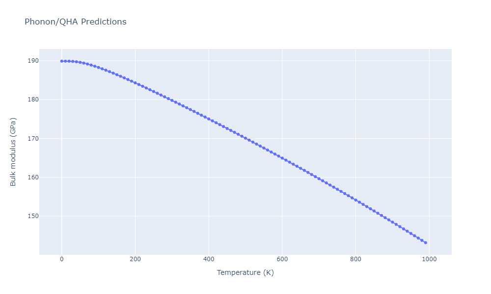 Plots of lattice and elastic constants are shown as a function of temperature. The 0K points were taken from the Crystal Structure Predictions and the Elastic Constants Predictions sections above for the unique crystal structures relaxed with the "dynamic" method. Starting from the 0 K relaxed crystal unit cells, supercell systems are created by replicating all three dimensions by the same multiplier to achieve at least 4000 atoms. The systems are then relaxed at 50 K and zero pressure using 1 million NPT steps. Lattice constants are estimated by averaging the measured box dimensions. Temperatures are iteratively increased by 50 K, with each subsequent relaxation calculation starting from the final atomic configuration at the previous temperature and relaxing for another 1 million steps.