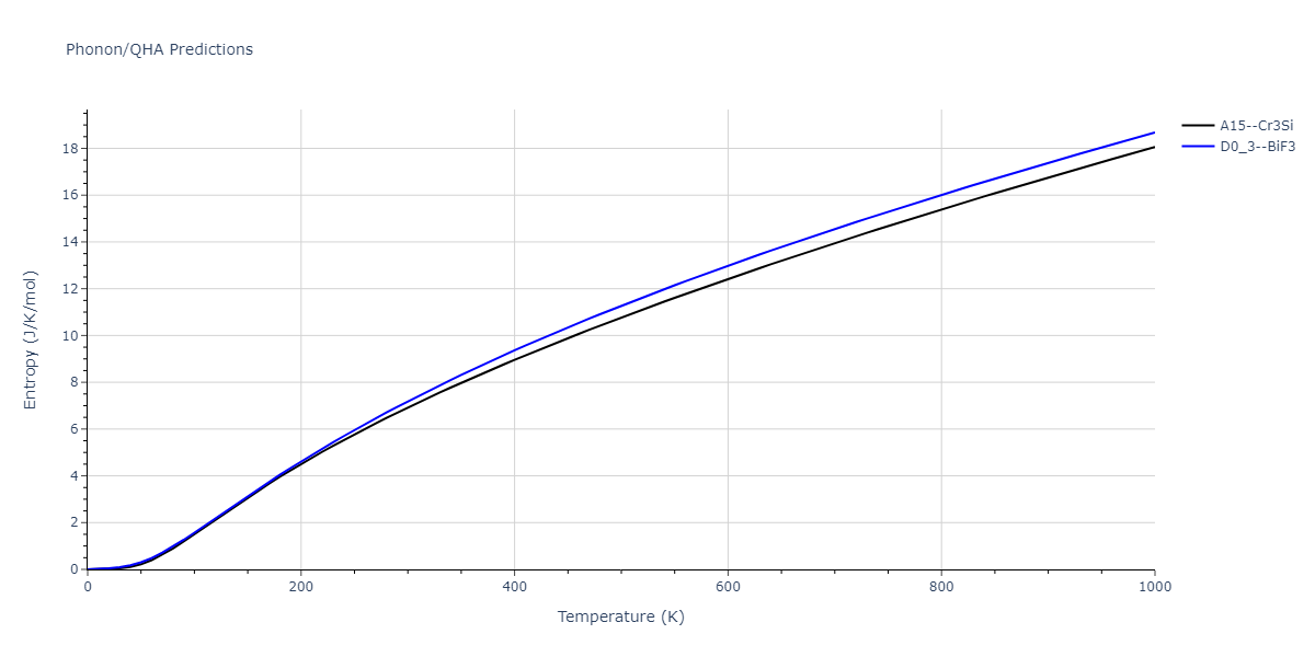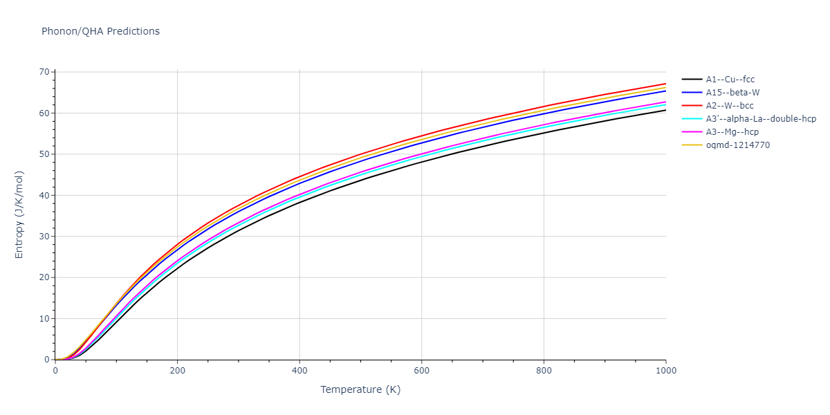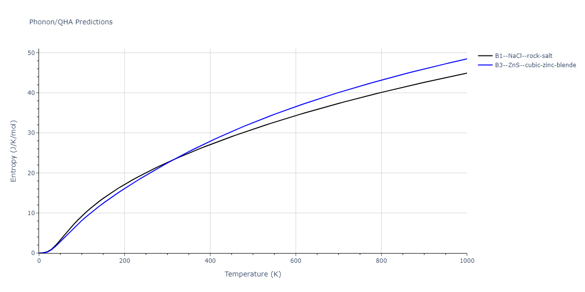 The Gibbs energies of the phases are estimated using thermodynamic integration between the interatomic potential in question and a simpler model with known Gibbs free energy values. For solids, the reference model is an Einstein solid, while for liquids it is the Uhlenbeck-Ford potential. Besides a short run at the start of the solid calculations to estimate Einstein model spring constants, the two calculations proceed similarly. Starting with the final relaxation configurations, the systems are stabilized for 25,000 steps. Then, over the next 50,000 steps the potential is swapped out for the reference potential. The system is then stabilized for another 25,000 steps with the reference model before a reverse swap of 50,000 steps is performed. The simulation ends with one final 25,000 step stabilization period. From the simulation, the irreversible work of transformation is estimated and used to compute the absolute Gibbs free energy of the target phase and potential relative to the reference potential. Entropy is estimated as the difference in enthalpy and Gibbs free energy and divided by temperature.