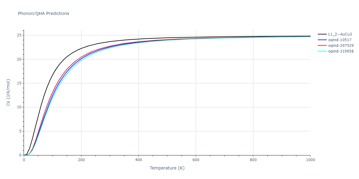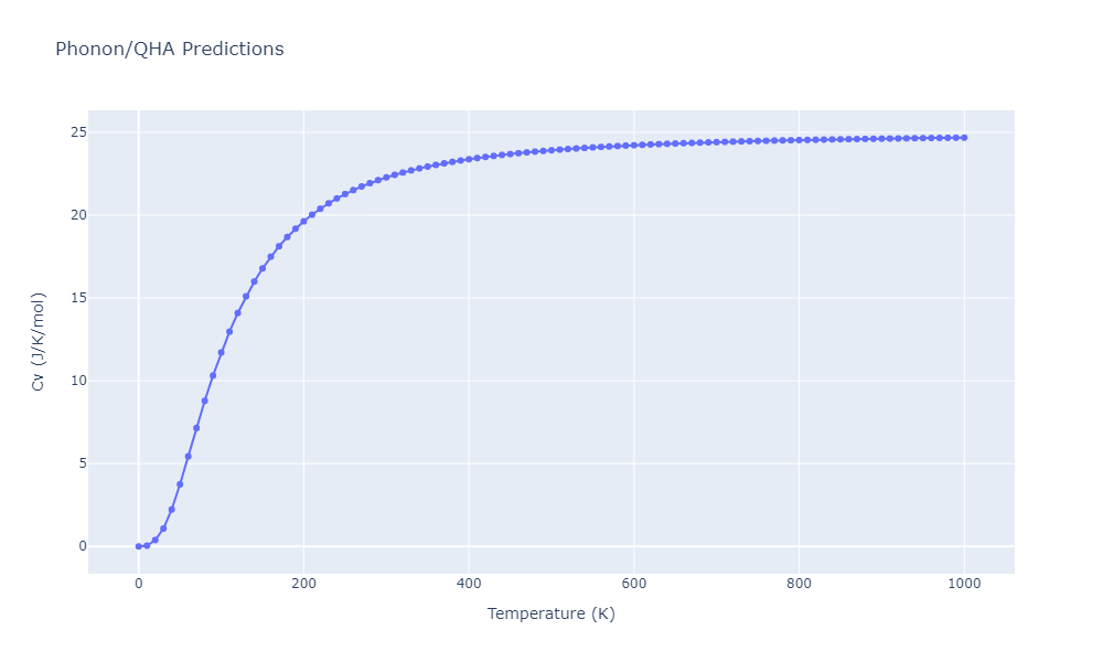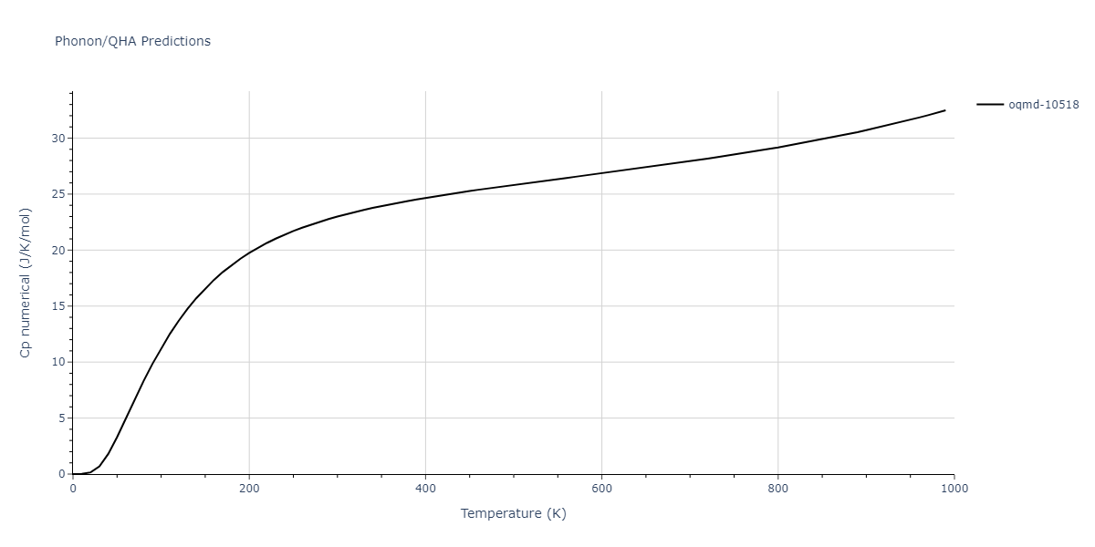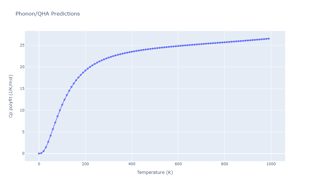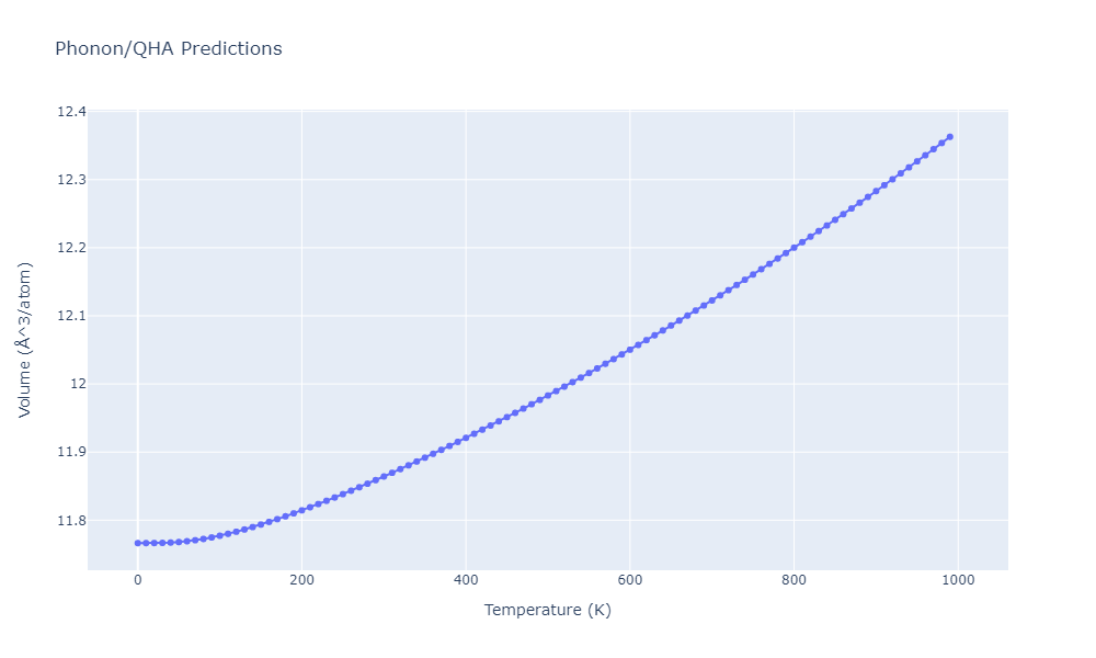 Plots of internal energy, Gibbs free energy, entropy, heat capacity and volume are shown here as a function of temperature for various crystal structures and liquid phases. The included crystal structures correspond to those in the Solid Structures vs. Temperature section, and the liquid phases to those in the Liquid Properties section. Internal energy and volume are taken from the associated structure relaxations mentioned in those previous sections. Constant pressure heat capacity is estimated using 3-point numerical derivatives of enthalpy versus temperature. Note that since all simulations done here are at 0 pressure, internal energy and enthalpy are equivalent.