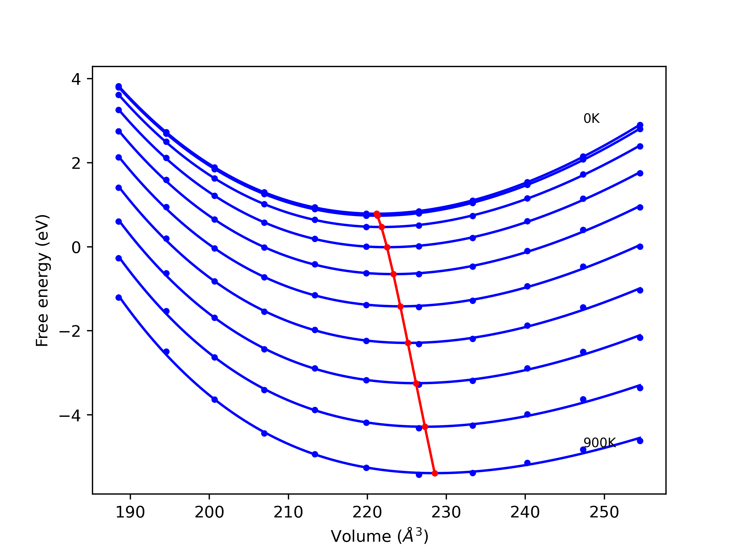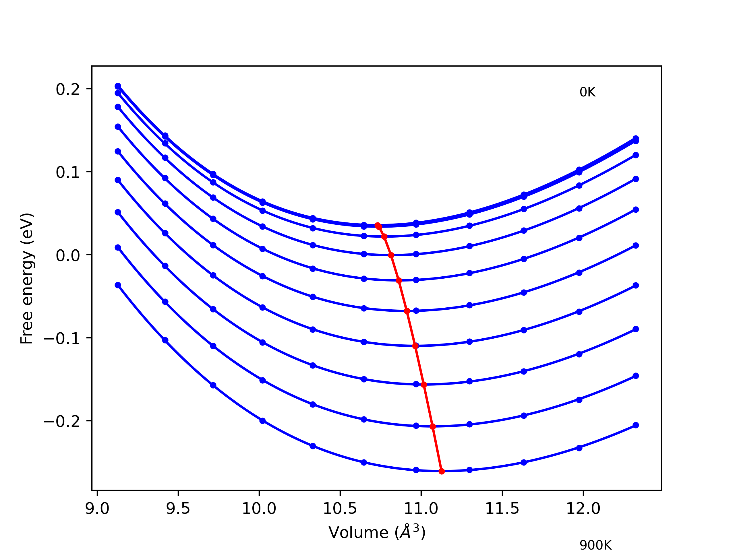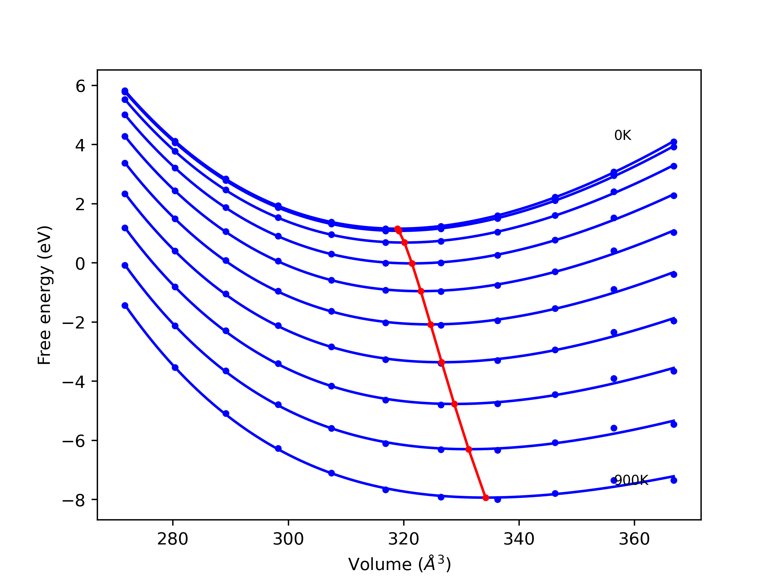 Phonon band structures and crystal properties estimated from quasi-harmonic approximation (QHA) calculations are displayed for select crystals. The calculations were performed using phonopy and LAMMPS. For the phonon calculations, 3x3 supercells of the potential-specific relaxed crystals were used. The QHA calculations were based on 11 strain states ranging from -0.05 to 0.05.