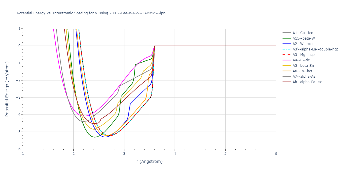 Plots of potential energy vs interatomic spacing, r, are shown below for a number of crystal structures. The structures are generated based on the ideal atomic positions and b/a and c/a lattice parameter ratios for a given crystal prototype. The size of the system is then uniformly scaled, and the energy calculated without relaxing the system. To obtain these plots, values of r are evaluated every 0.02 Å up to 6 Å.