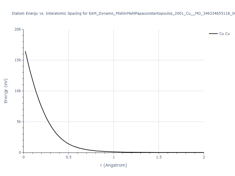Plots of the potential energy vs interatomic spacing, r, are shown below for all diatom sets associated with the interatomic potential. This calculation provides insights into the functional form of the potential's two-body interactions. A system consisting of only two atoms is created, and the potential energy is evaluated for the atoms separated by 0.02 Å <= r <= 6.0> Å in intervals of 0.02 Å. Two plots are shown: one for the "standard" interaction distance range, and one for small values of r. The small r plot is useful for determining whether the potential is suitable for radiation studies.