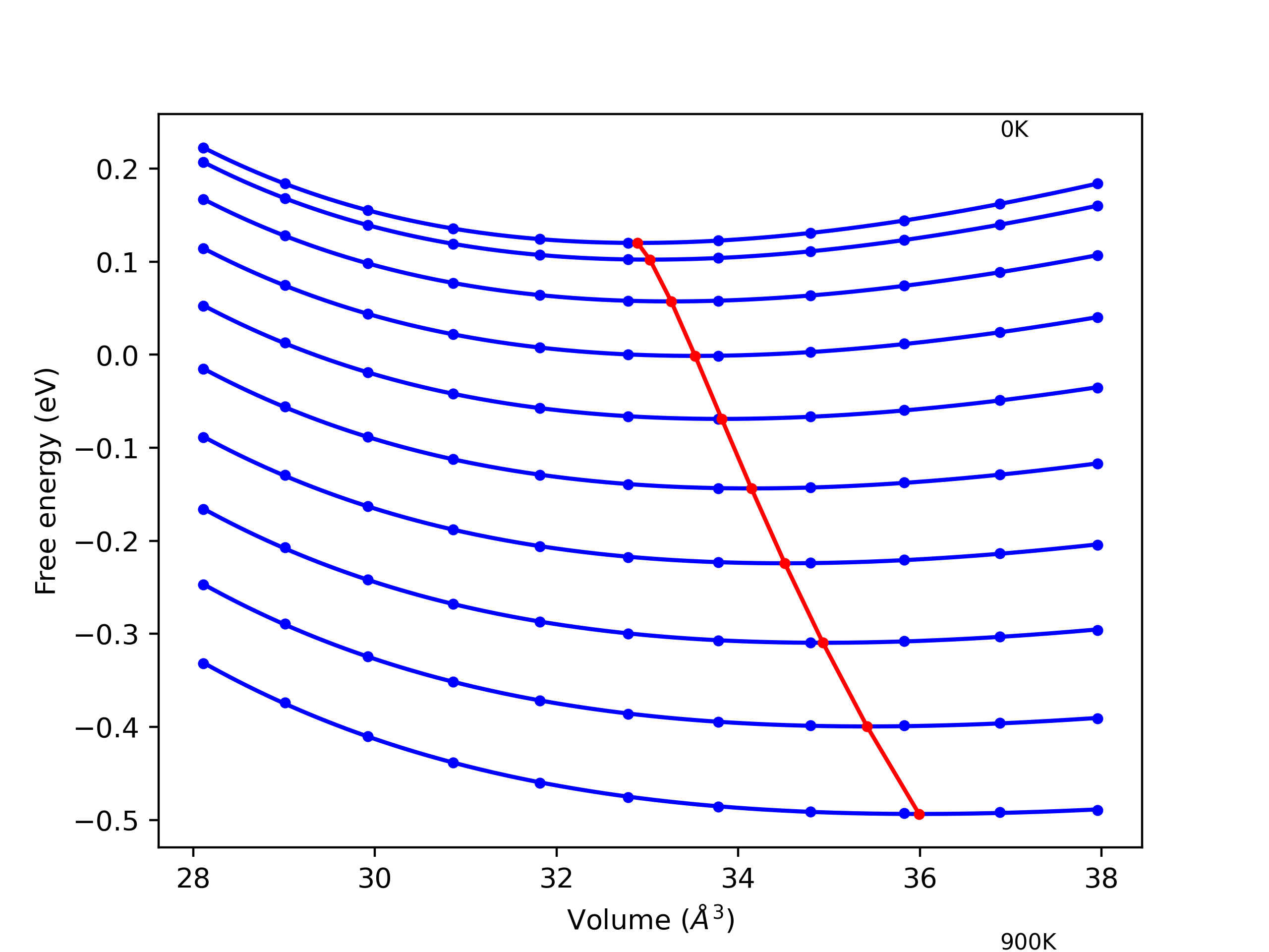 Phonon band structures and crystal properties estimated from quasi-harmonic approximation (QHA) calculations are displayed for select crystals. The calculations were performed using phonopy and LAMMPS. For the phonon calculations, 3x3 supercells of the potential-specific relaxed crystals were used. The QHA calculations were based on 11 strain states ranging from -0.05 to 0.05.