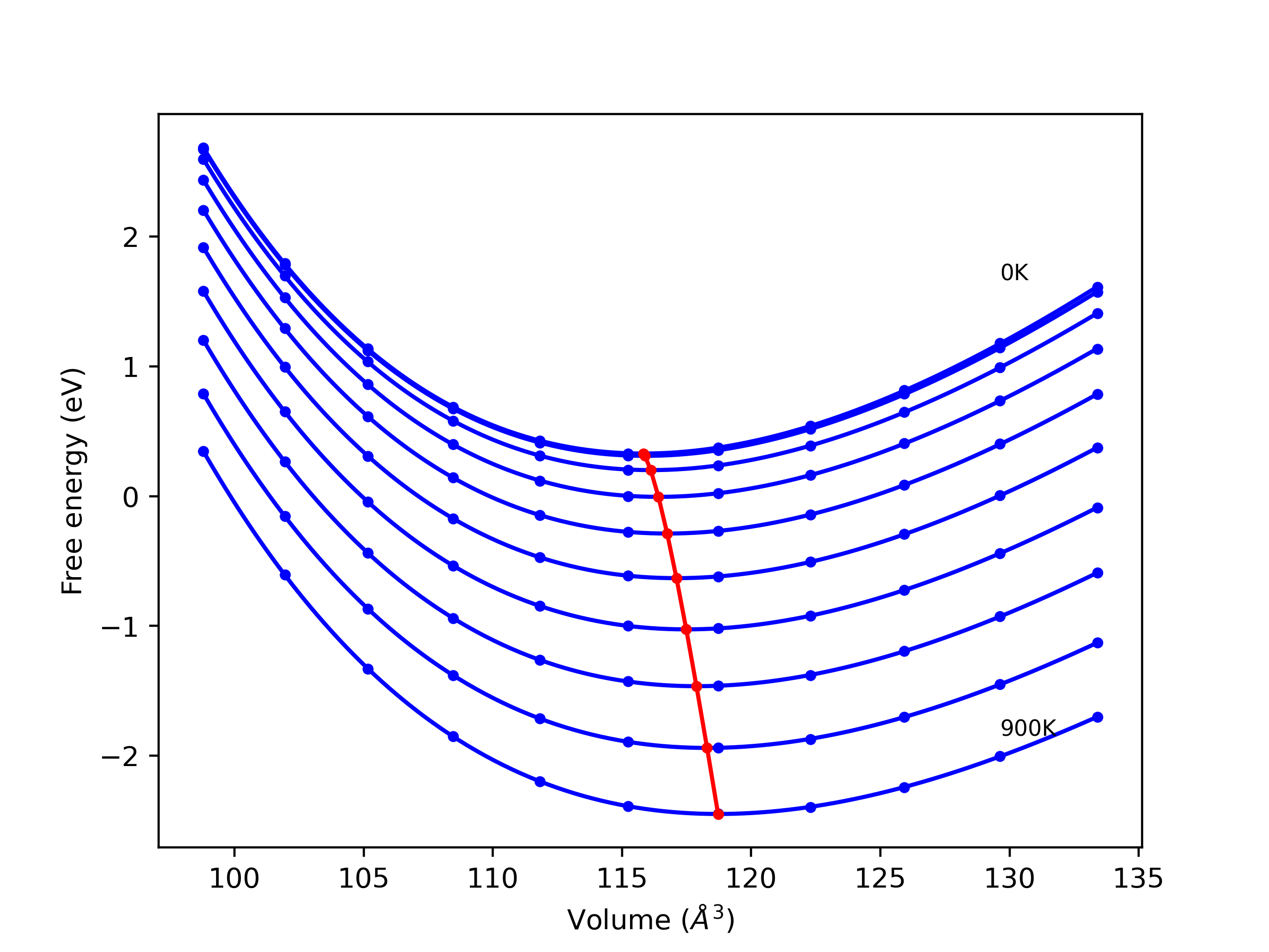 Phonon band structures and crystal properties estimated from quasi-harmonic approximation (QHA) calculations are displayed for select crystals. The calculations were performed using phonopy and LAMMPS. For the phonon calculations, 3x3 supercells of the potential-specific relaxed crystals were used. The QHA calculations were based on 11 strain states ranging from -0.05 to 0.05.