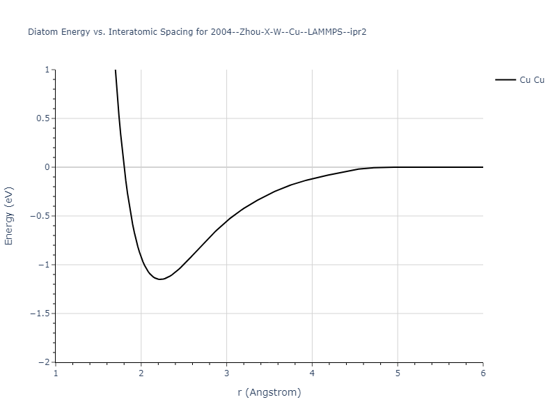 Plots of the potential energy vs interatomic spacing, r, are shown below for all diatom sets associated with the interatomic potential. This calculation provides insights into the functional form of the potential's two-body interactions. A system consisting of only two atoms is created, and the potential energy is evaluated for the atoms separated by 0.02 Å <= r <= 6.0> Å in intervals of 0.02 Å. Two plots are shown: one for the "standard" interaction distance range, and one for small values of r. The small r plot is useful for determining whether the potential is suitable for radiation studies.