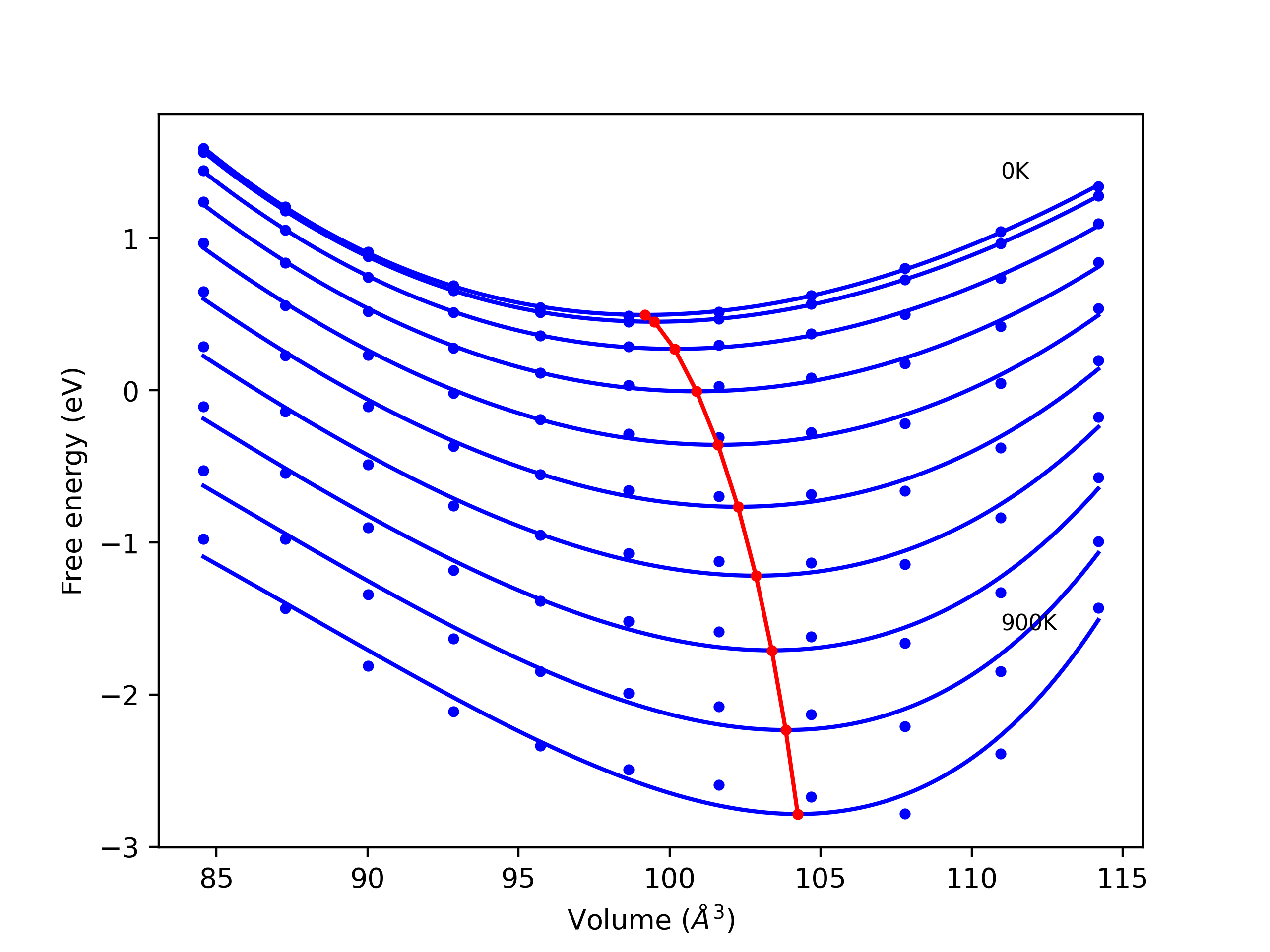 Phonon band structures and crystal properties estimated from quasi-harmonic approximation (QHA) calculations are displayed for select crystals. The calculations were performed using phonopy and LAMMPS. For the phonon calculations, 3x3 supercells of the potential-specific relaxed crystals were used. The QHA calculations were based on 11 strain states ranging from -0.05 to 0.05.