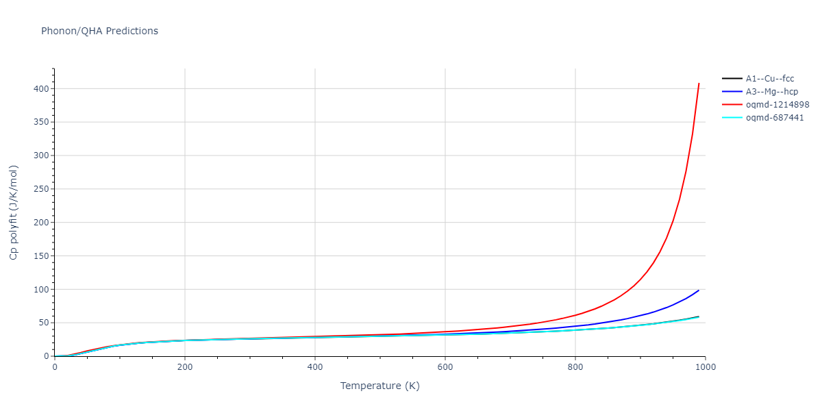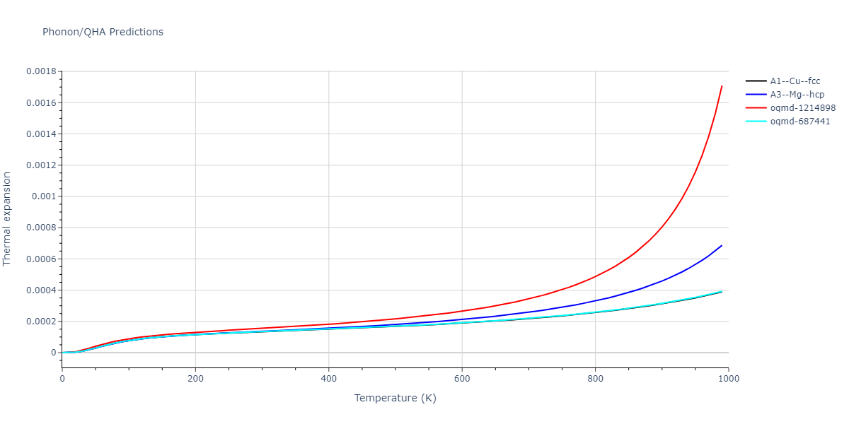 Phonon band structures and crystal properties estimated from quasi-harmonic approximation (QHA) calculations are displayed for select crystals. The calculations were performed using phonopy and LAMMPS. For the phonon calculations, 3x3 supercells of the potential-specific relaxed crystals were used. The QHA calculations were based on 11 strain states ranging from -0.05 to 0.05.
