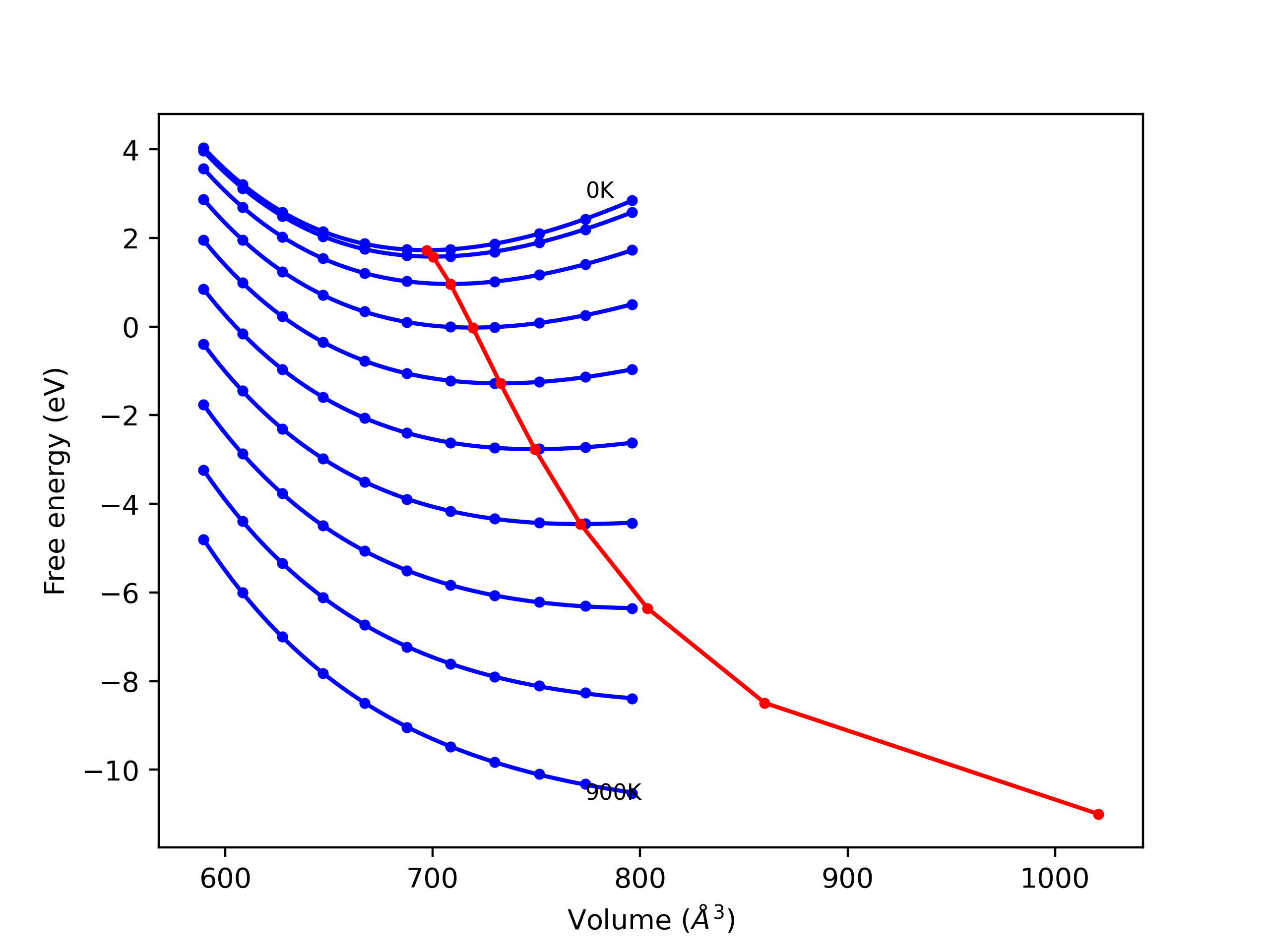 • The thermodynamic properties estimated from QHA are based on the assumption that only volumetric changes affect the phonon behaviors as the temperature changes. This tends to give good predictions at lower temperatures but ignores anharmonic effects such as phonon coupling and vacancy formation that can be important at higher temperatures.