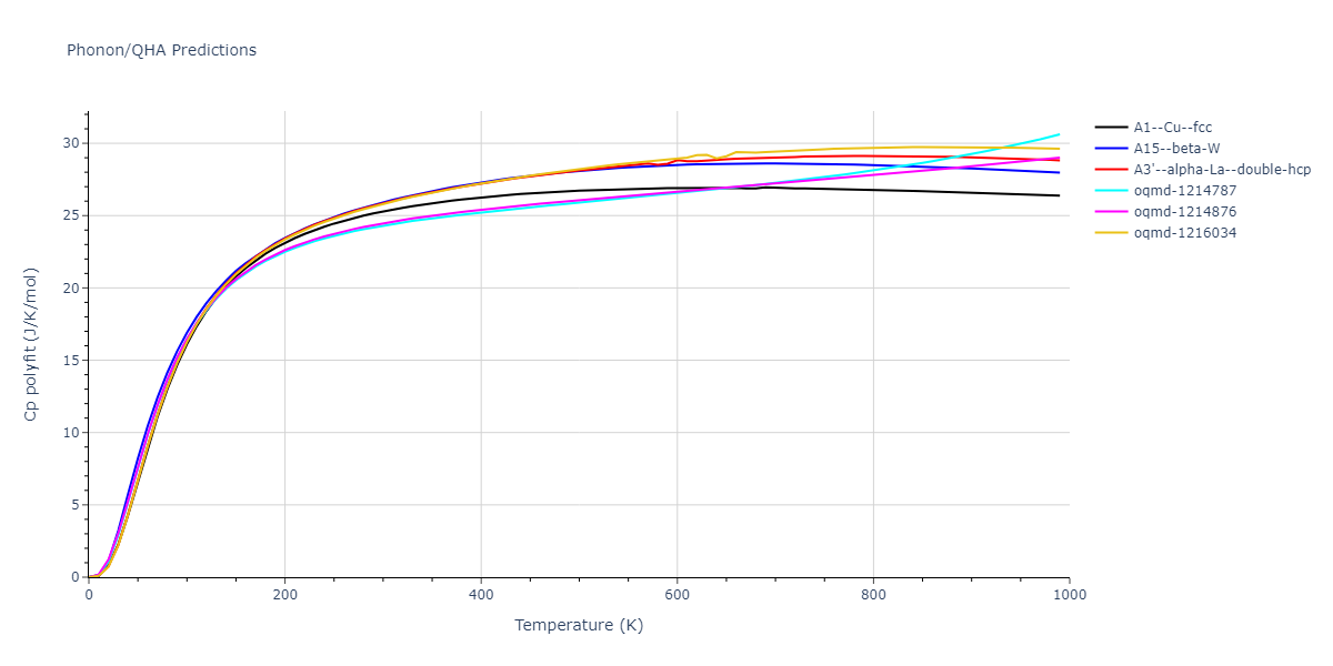 Phonon band structures and crystal properties estimated from quasi-harmonic approximation (QHA) calculations are displayed for select crystals. The calculations were performed using phonopy and LAMMPS. For the phonon calculations, 3x3 supercells of the potential-specific relaxed crystals were used. The QHA calculations were based on 11 strain states ranging from -0.05 to 0.05.