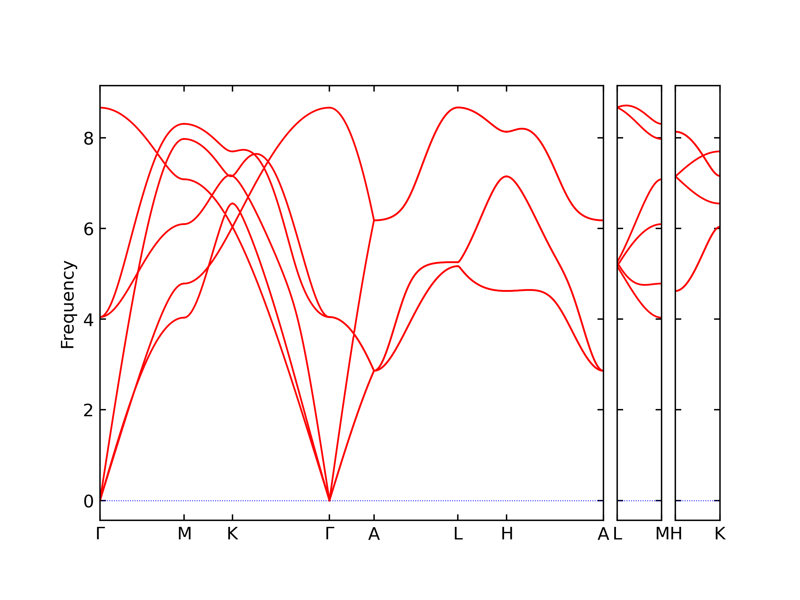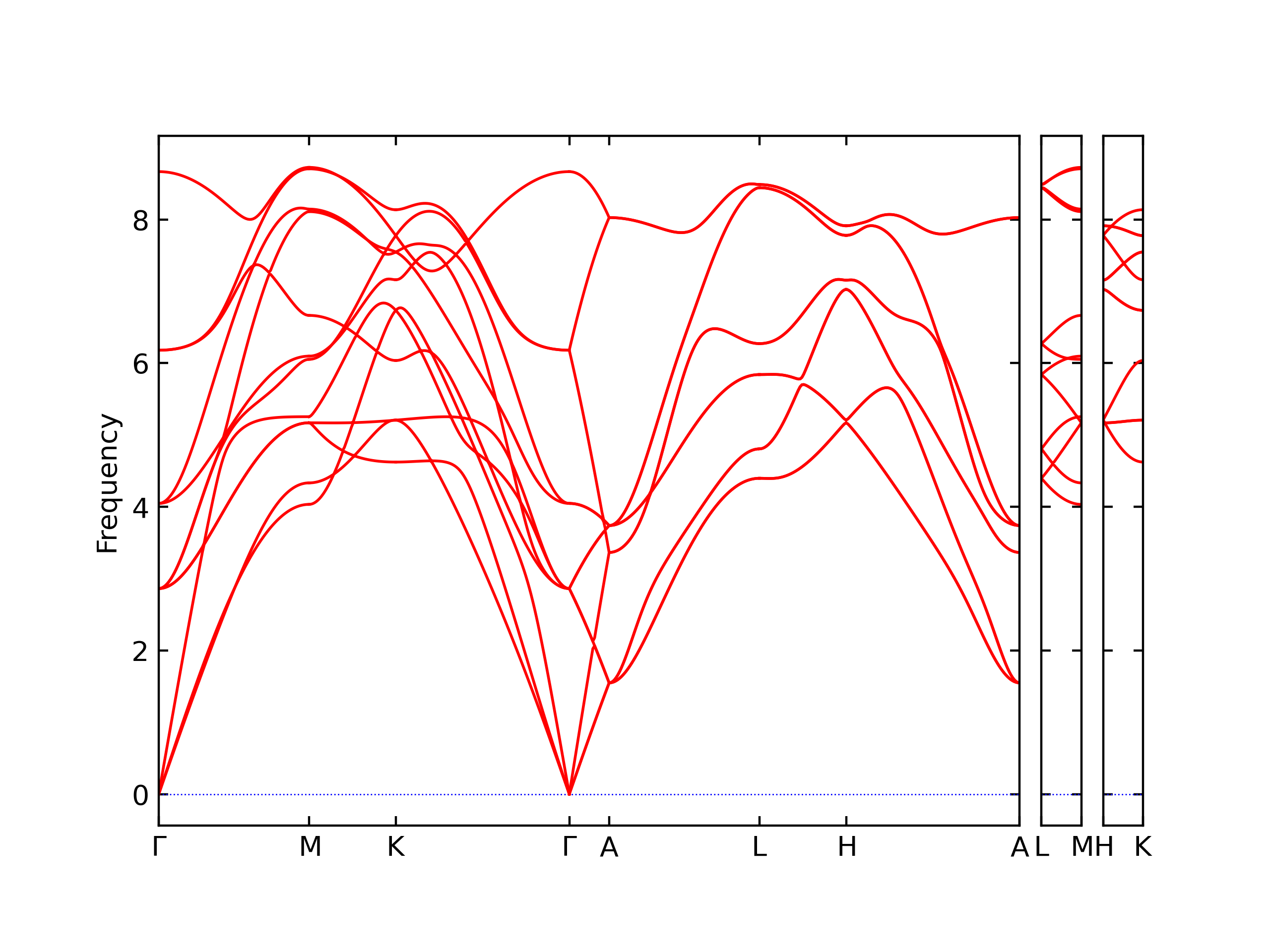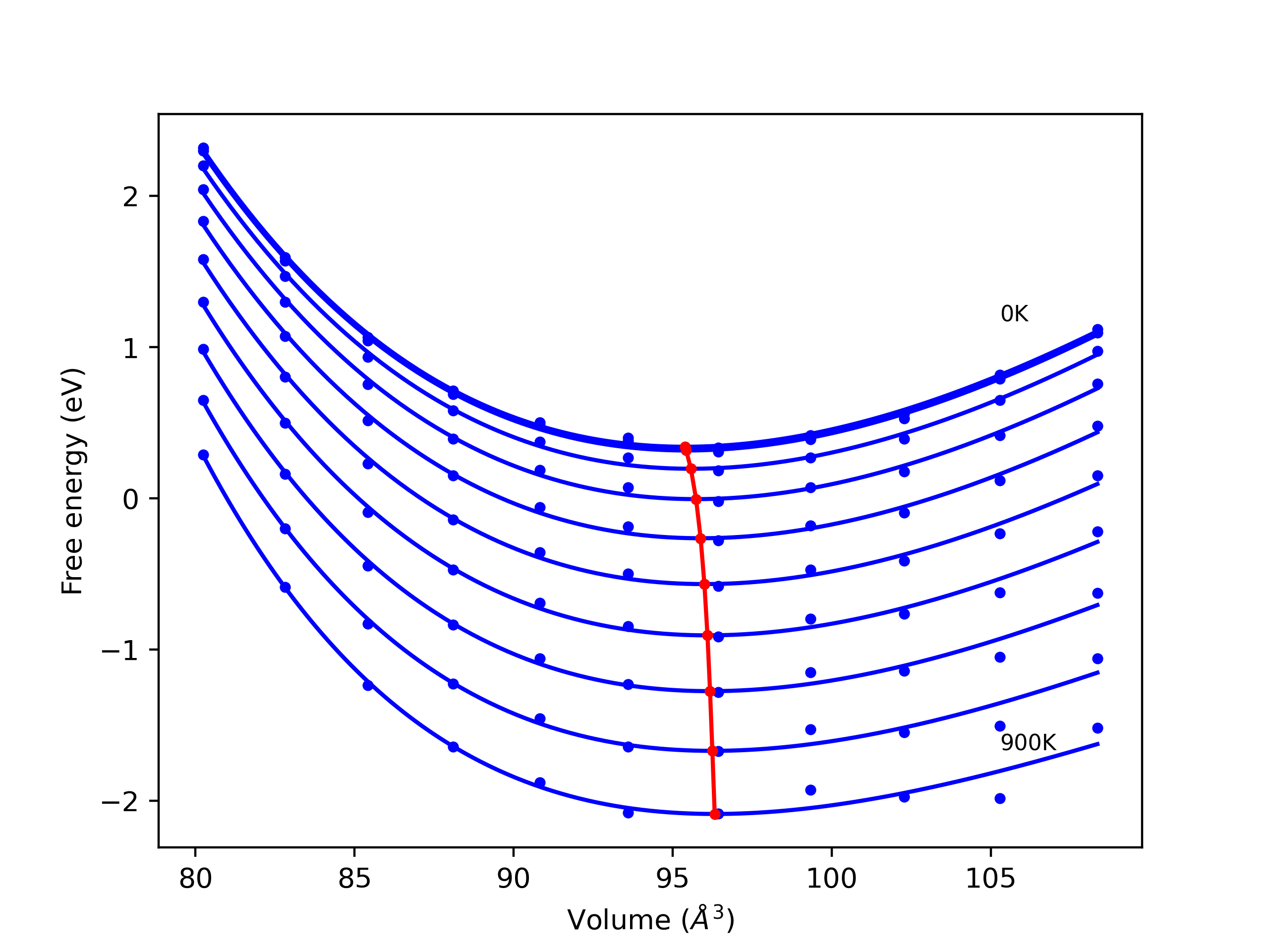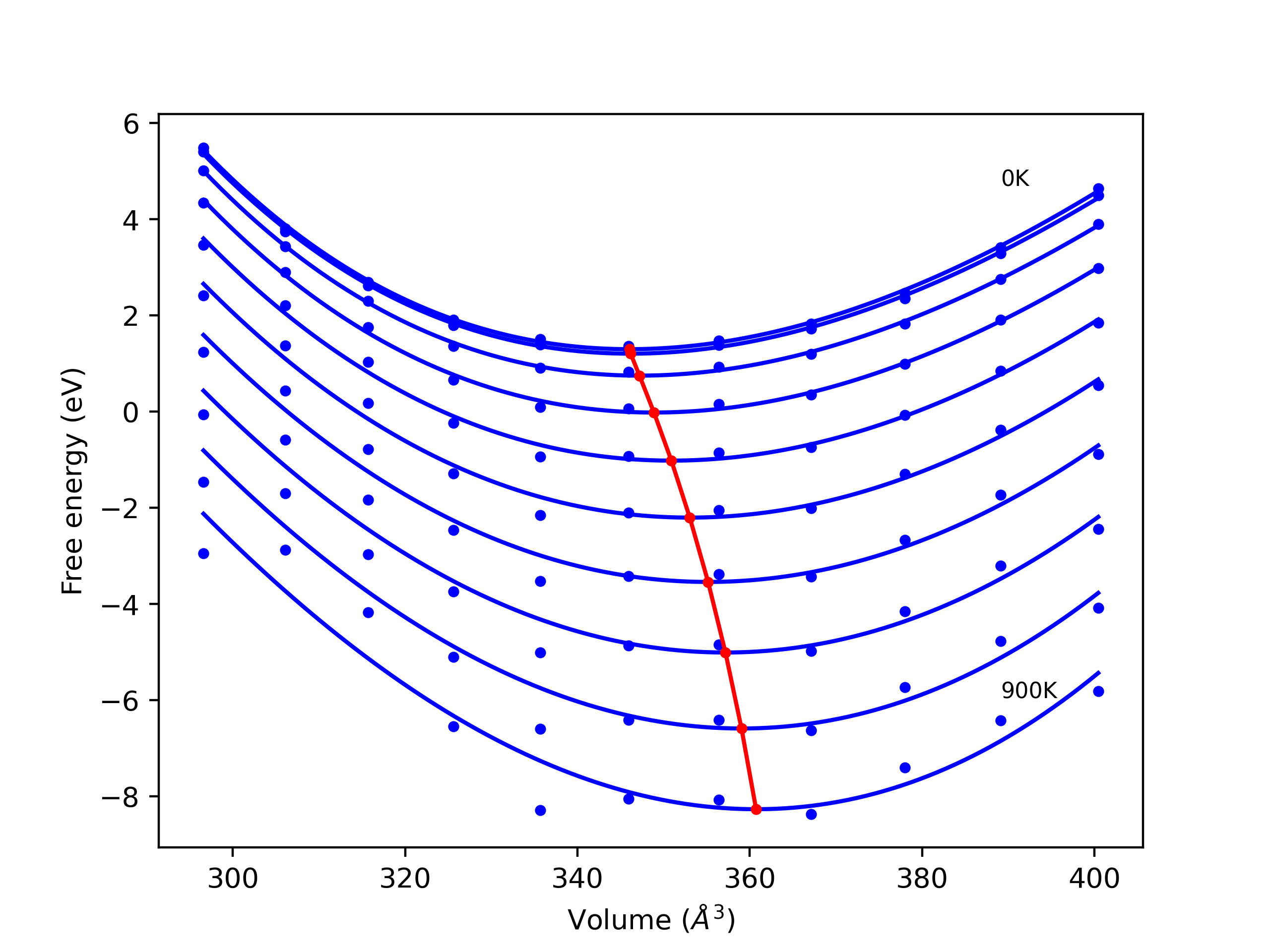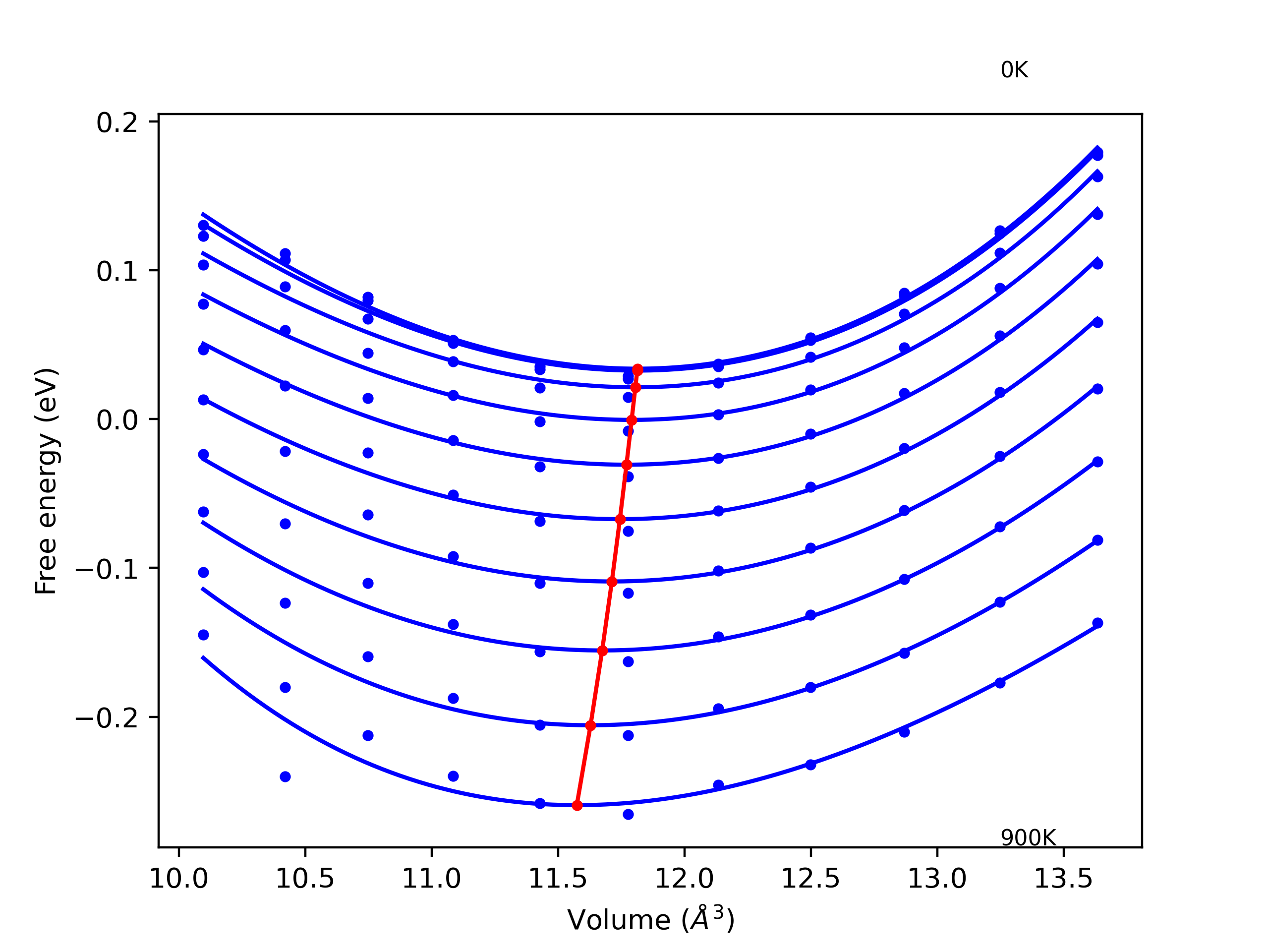 Phonon band structures and crystal properties estimated from quasi-harmonic approximation (QHA) calculations are displayed for select crystals. The calculations were performed using phonopy and LAMMPS. For the phonon calculations, 3x3 supercells of the potential-specific relaxed crystals were used. The QHA calculations were based on 11 strain states ranging from -0.05 to 0.05.