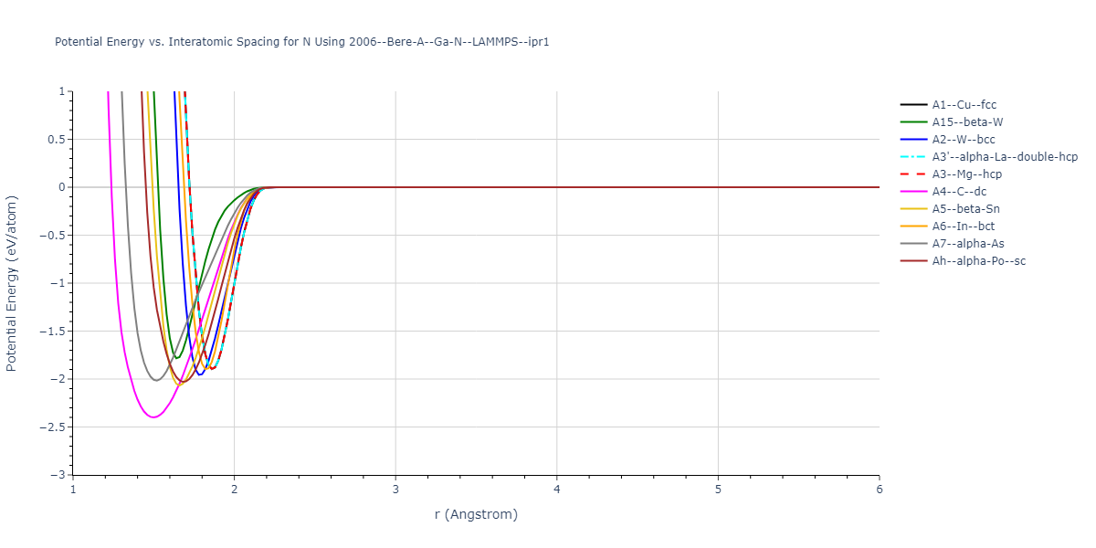 Plots of potential energy vs interatomic spacing, r, are shown below for a number of crystal structures. The structures are generated based on the ideal atomic positions and b/a and c/a lattice parameter ratios for a given crystal prototype. The size of the system is then uniformly scaled, and the energy calculated without relaxing the system. To obtain these plots, values of r are evaluated every 0.02 Å up to 6 Å.
