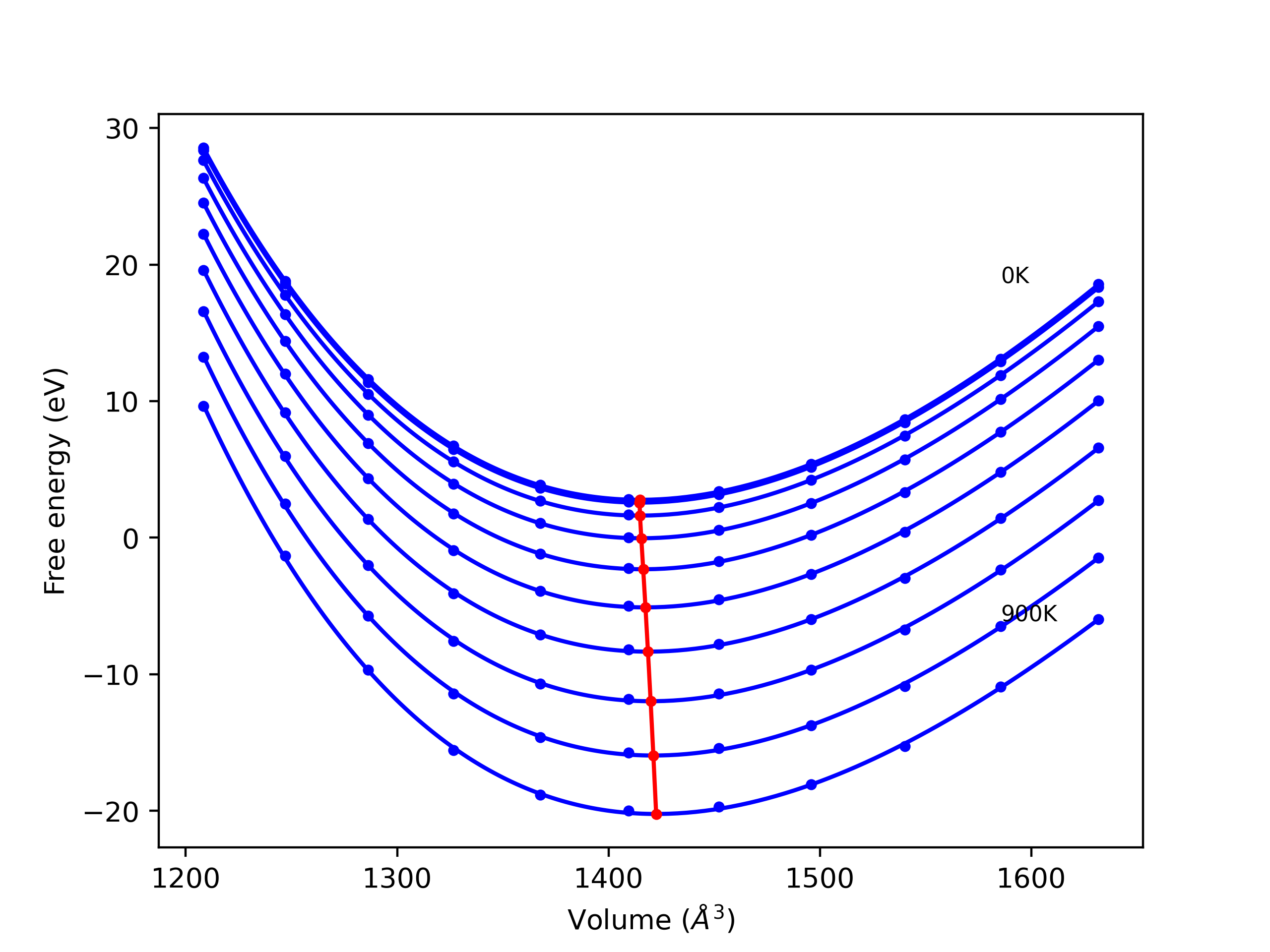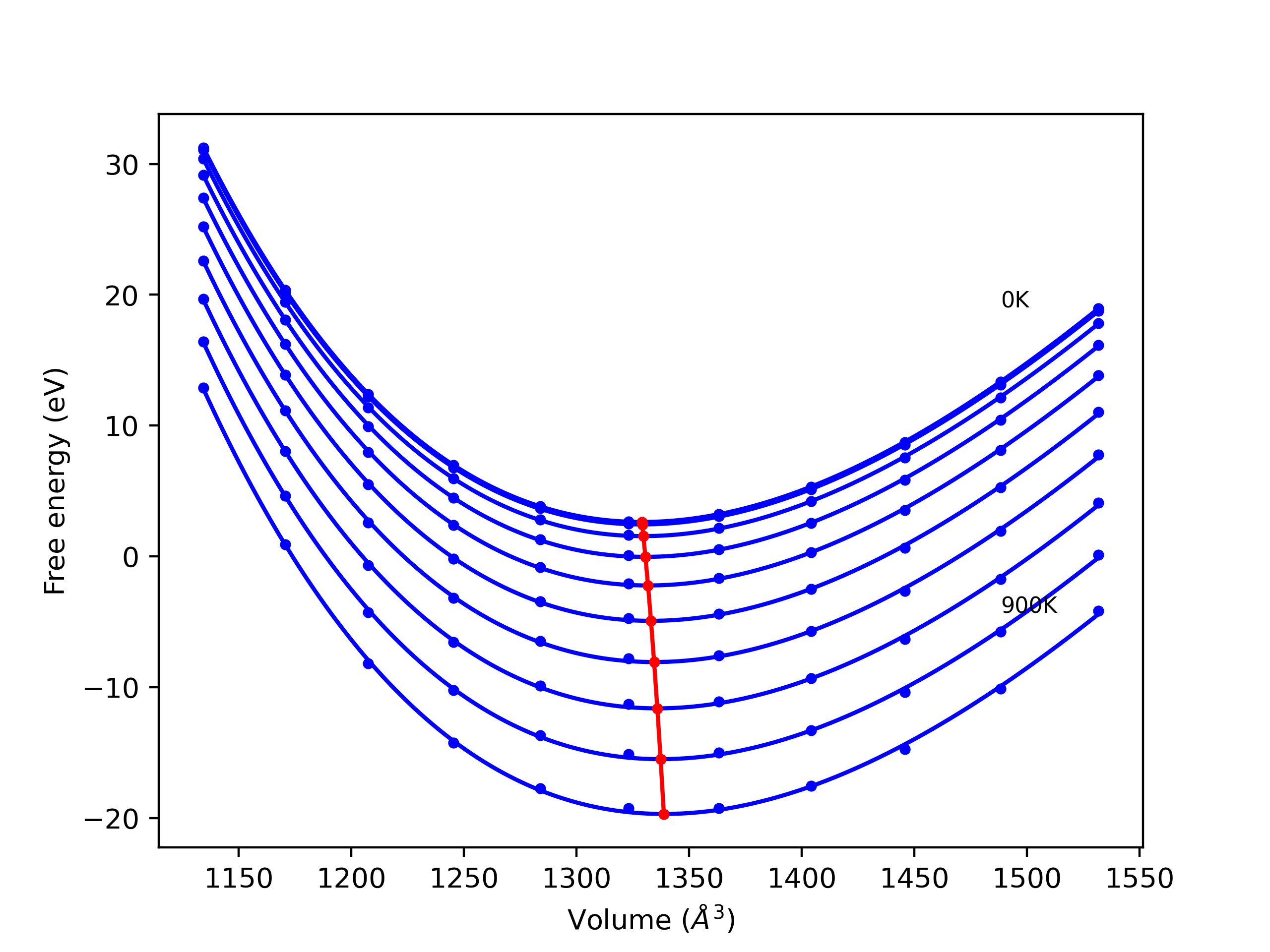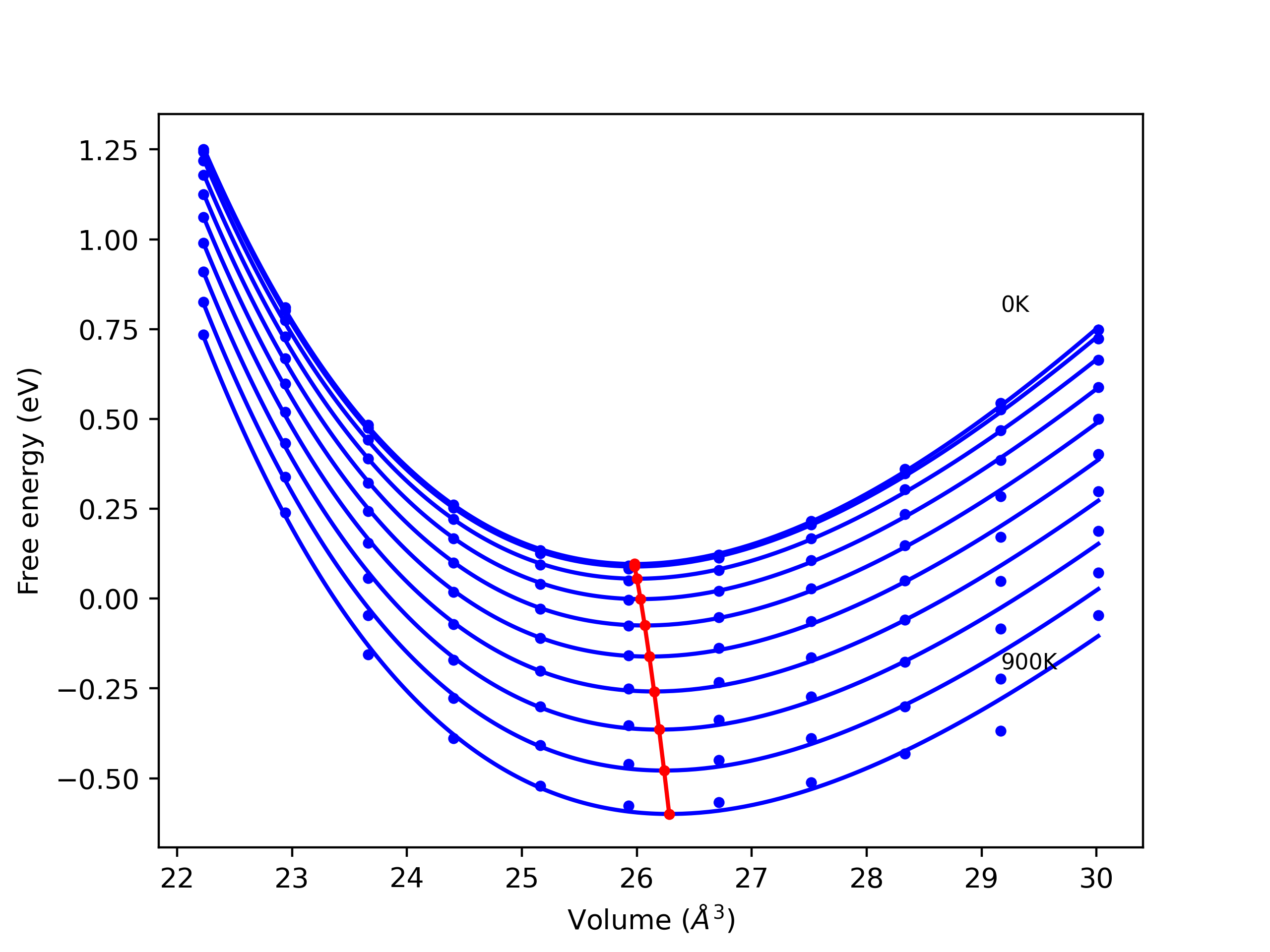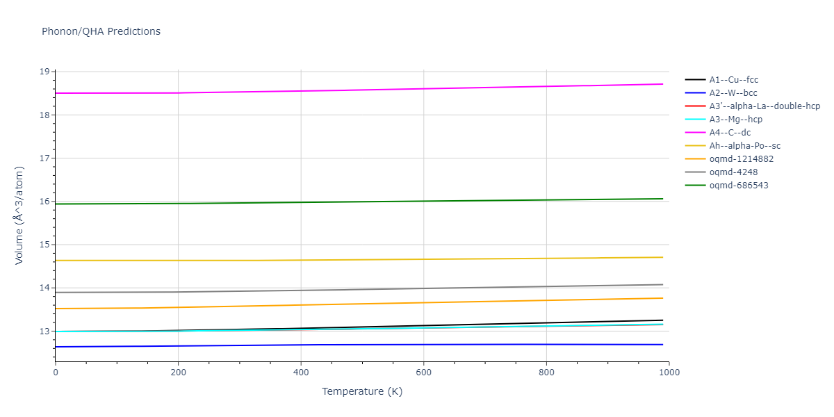 Plots of lattice and elastic constants are shown as a function of temperature. The 0K points were taken from the Crystal Structure Predictions and the Elastic Constants Predictions sections above for the unique crystal structures relaxed with the "dynamic" method. Starting from the 0 K relaxed crystal unit cells, supercell systems are created by replicating all three dimensions by the same multiplier to achieve at least 4000 atoms. The systems are then relaxed at 50 K and zero pressure using 1 million NPT steps. Lattice constants are estimated by averaging the measured box dimensions. Temperatures are iteratively increased by 50 K, with each subsequent relaxation calculation starting from the final atomic configuration at the previous temperature and relaxing for another 1 million steps.