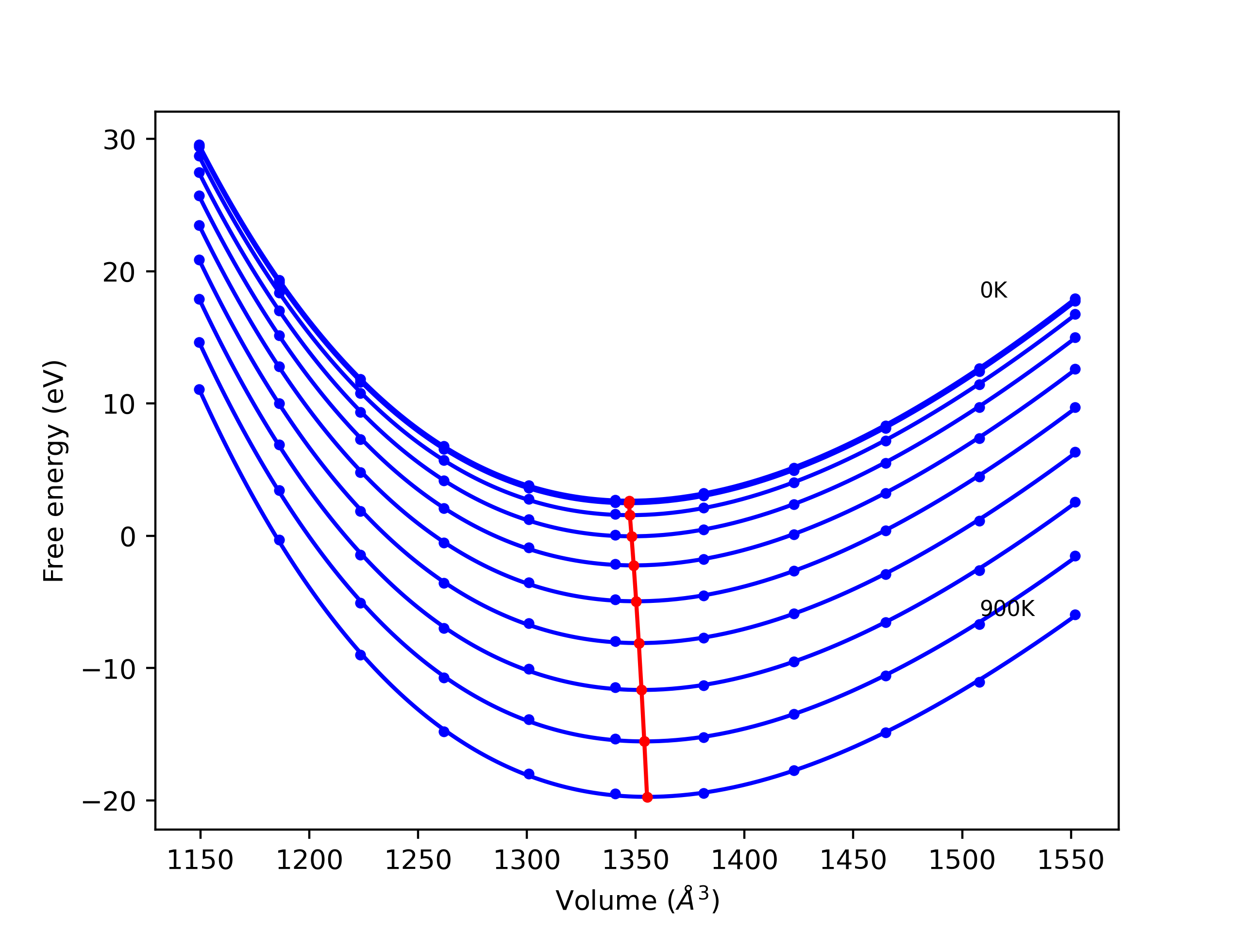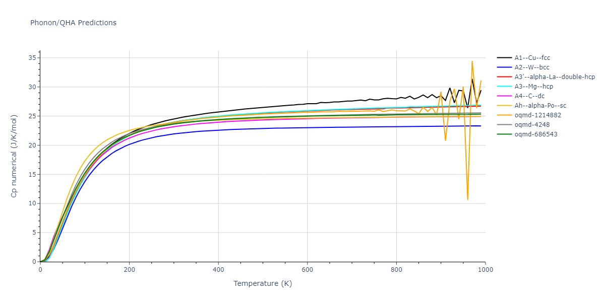 Plots of internal energy, Gibbs free energy, entropy, heat capacity and volume are shown here as a function of temperature for various crystal structures and liquid phases. The included crystal structures correspond to those in the Solid Structures vs. Temperature section, and the liquid phases to those in the Liquid Properties section. Internal energy and volume are taken from the associated structure relaxations mentioned in those previous sections. Constant pressure heat capacity is estimated using 3-point numerical derivatives of enthalpy versus temperature. Note that since all simulations done here are at 0 pressure, internal energy and enthalpy are equivalent.