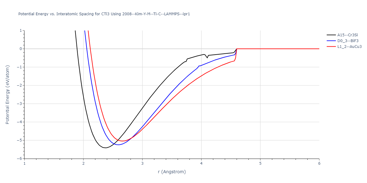 Plots of potential energy vs interatomic spacing, r, are shown below for a number of crystal structures. The structures are generated based on the ideal atomic positions and b/a and c/a lattice parameter ratios for a given crystal prototype. The size of the system is then uniformly scaled, and the energy calculated without relaxing the system. To obtain these plots, values of r are evaluated every 0.02 Å up to 6 Å.