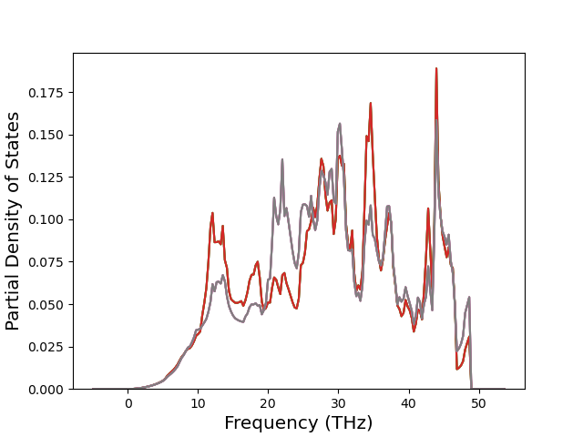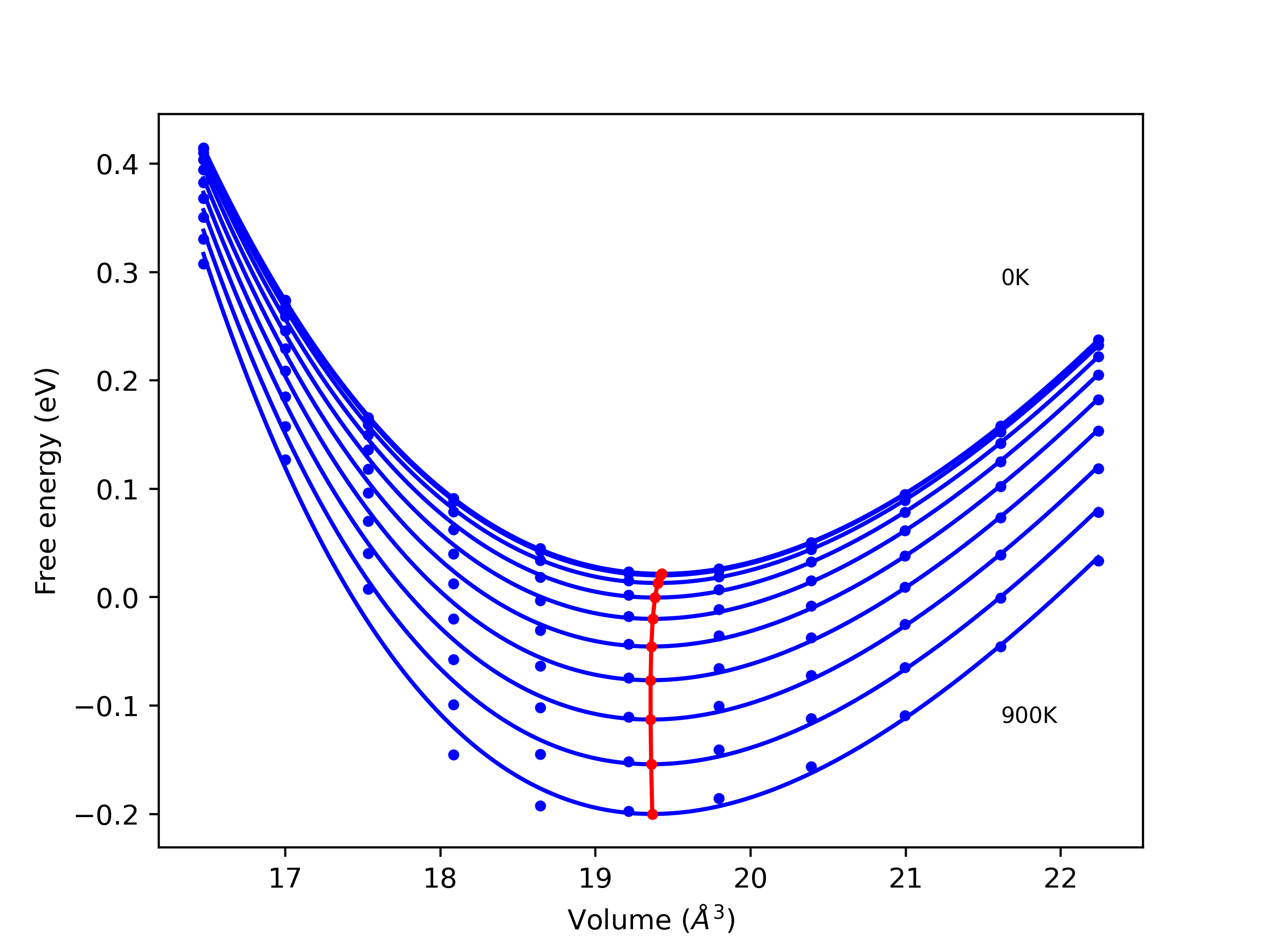 The Gibbs energies of the phases are estimated using thermodynamic integration between the interatomic potential in question and a simpler model with known Gibbs free energy values. For solids, the reference model is an Einstein solid, while for liquids it is the Uhlenbeck-Ford potential. Besides a short run at the start of the solid calculations to estimate Einstein model spring constants, the two calculations proceed similarly. Starting with the final relaxation configurations, the systems are stabilized for 25,000 steps. Then, over the next 50,000 steps the potential is swapped out for the reference potential. The system is then stabilized for another 25,000 steps with the reference model before a reverse swap of 50,000 steps is performed. The simulation ends with one final 25,000 step stabilization period. From the simulation, the irreversible work of transformation is estimated and used to compute the absolute Gibbs free energy of the target phase and potential relative to the reference potential. Entropy is estimated as the difference in enthalpy and Gibbs free energy and divided by temperature.