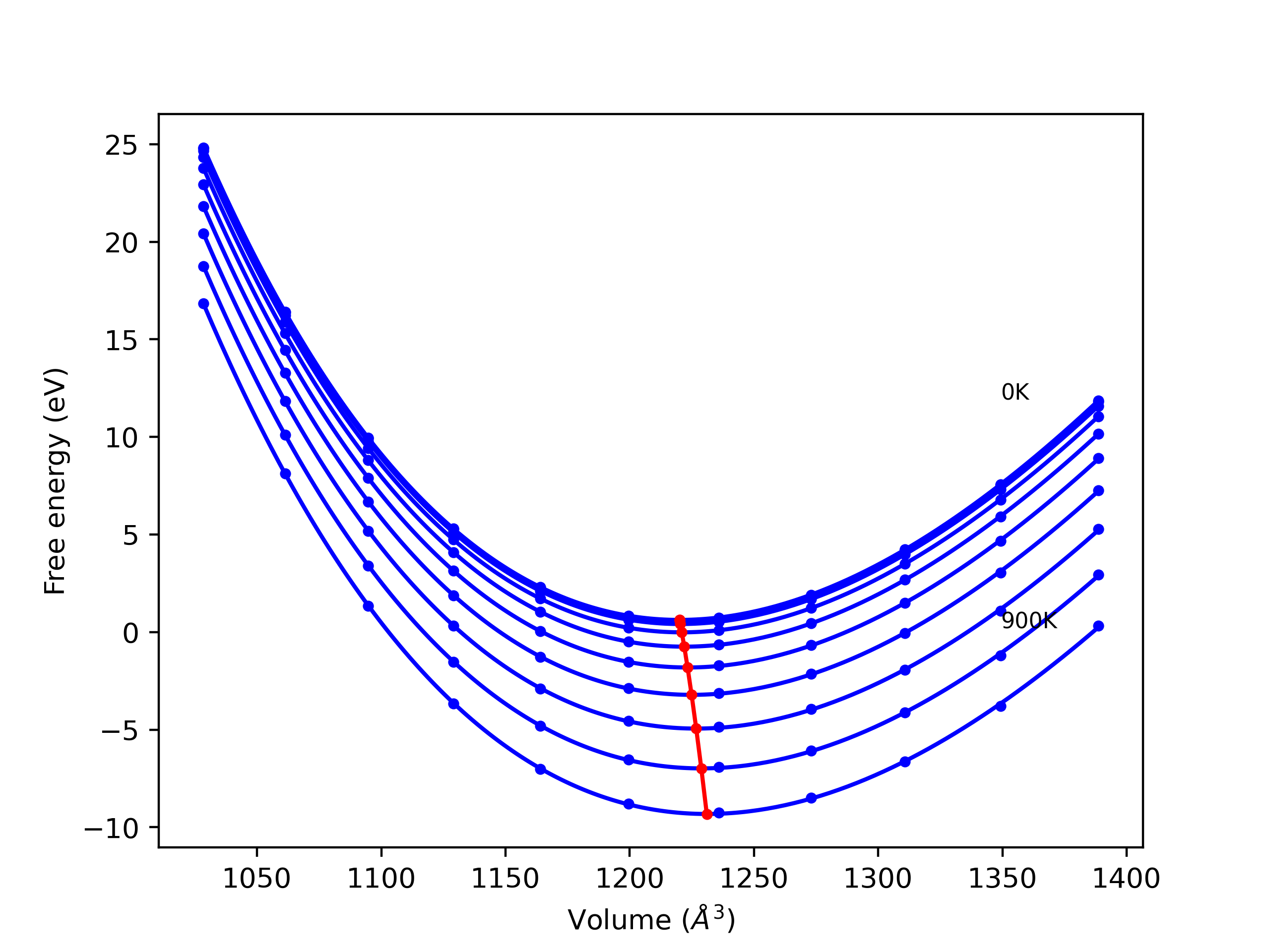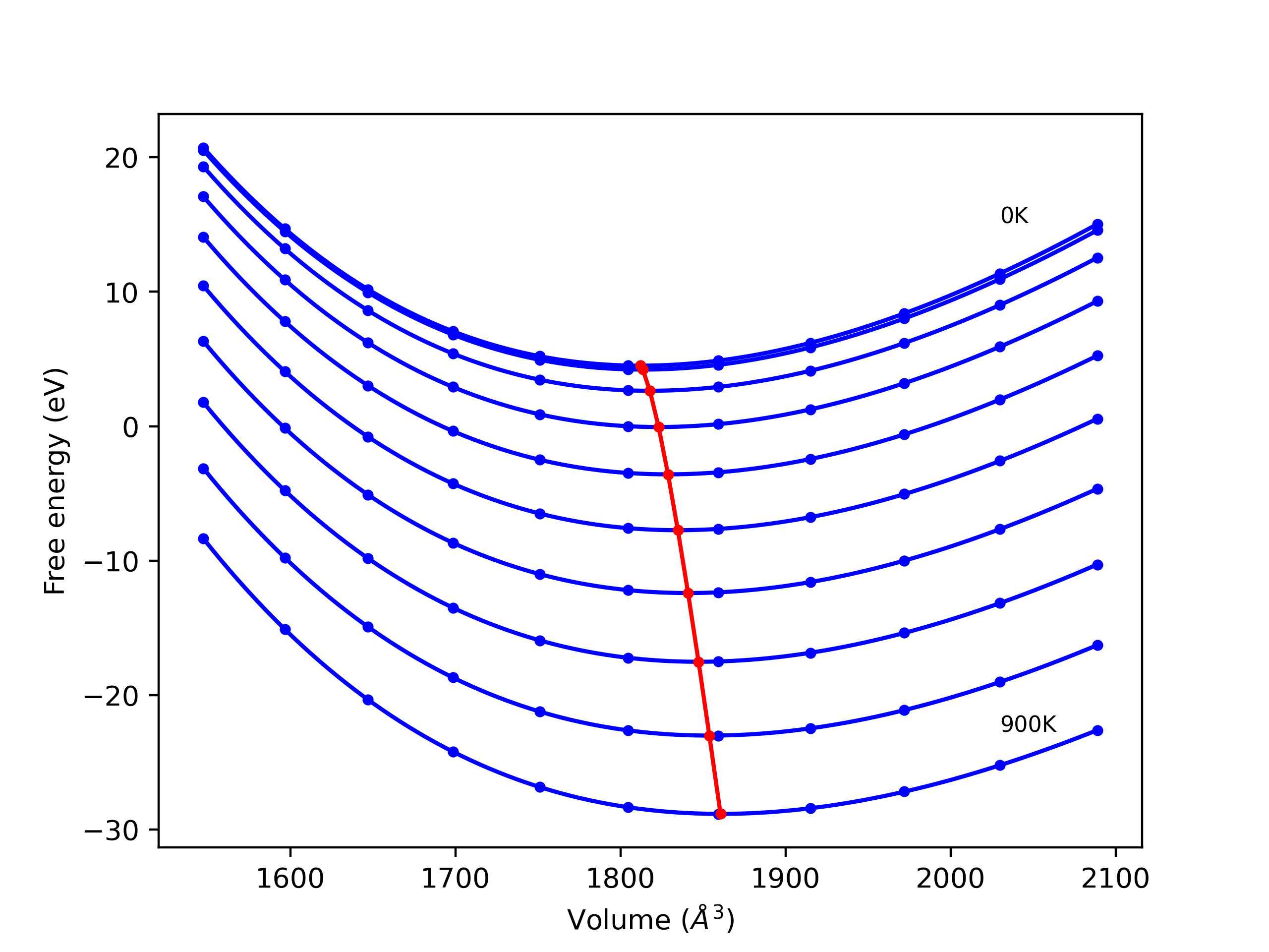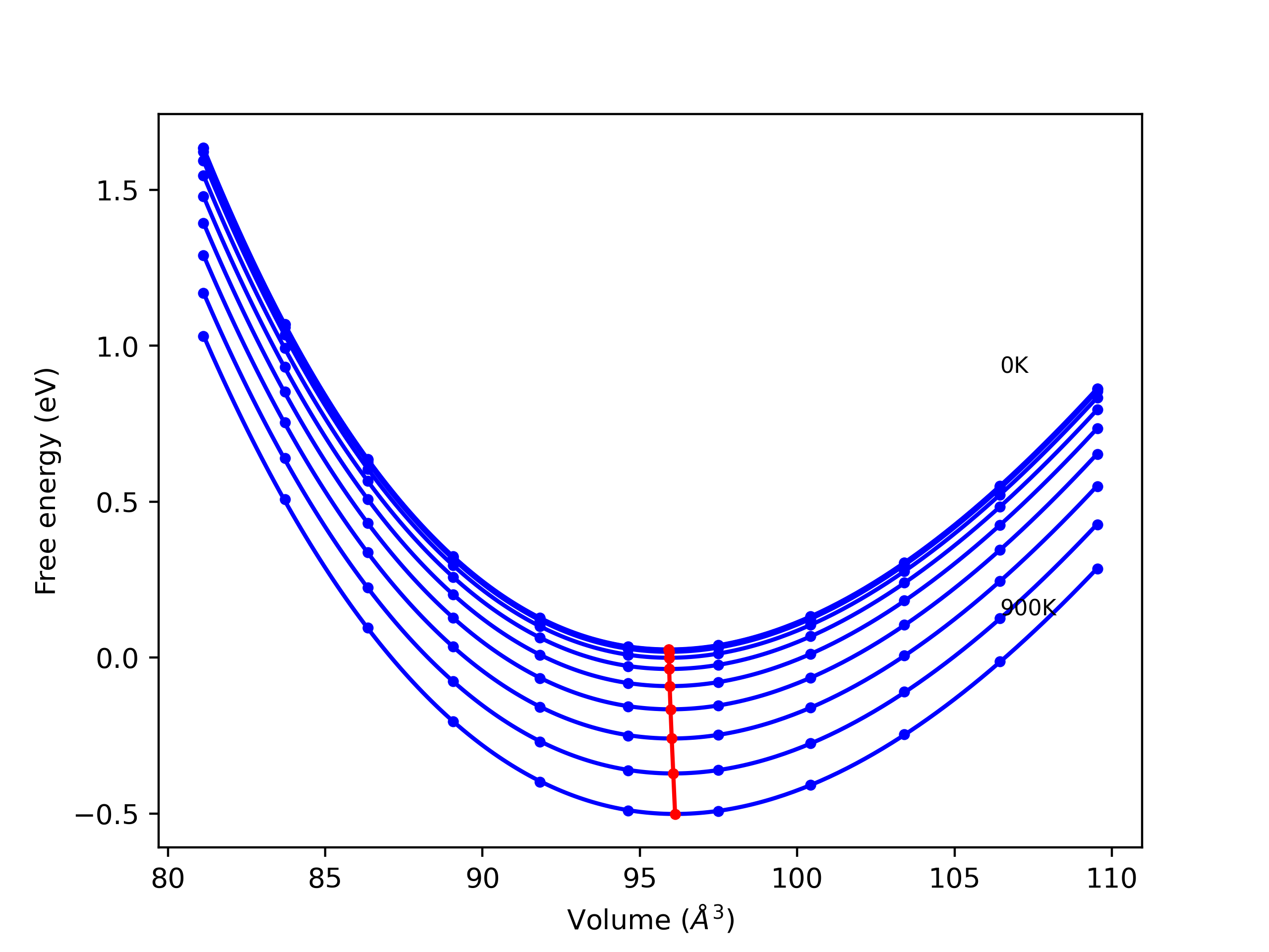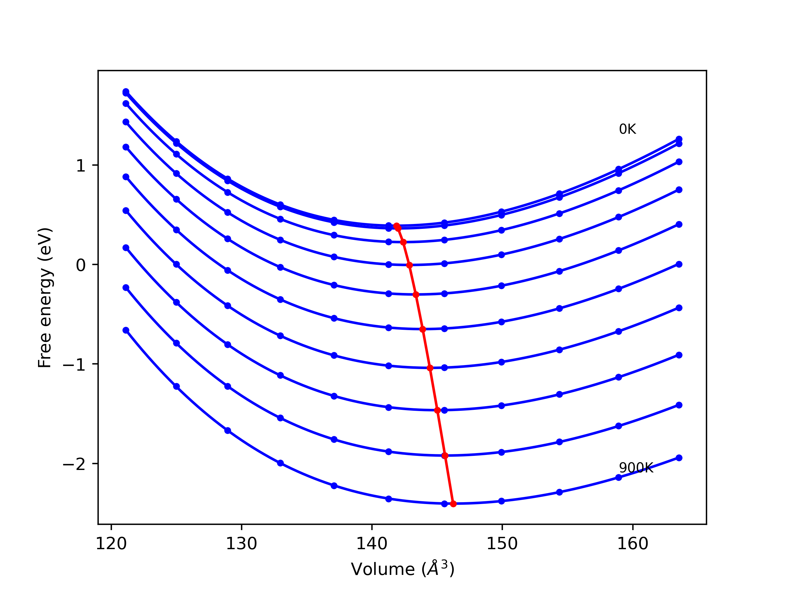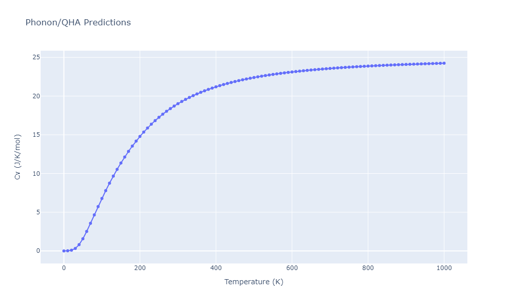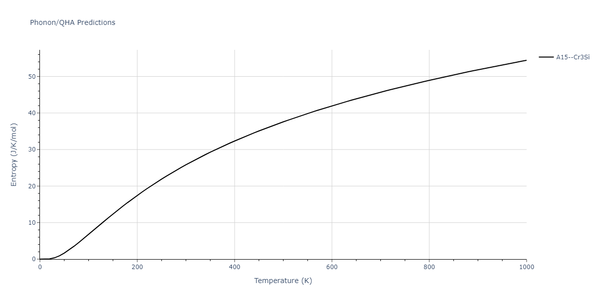Plots of internal energy, Gibbs free energy, entropy, heat capacity and volume are shown here as a function of temperature for various crystal structures and liquid phases. The included crystal structures correspond to those in the Solid Structures vs. Temperature section, and the liquid phases to those in the Liquid Properties section. Internal energy and volume are taken from the associated structure relaxations mentioned in those previous sections. Constant pressure heat capacity is estimated using 3-point numerical derivatives of enthalpy versus temperature. Note that since all simulations done here are at 0 pressure, internal energy and enthalpy are equivalent.