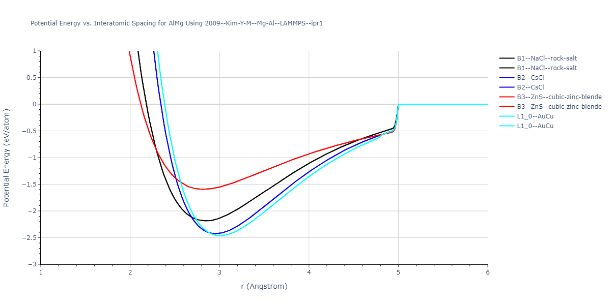 Plots of potential energy vs interatomic spacing, r, are shown below for a number of crystal structures. The structures are generated based on the ideal atomic positions and b/a and c/a lattice parameter ratios for a given crystal prototype. The size of the system is then uniformly scaled, and the energy calculated without relaxing the system. To obtain these plots, values of r are evaluated every 0.02 Å up to 6 Å.