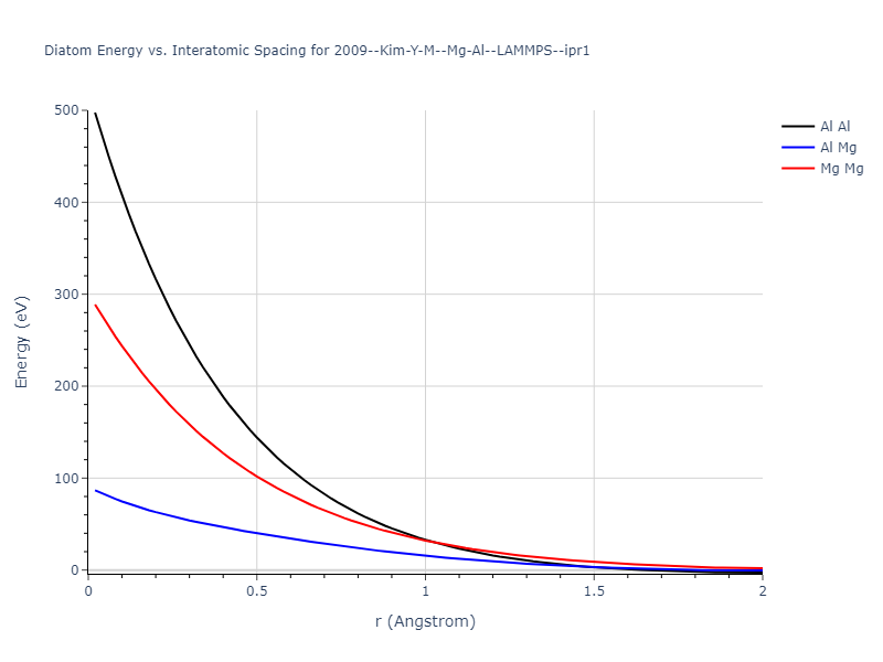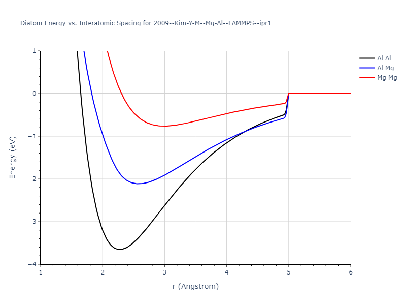 Plots of the potential energy vs interatomic spacing, r, are shown below for all diatom sets associated with the interatomic potential. This calculation provides insights into the functional form of the potential's two-body interactions. A system consisting of only two atoms is created, and the potential energy is evaluated for the atoms separated by 0.02 Å <= r <= 6.0> Å in intervals of 0.02 Å. Two plots are shown: one for the "standard" interaction distance range, and one for small values of r. The small r plot is useful for determining whether the potential is suitable for radiation studies.