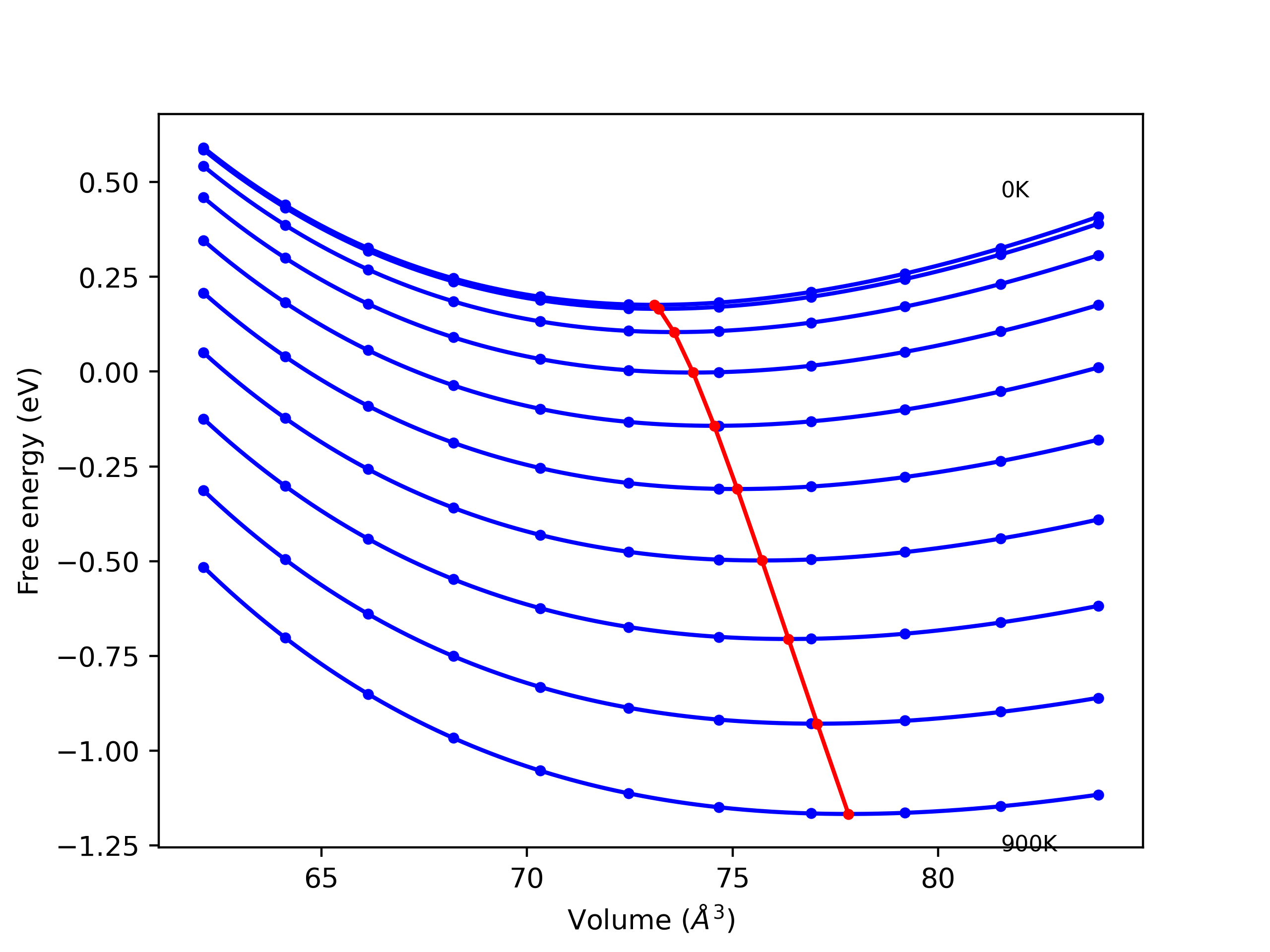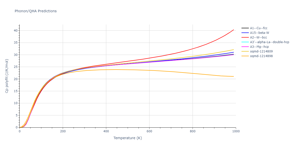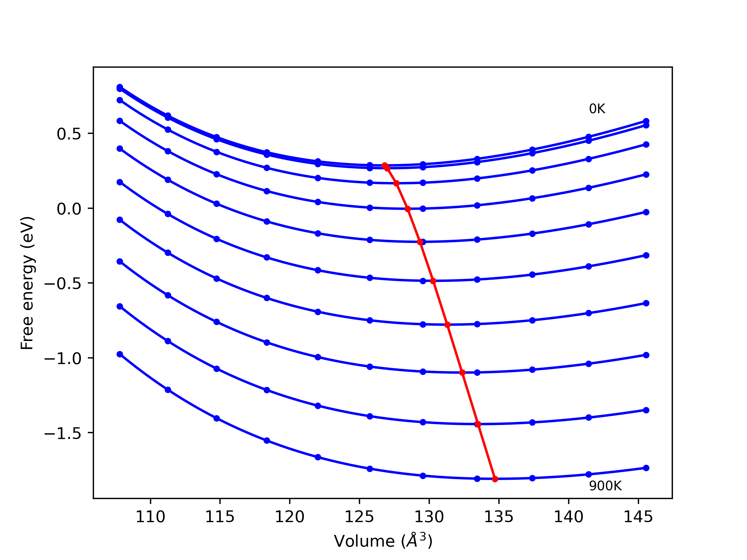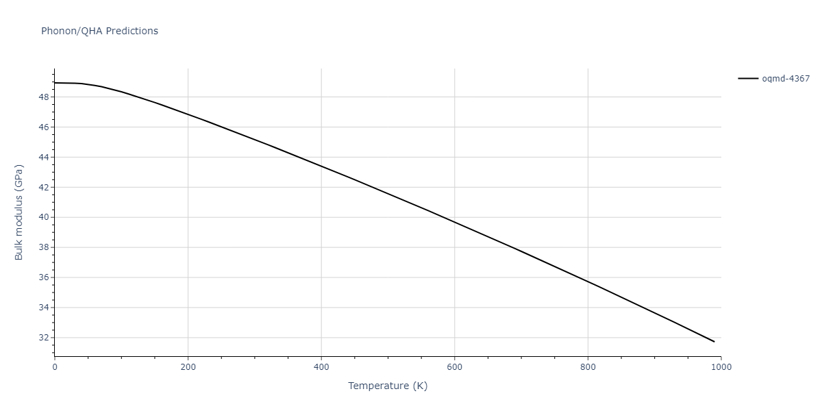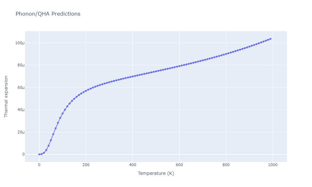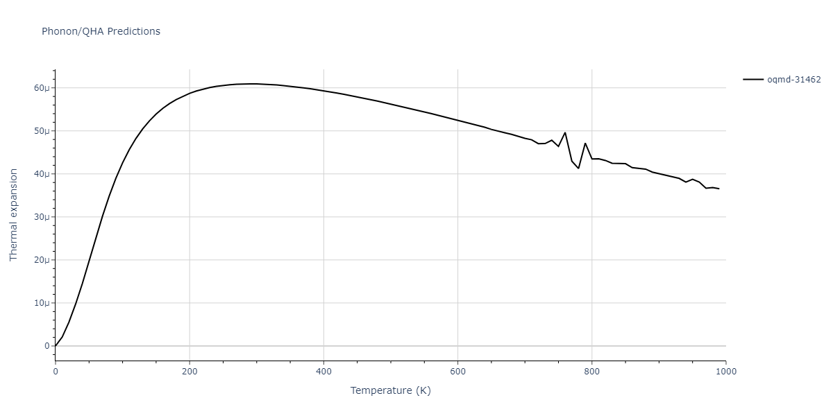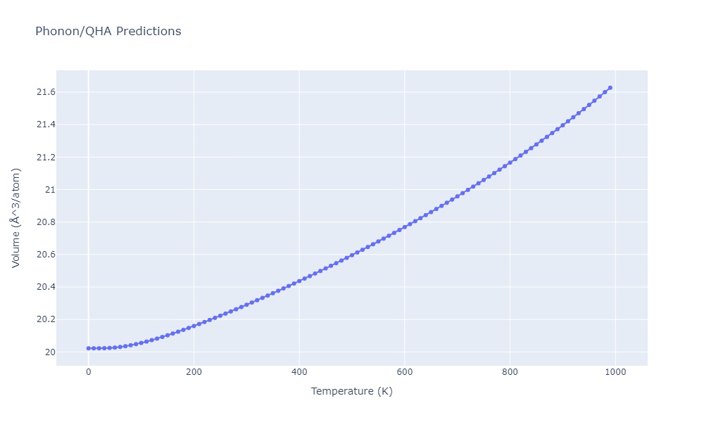 Phonon band structures and crystal properties estimated from quasi-harmonic approximation (QHA) calculations are displayed for select crystals. The calculations were performed using phonopy and LAMMPS. For the phonon calculations, 3x3 supercells of the potential-specific relaxed crystals were used. The QHA calculations were based on 11 strain states ranging from -0.05 to 0.05.