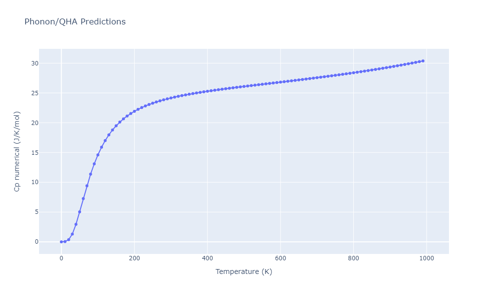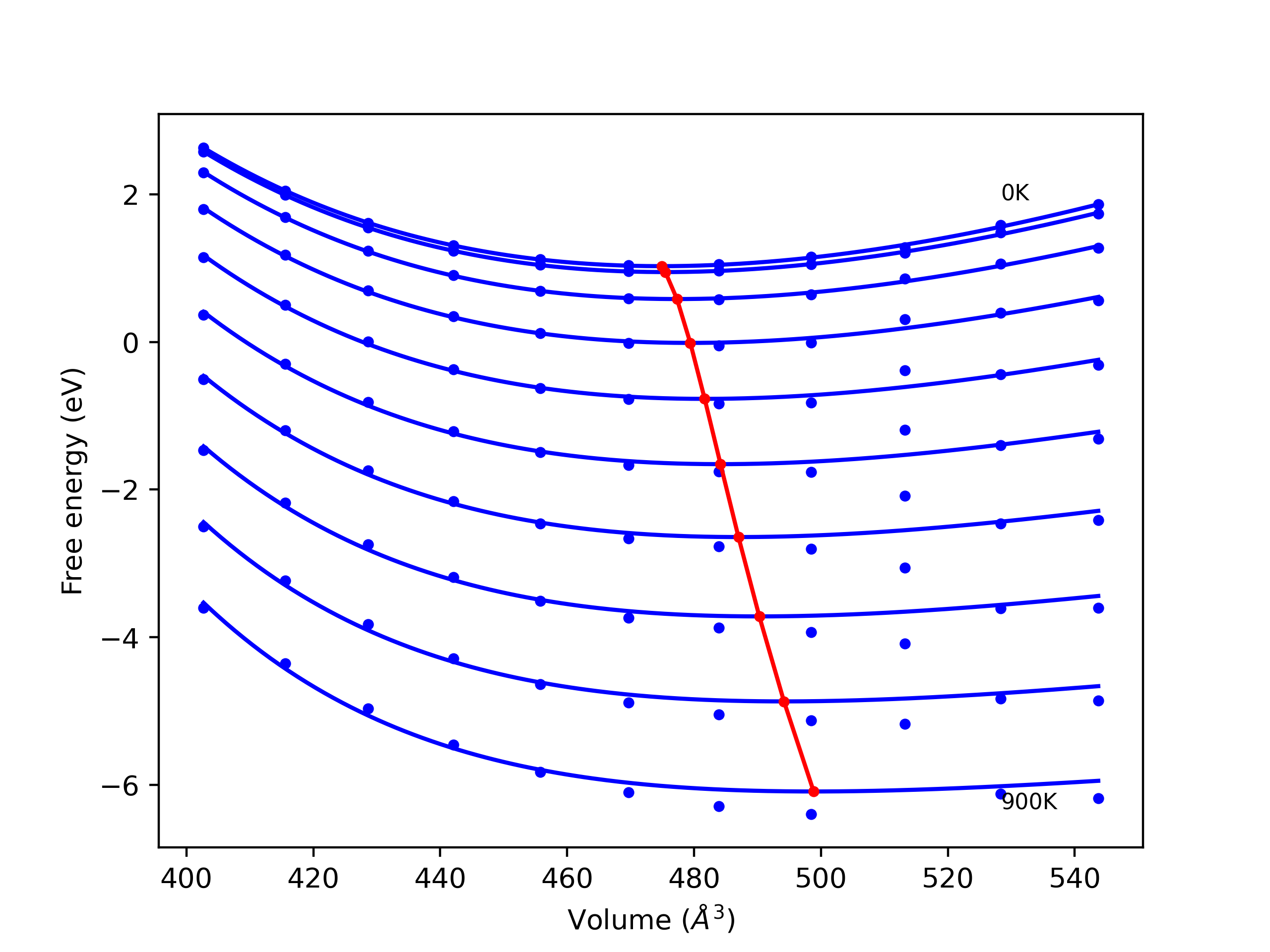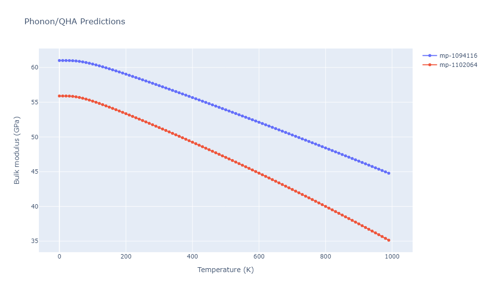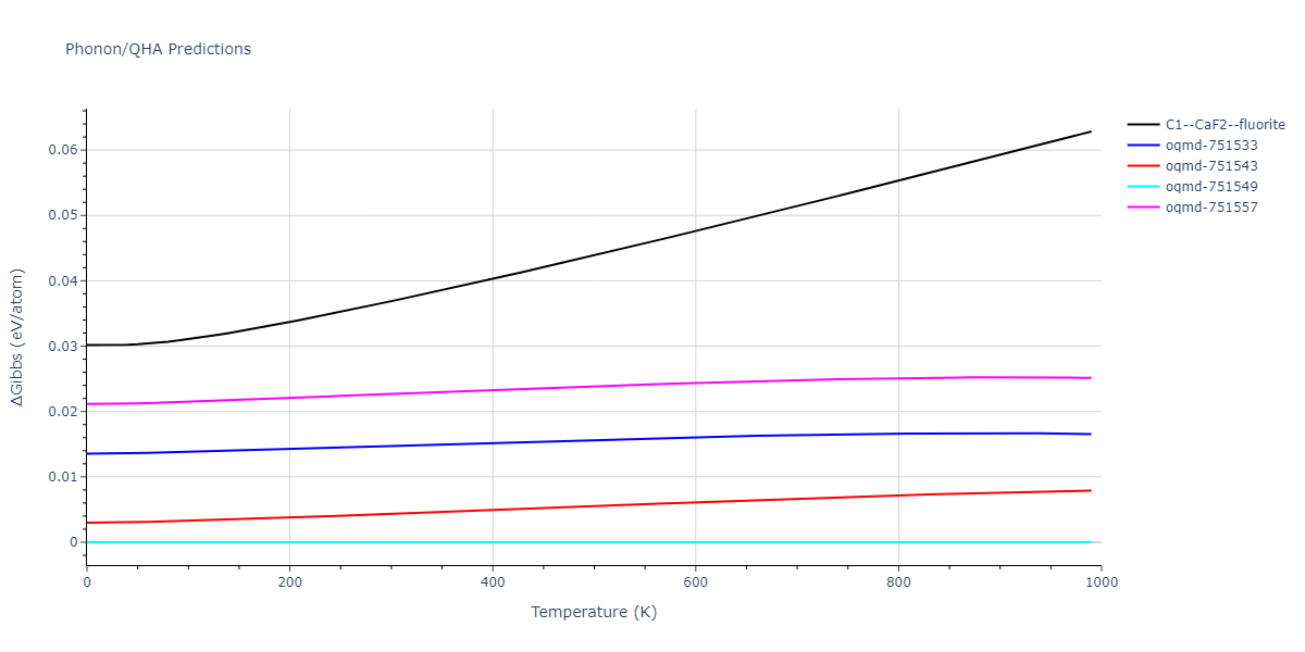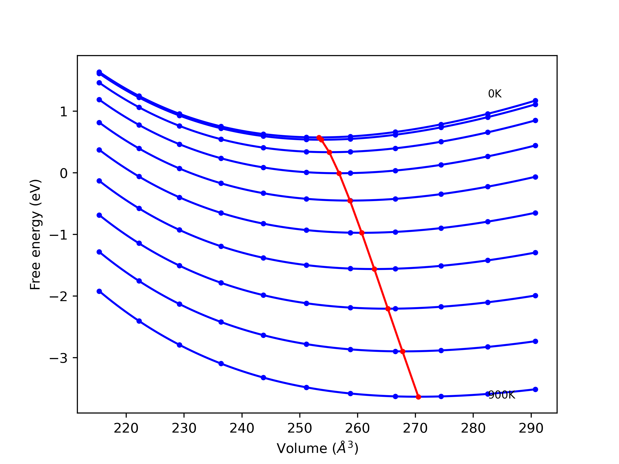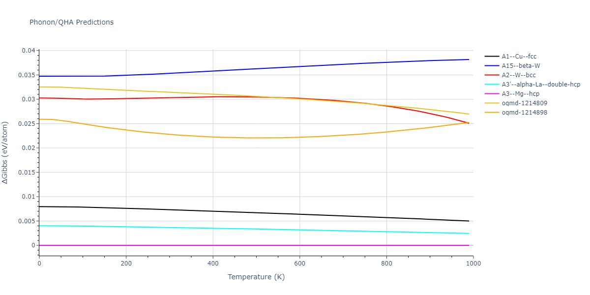 Phonon band structures and crystal properties estimated from quasi-harmonic approximation (QHA) calculations are displayed for select crystals. The calculations were performed using phonopy and LAMMPS. For the phonon calculations, 3x3 supercells of the potential-specific relaxed crystals were used. The QHA calculations were based on 11 strain states ranging from -0.05 to 0.05.